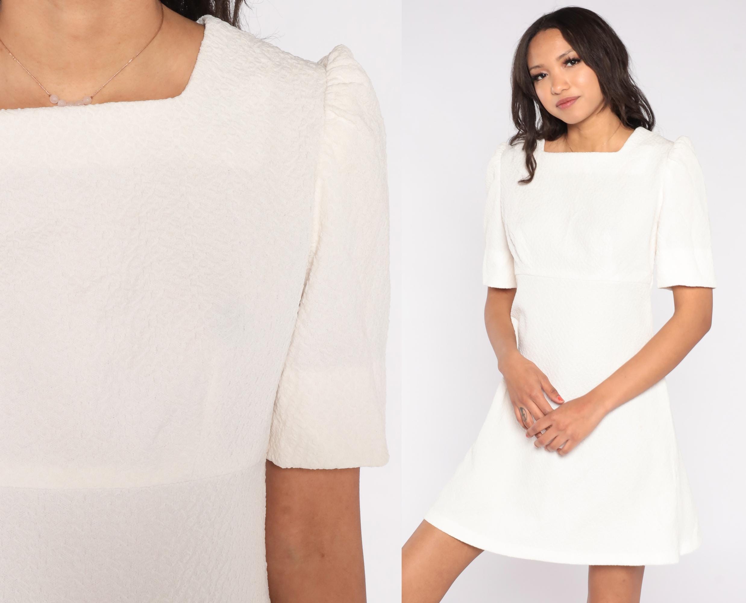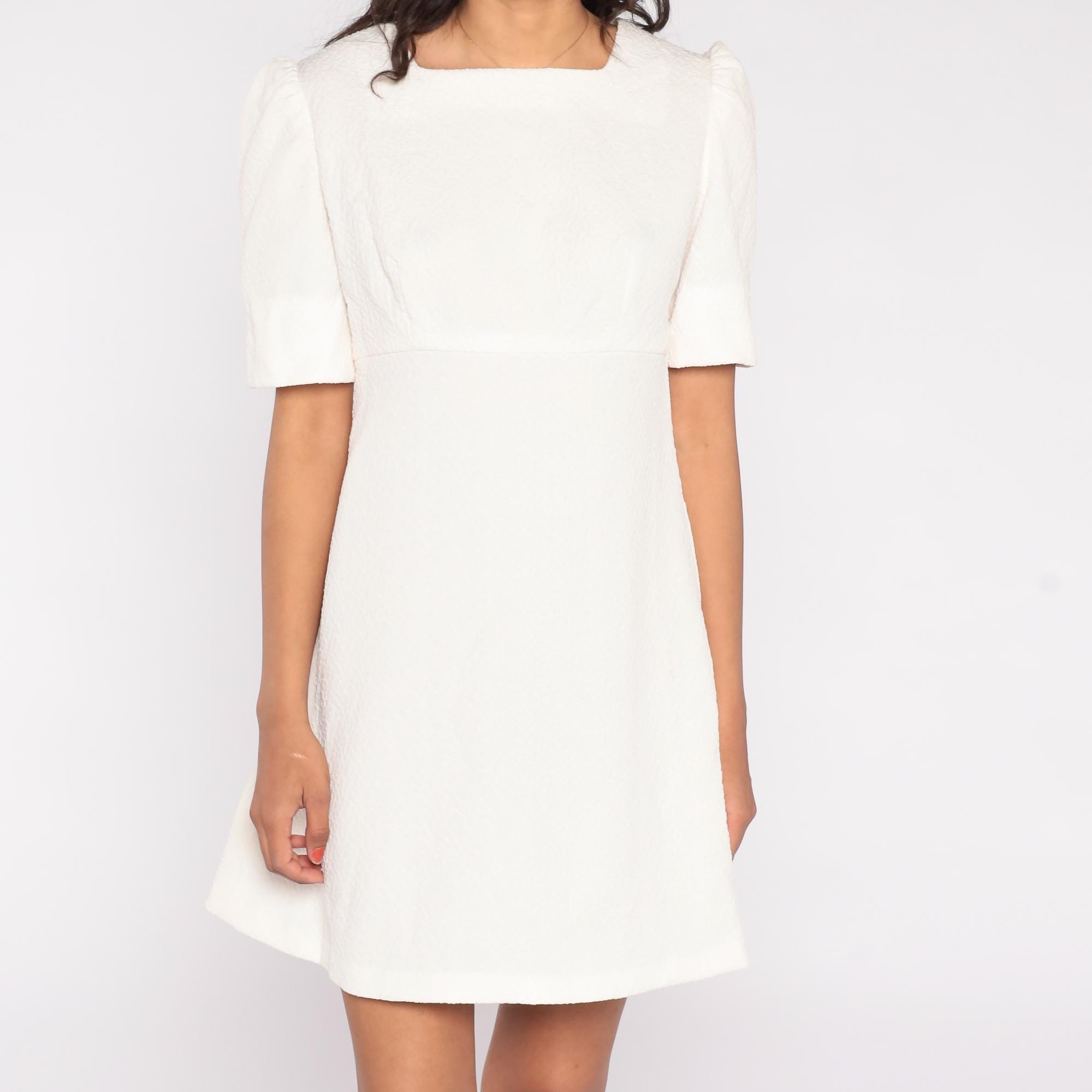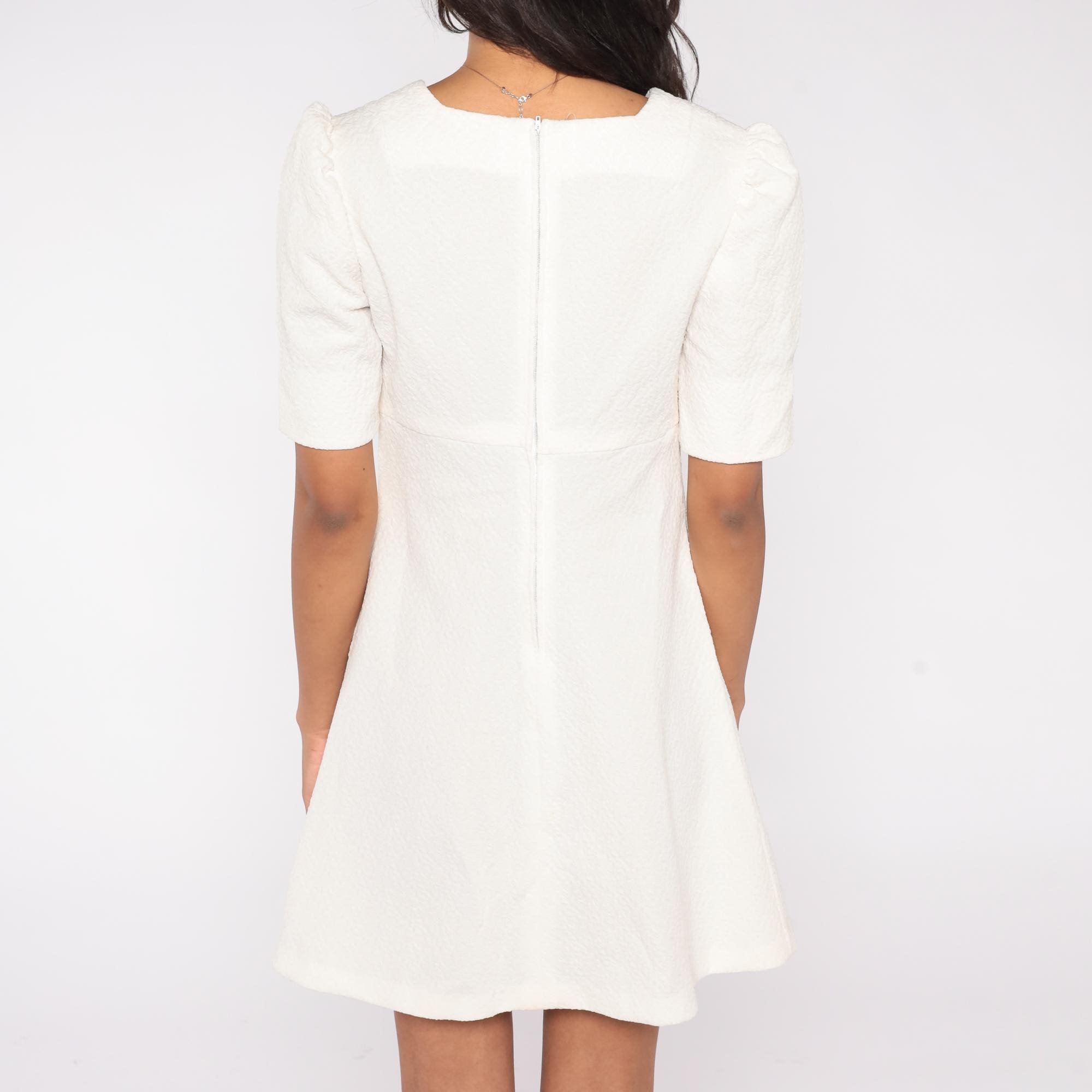 60s white mini dress. Includes charming puff sleeves and a flattering square neckline. The empire waist design flows into an A-line skirt that hits at a classic mini length. The dress closes with a back zipper for a seamless look.