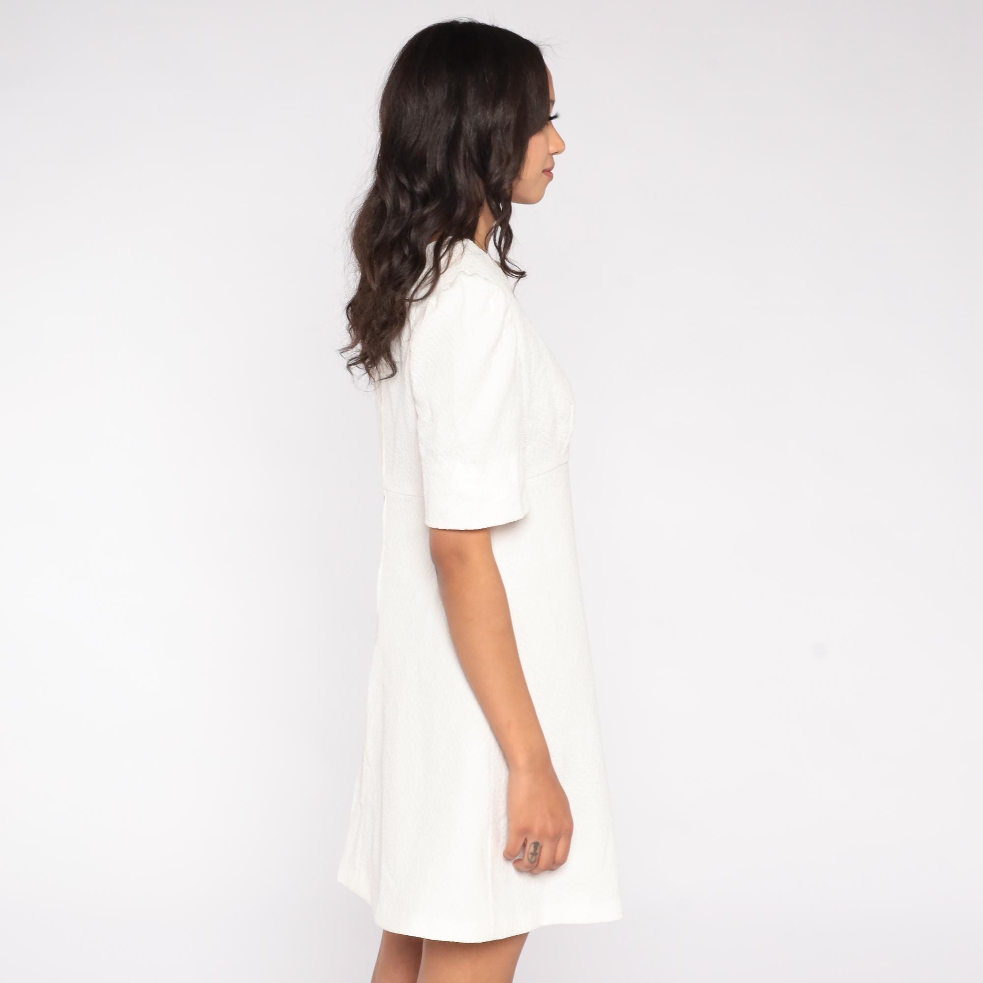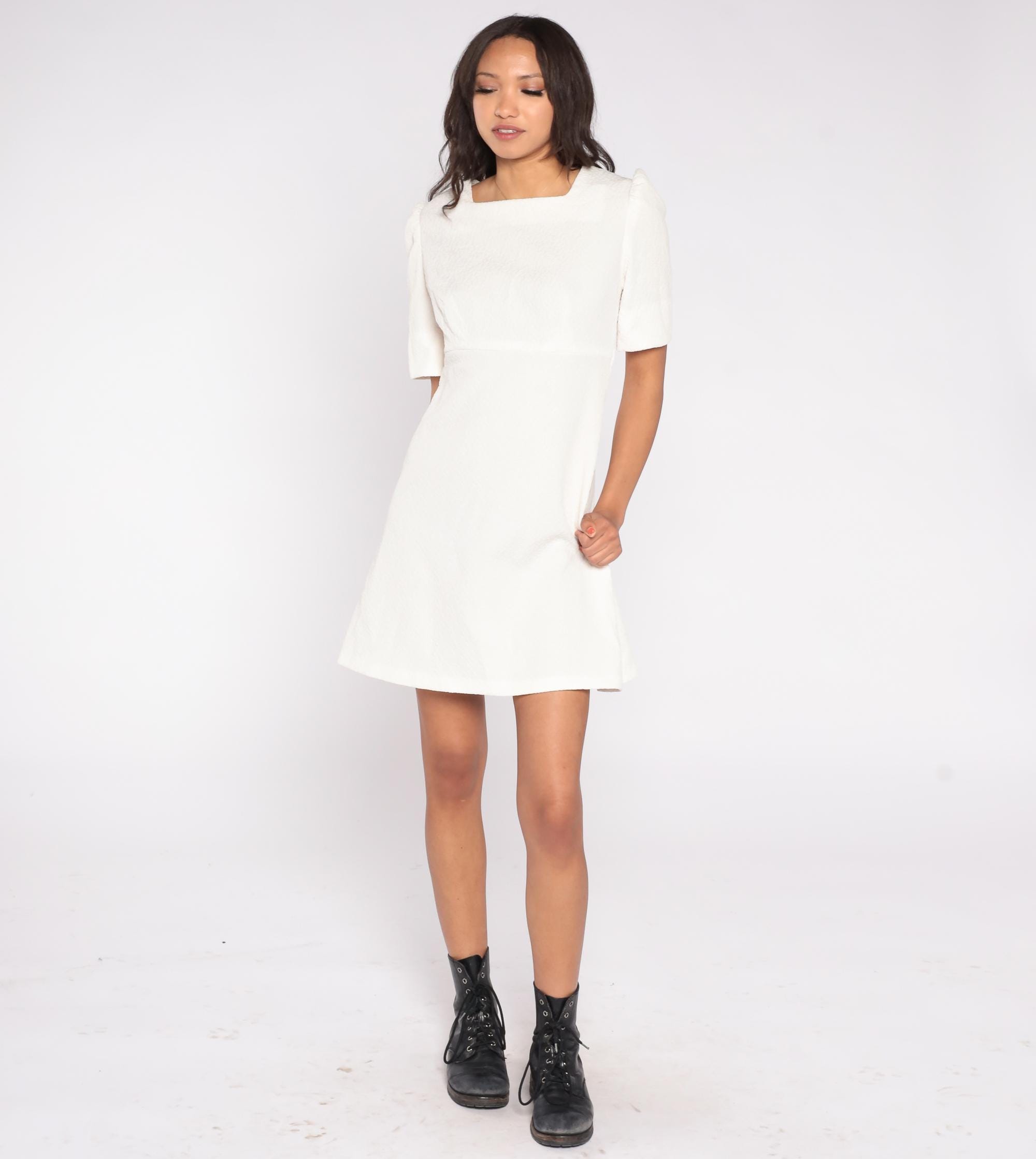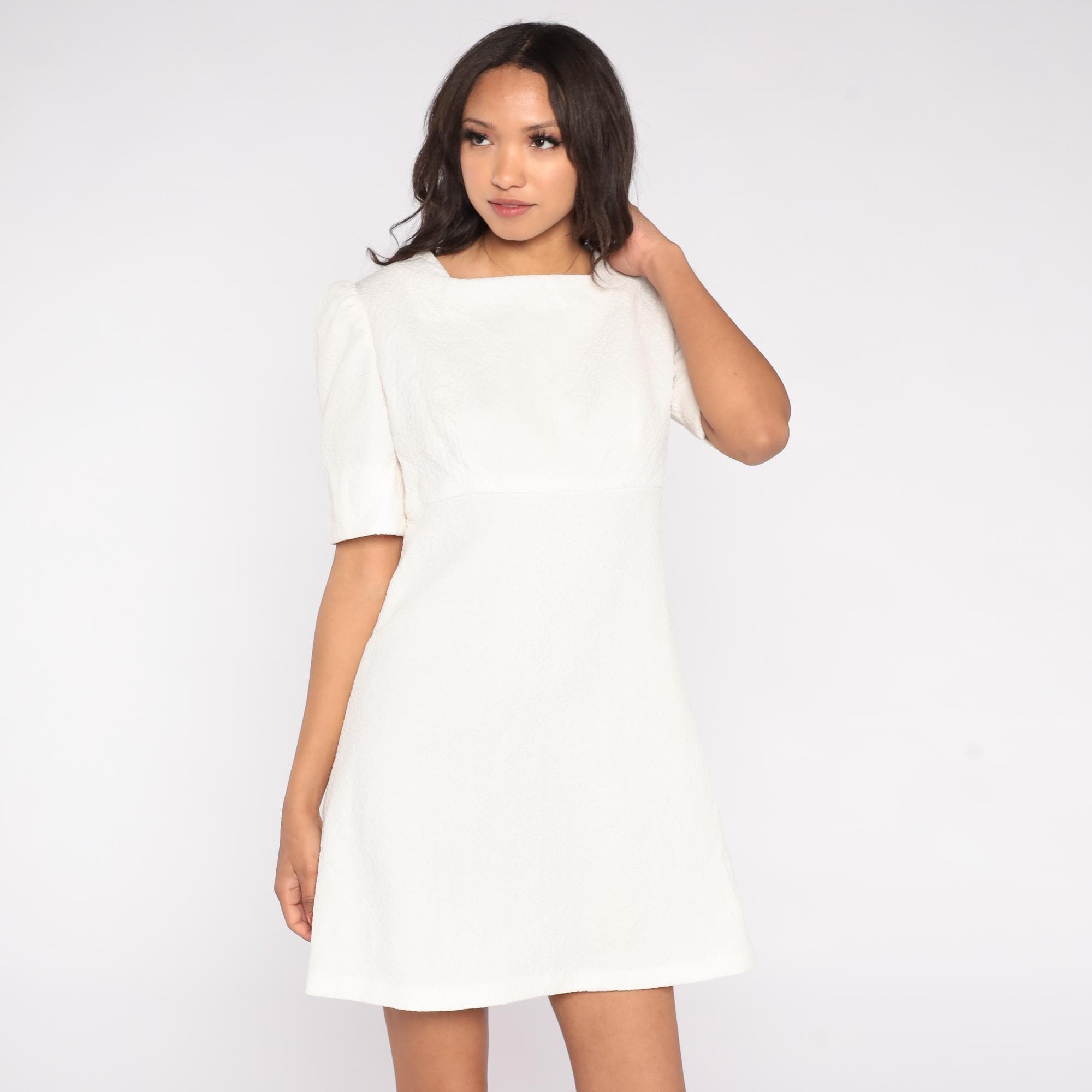 60s white mini dress. Includes charming puff sleeves and a flattering square neckline. The empire waist design flows into an A-line skirt that hits at a classic mini length. The dress closes with a back zipper for a seamless look.