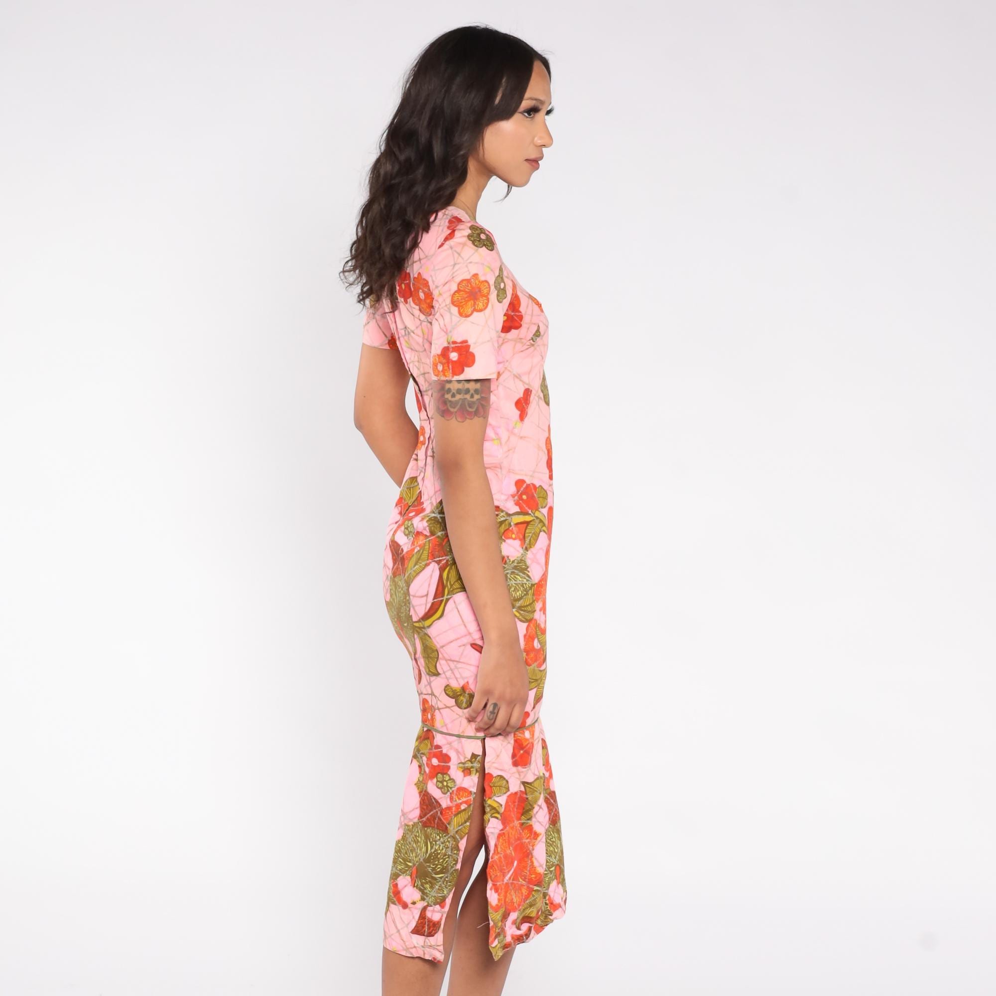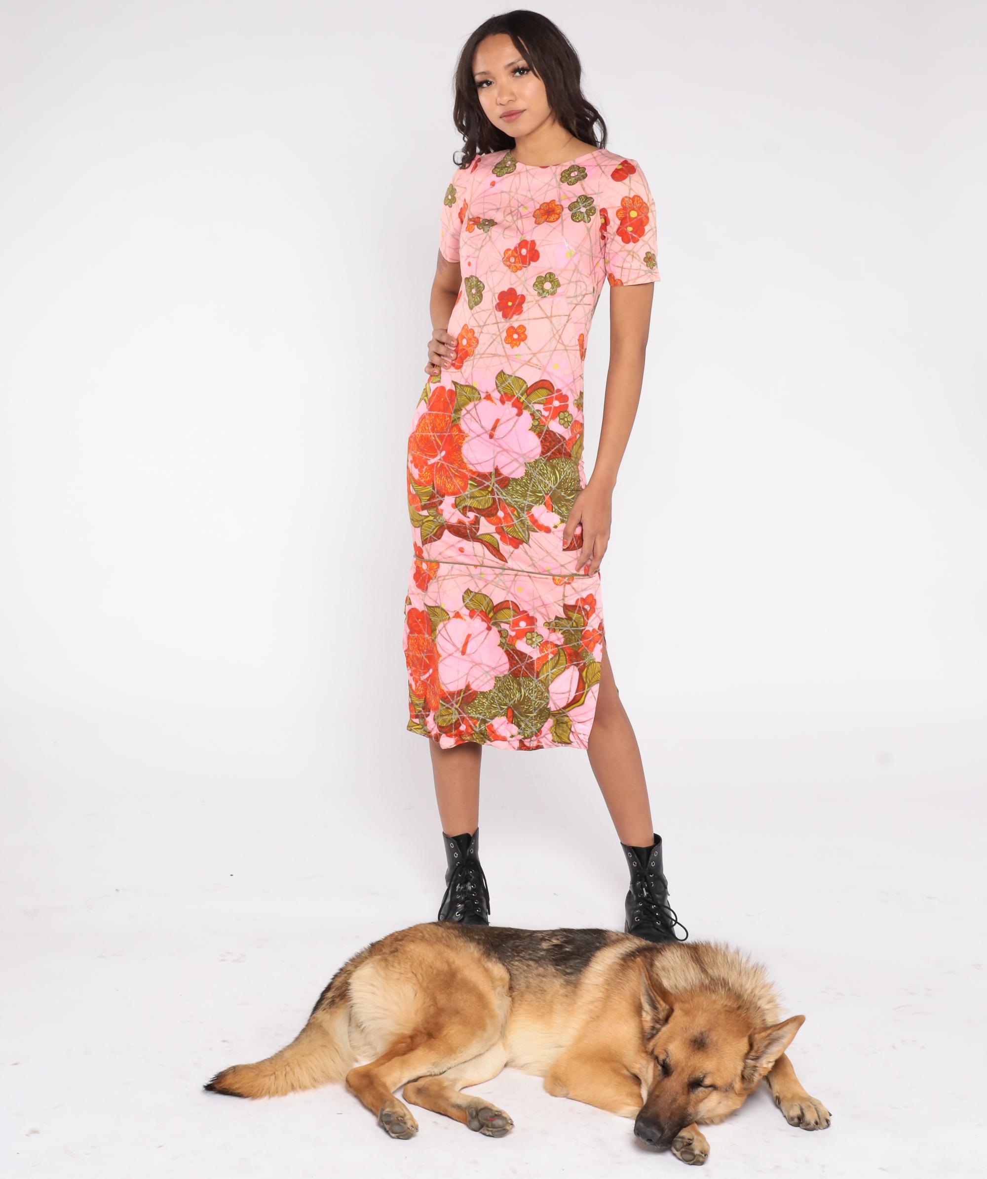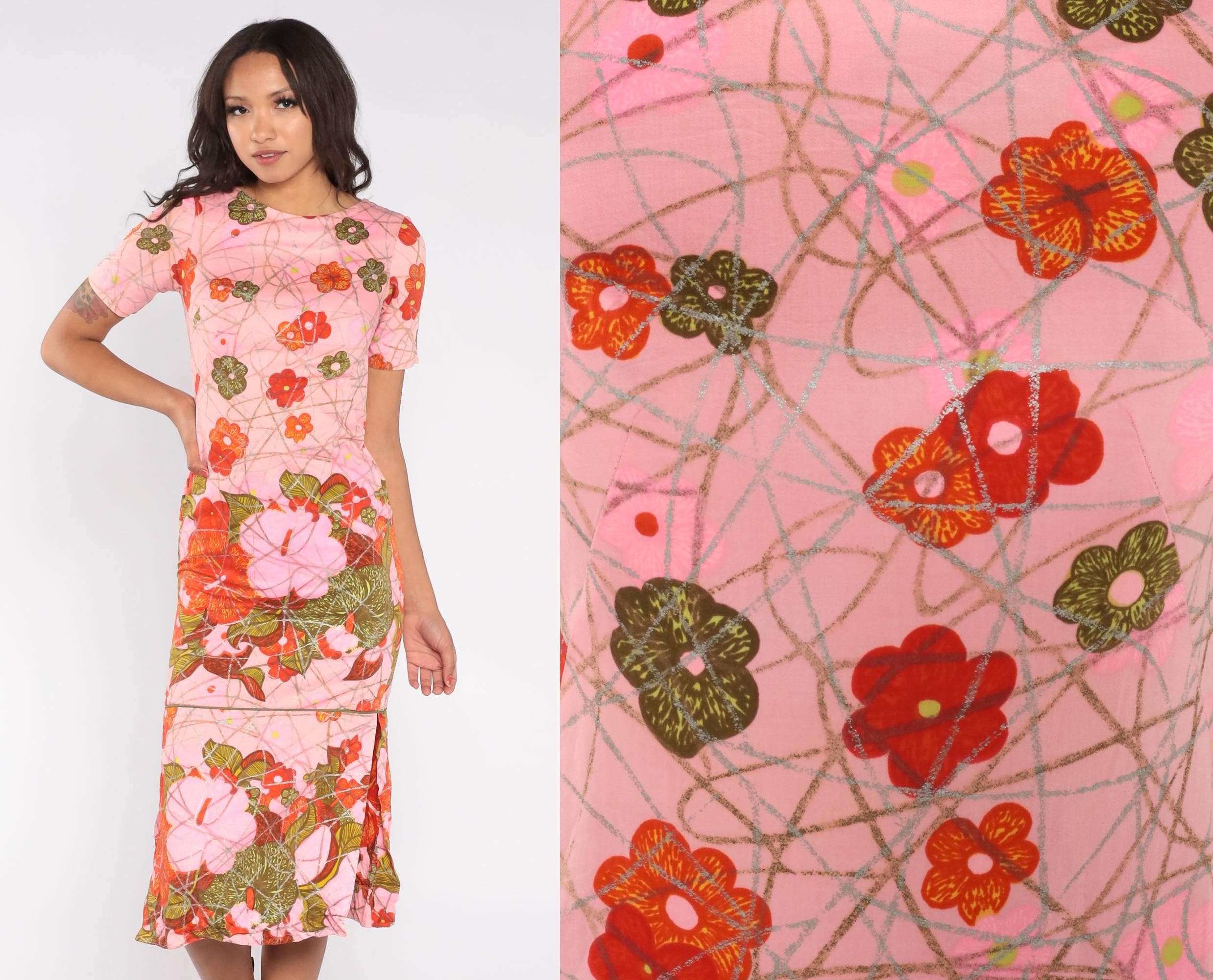 70s pink Hawaiian dress floral dress from Pikake Fashions. Features a hibiscus and tropical floral print in coral, salmon pink and olive green against a blush pink background. Silver geometric grid pattern overlays the florals for a dimensional effect. Classic column silhouette with round neckline, short sleeves, and straight skirt with subtle flounce at hem. Side slits provide easy movement.