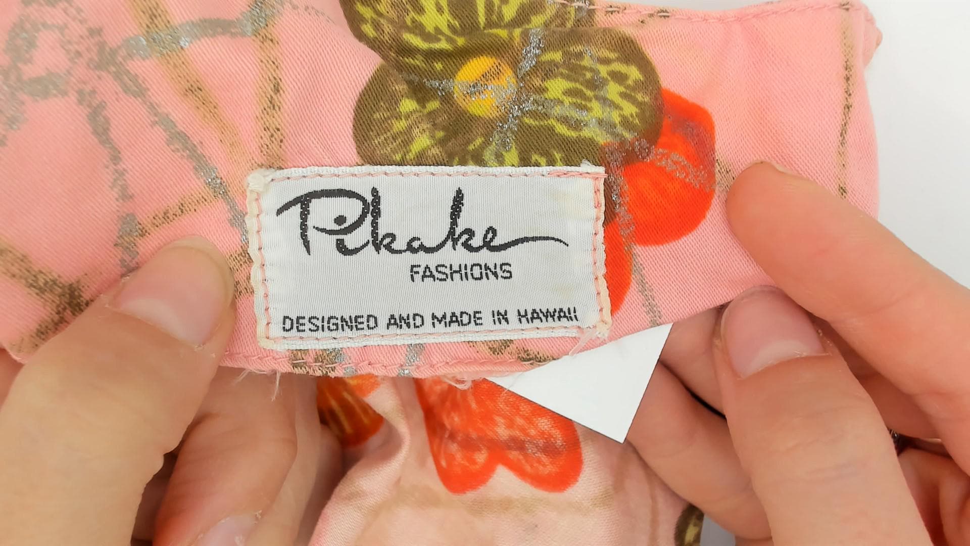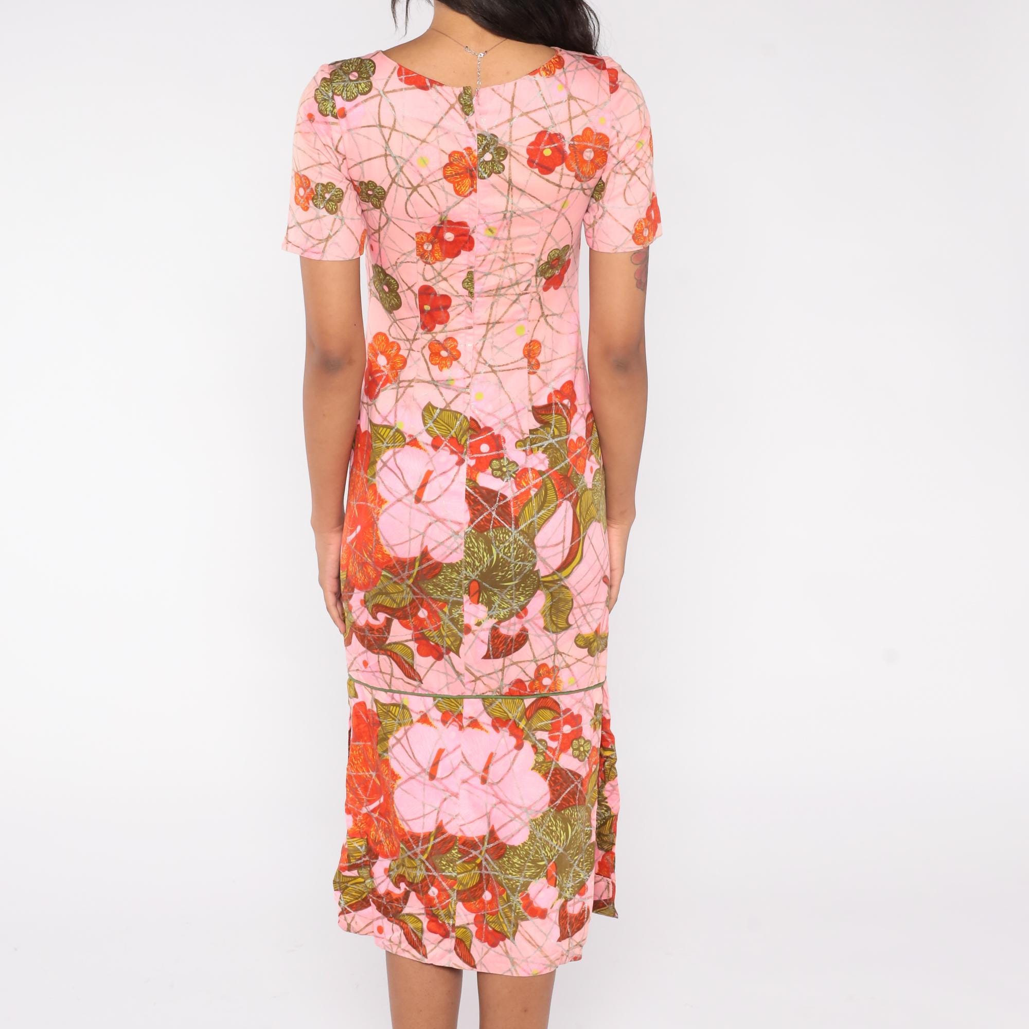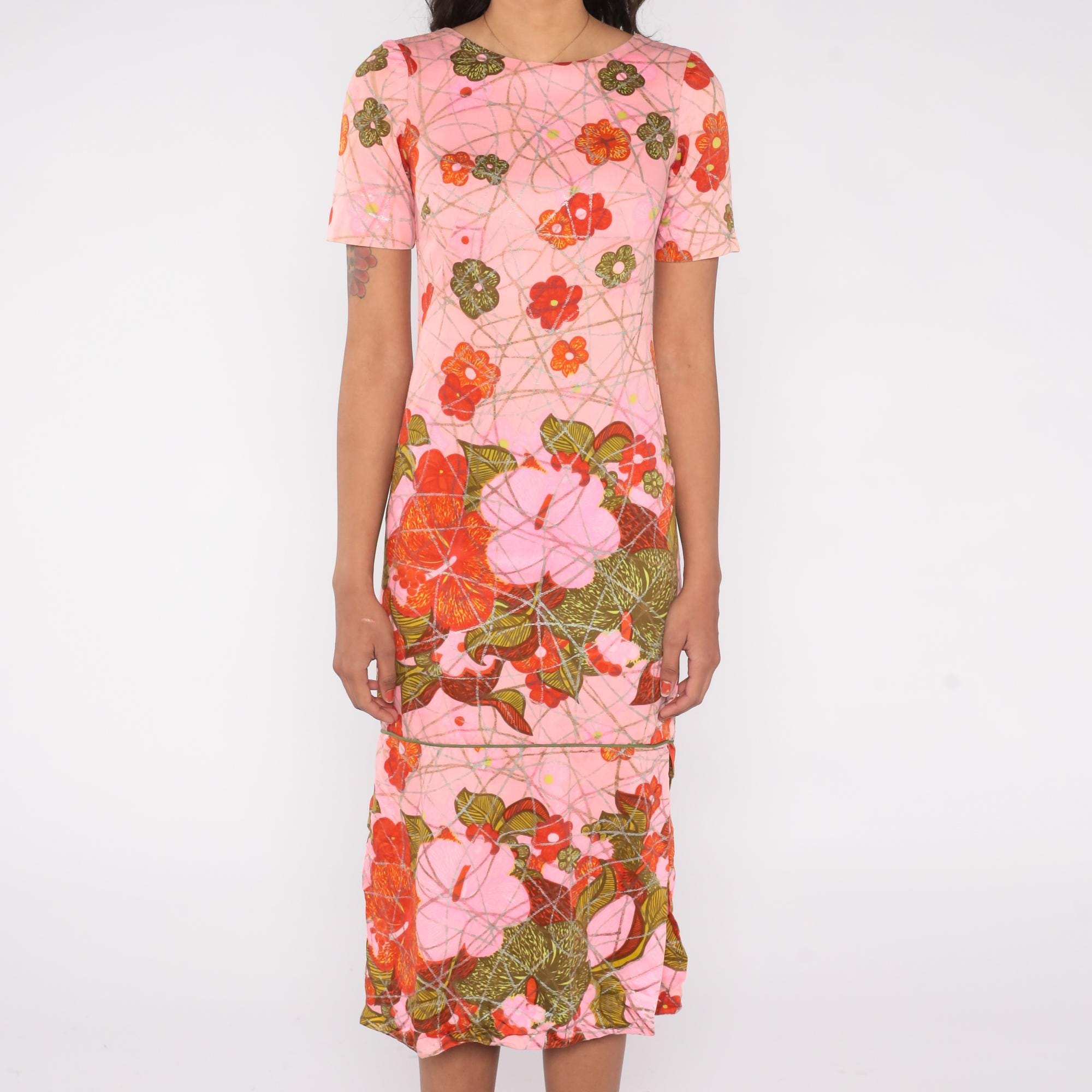 70s pink Hawaiian dress floral dress from Pikake Fashions. Features a hibiscus and tropical floral print in coral, salmon pink and olive green against a blush pink background. Silver geometric grid pattern overlays the florals for a dimensional effect. Classic column silhouette with round neckline, short sleeves, and straight skirt with subtle flounce at hem. Side slits provide easy movement.