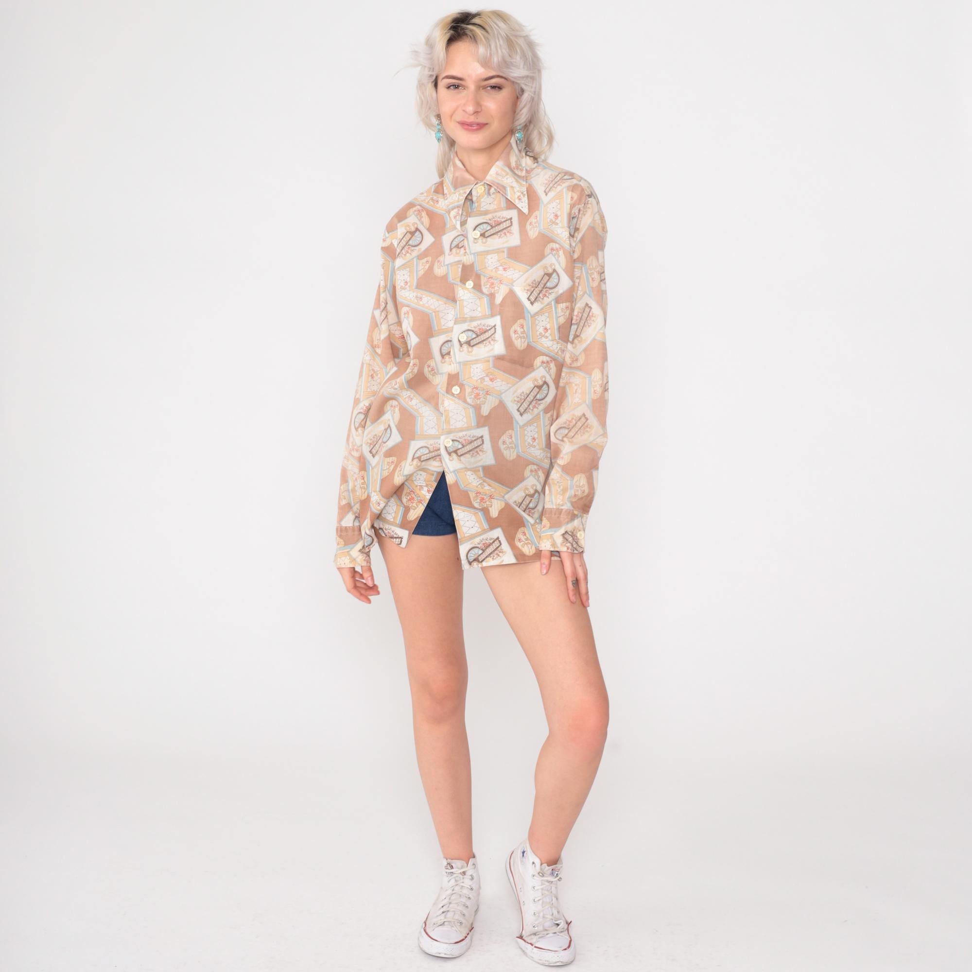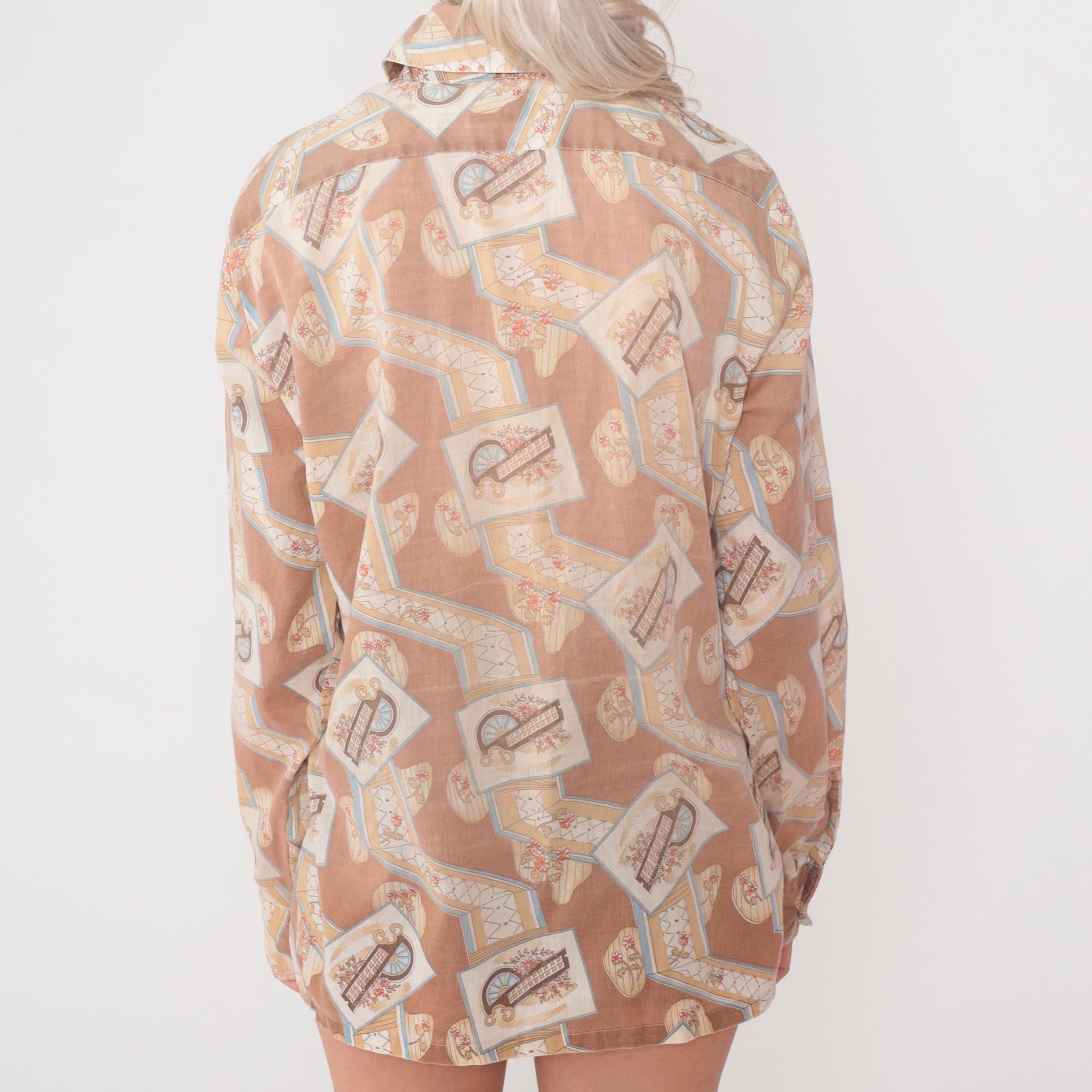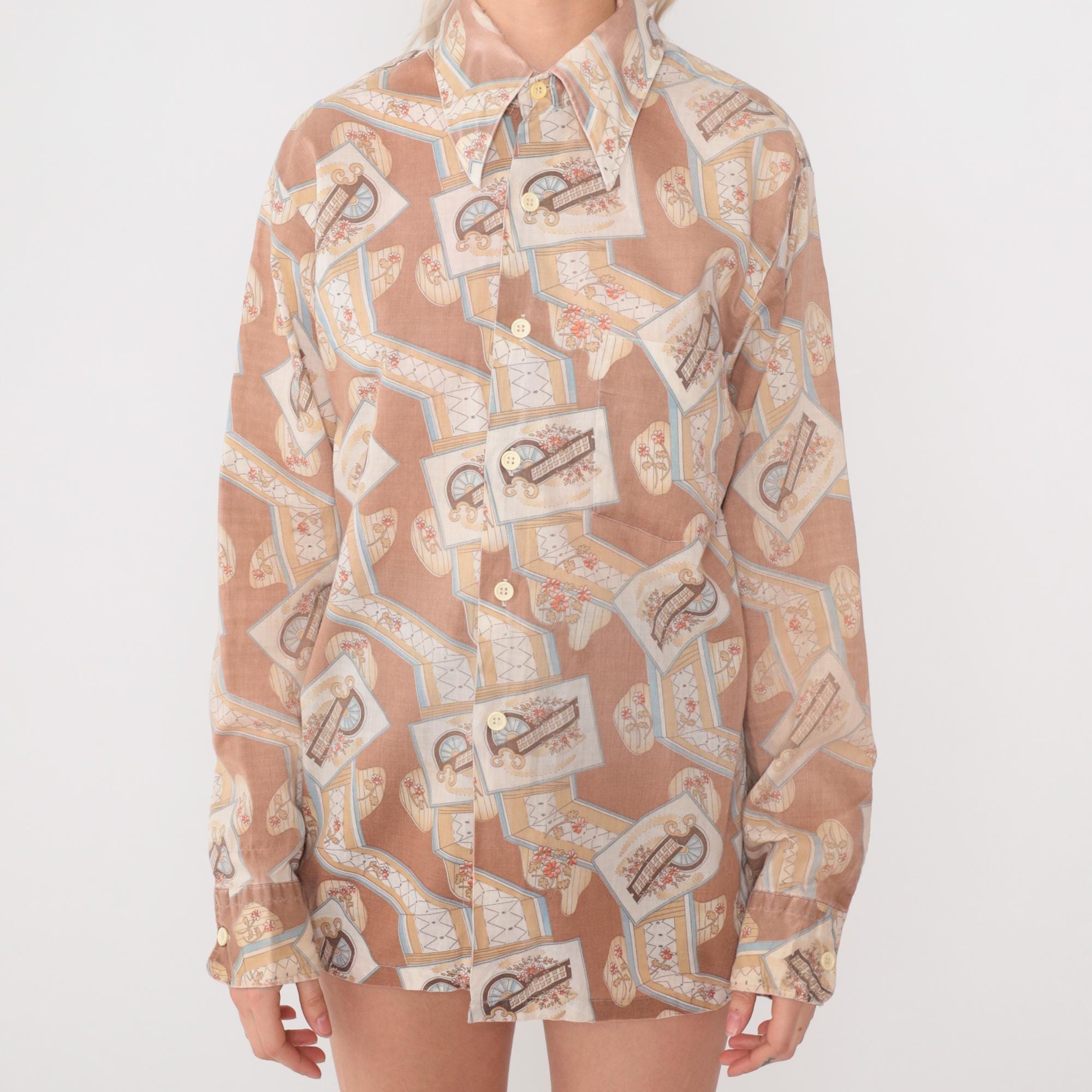 70s tan button-down shirt with an architectural garden scene novelty print. Features vintage illustrations of windows, gazebos, and floral arrangements in tan, blue, and coral. Long sleeves, pointed collar, and front button closure.
