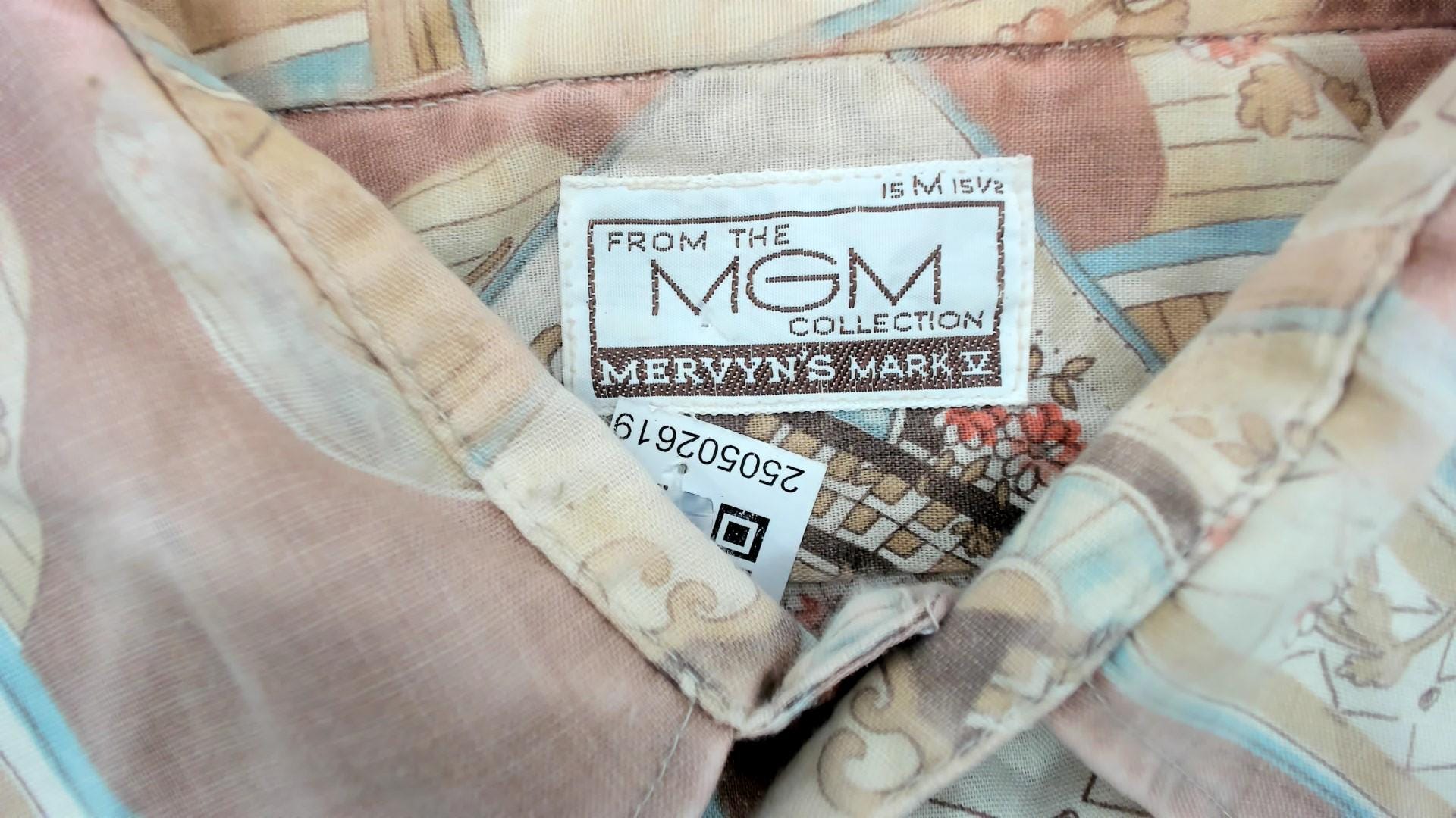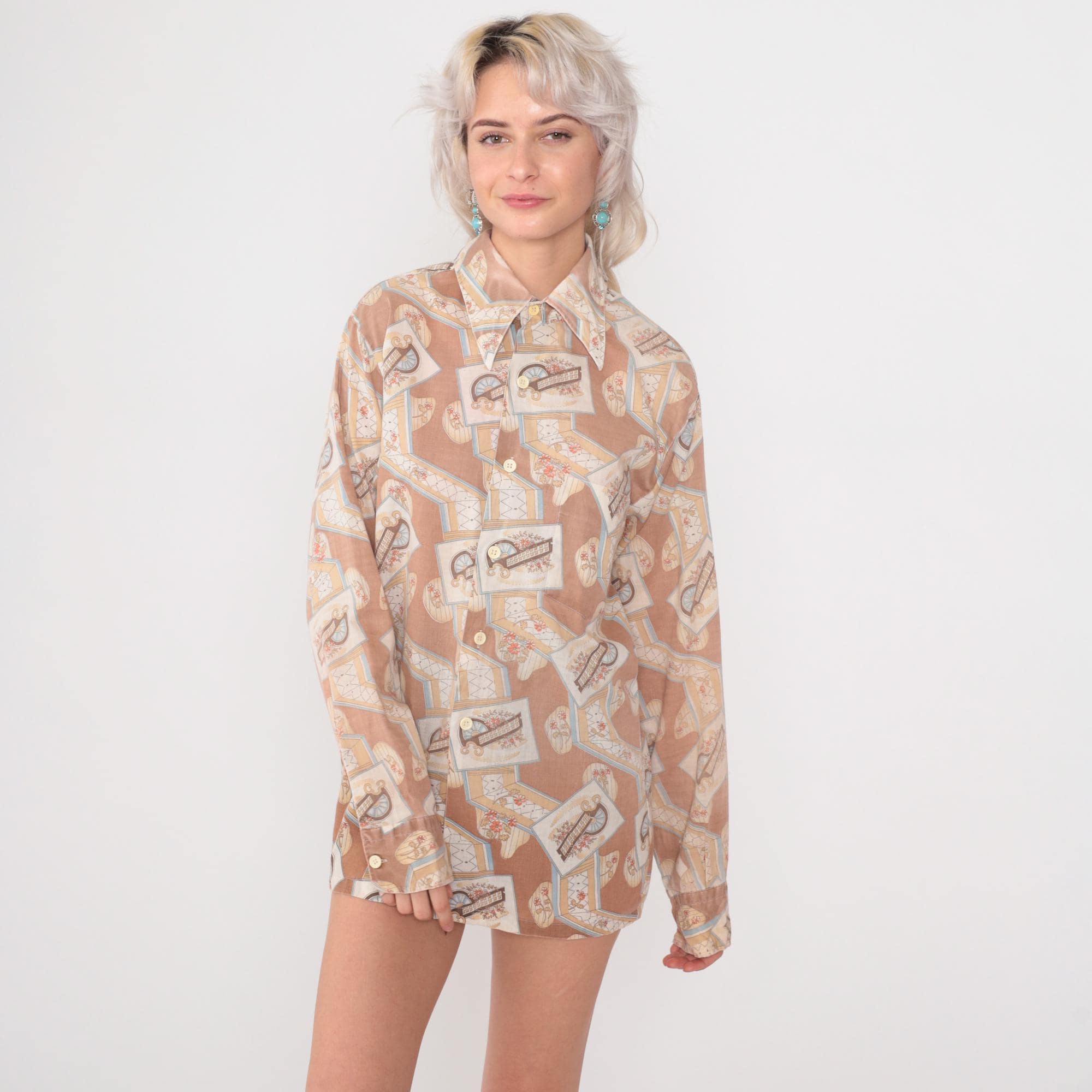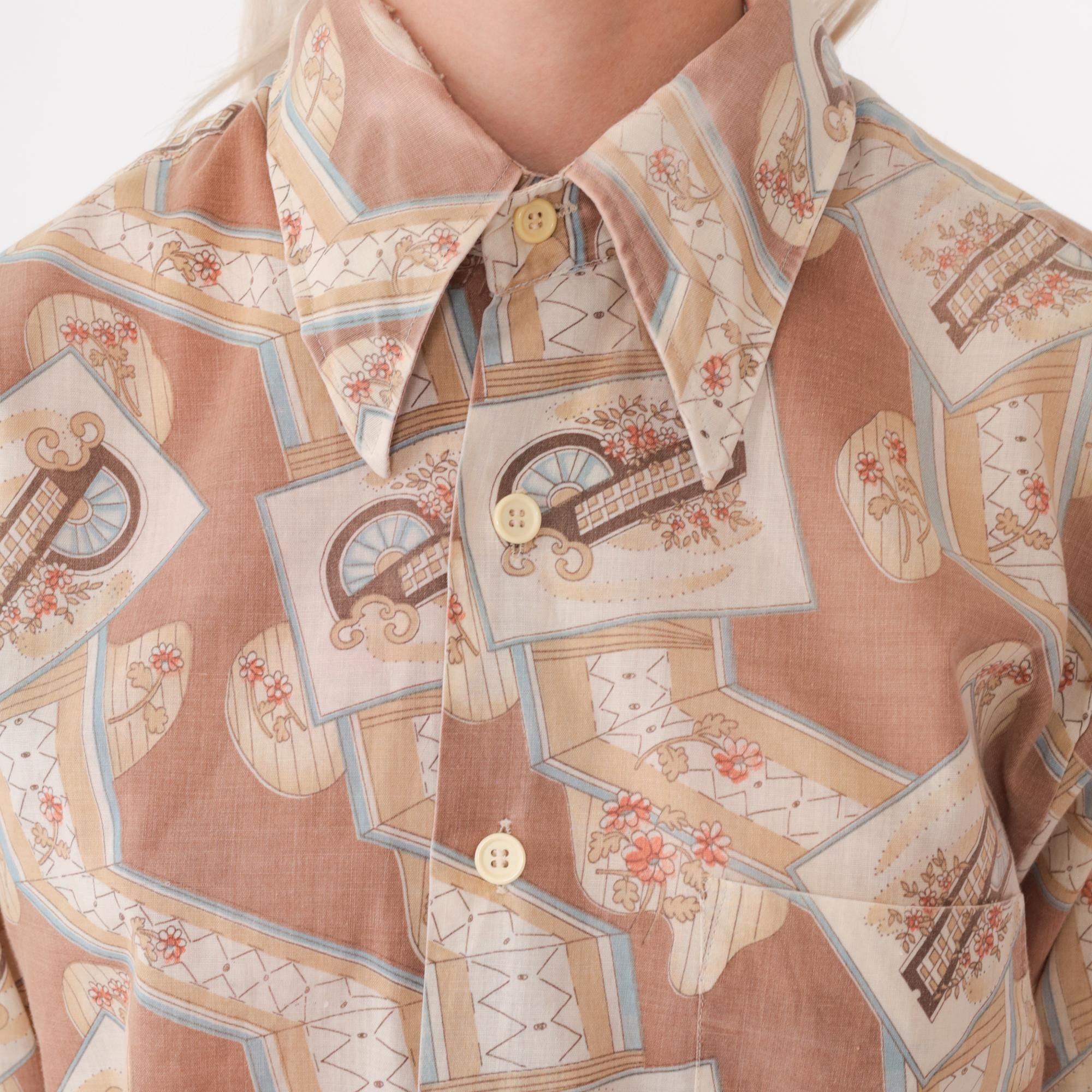 70s tan button-down shirt with an architectural garden scene novelty print. Features vintage illustrations of windows, gazebos, and floral arrangements in tan, blue, and coral. Long sleeves, pointed collar, and front button closure.