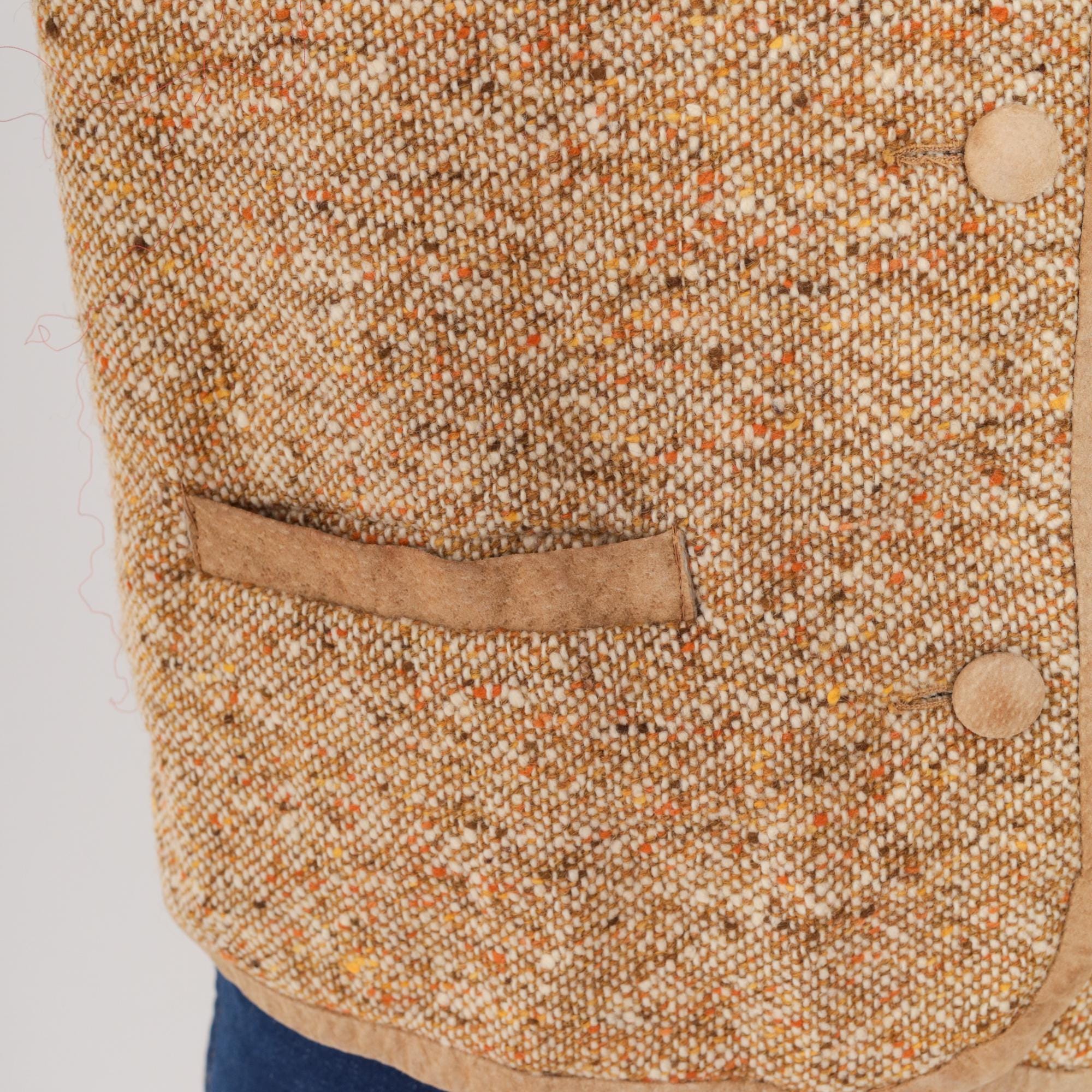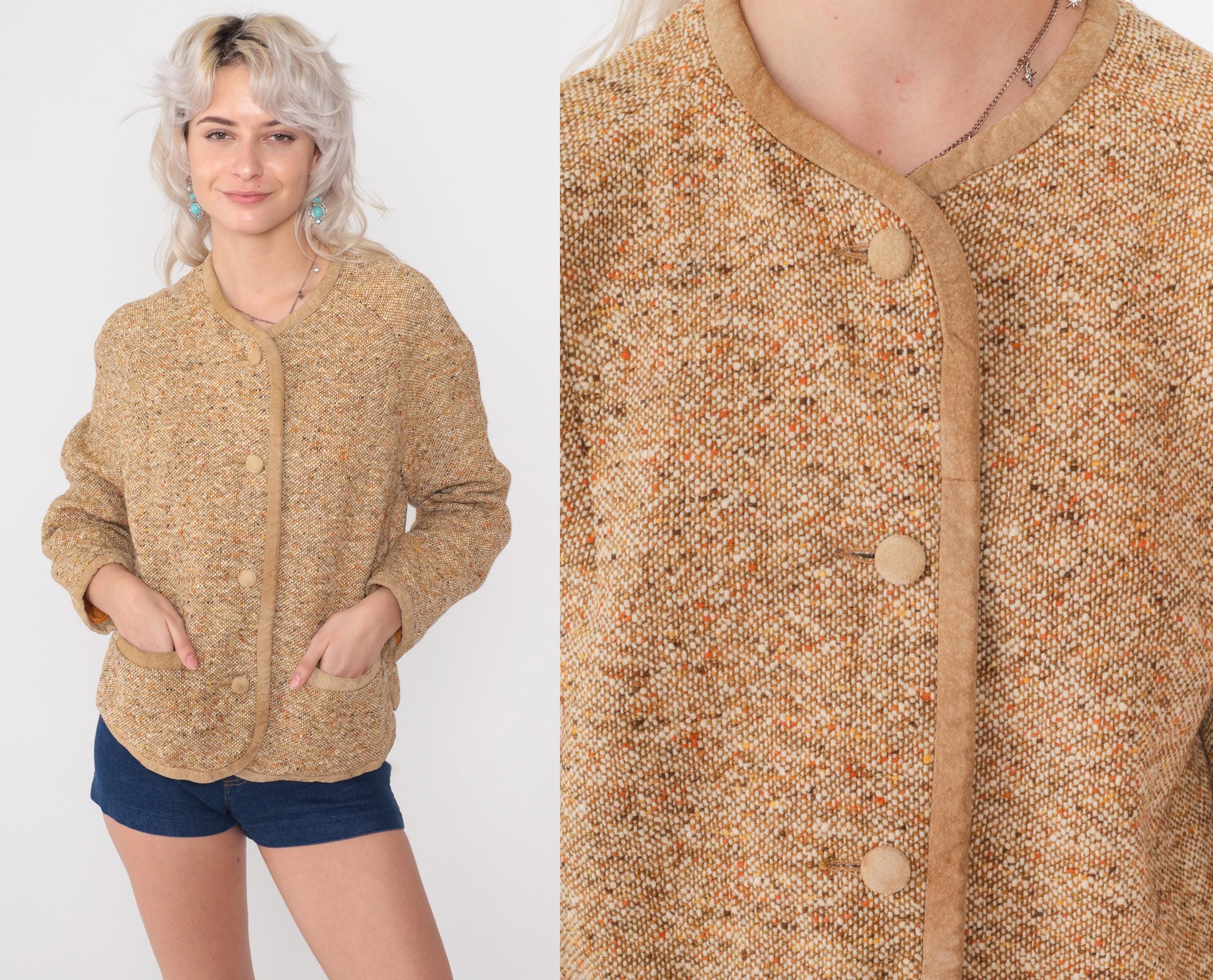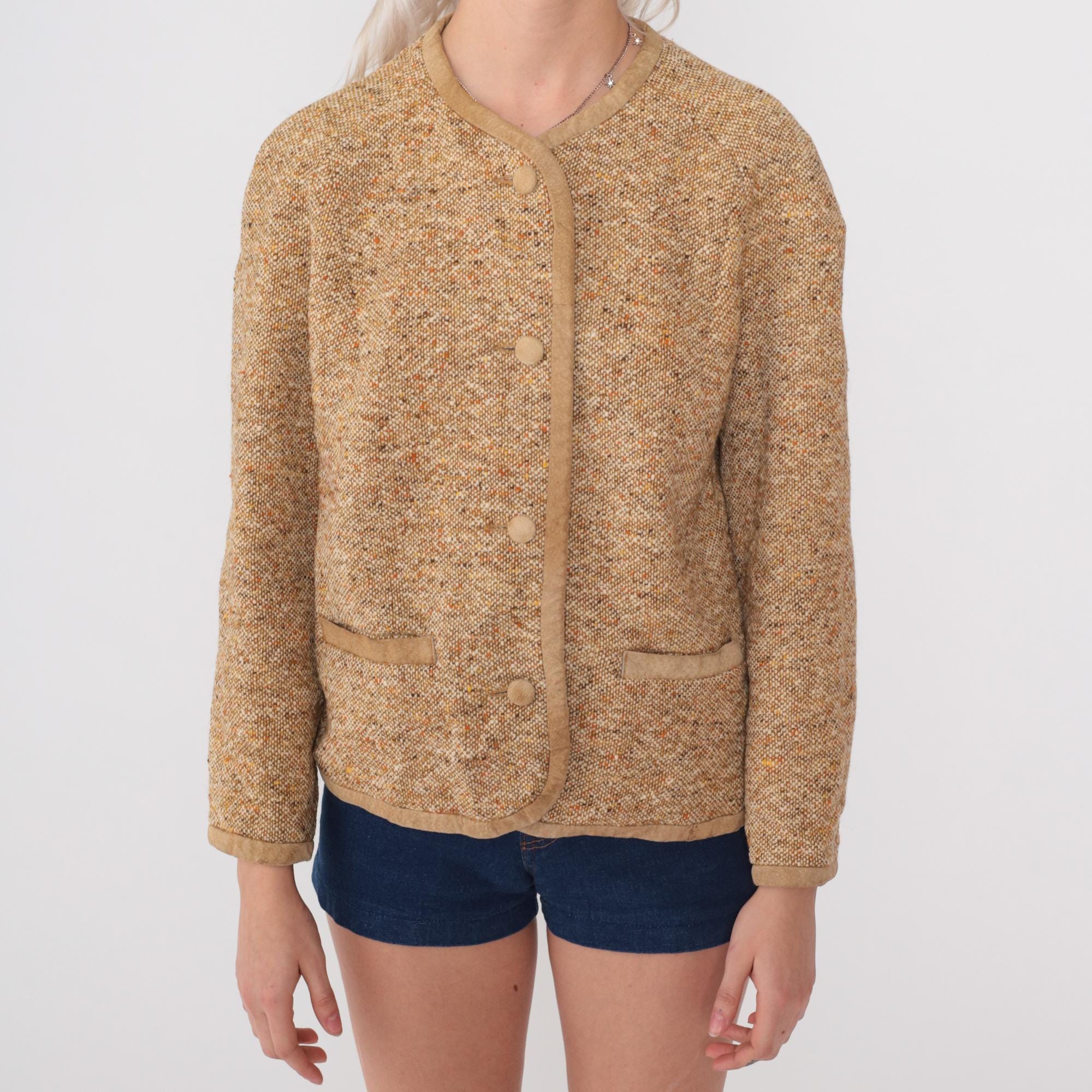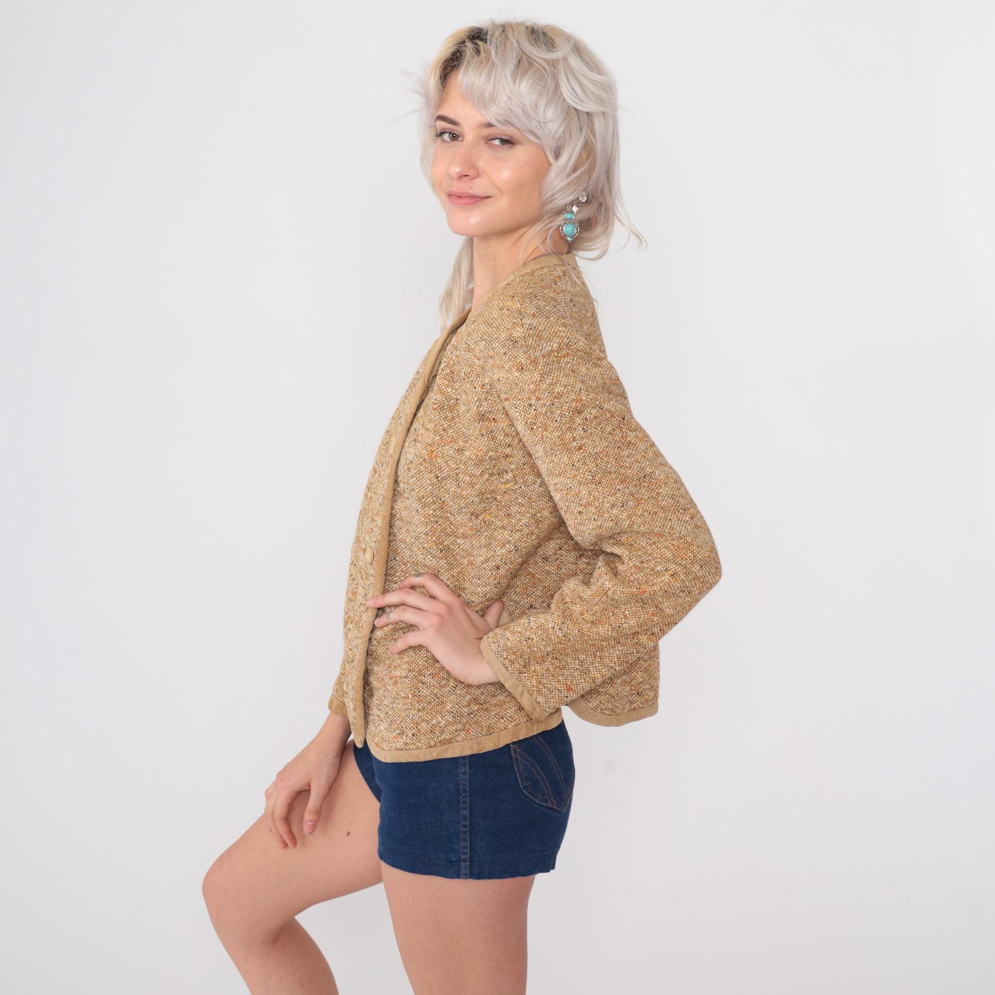 60s tan speckled tweed jacket from Glen of Michigan. Features a collarless neckline with suede trim, front button closure, and two front pockets. Cropped length with long sleeves. Fully acetate lined. Wool blend tweed with multi-colored flecks throughout. Perfect for fall and winter layering.