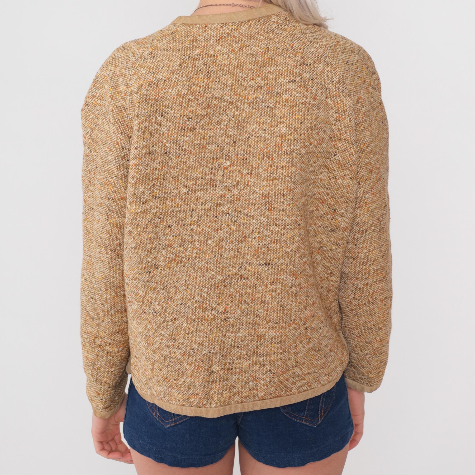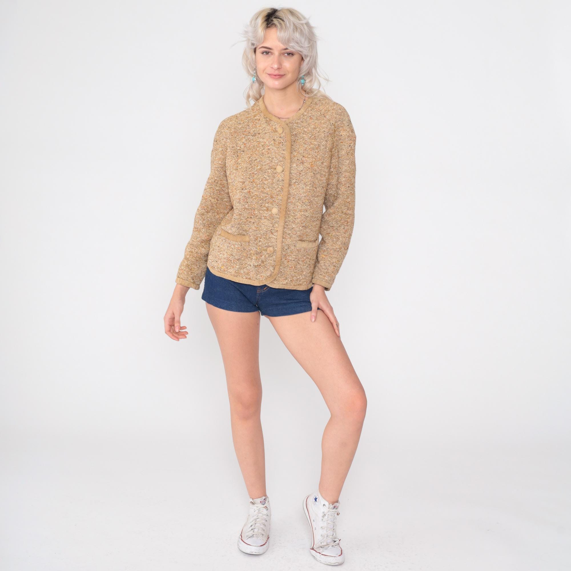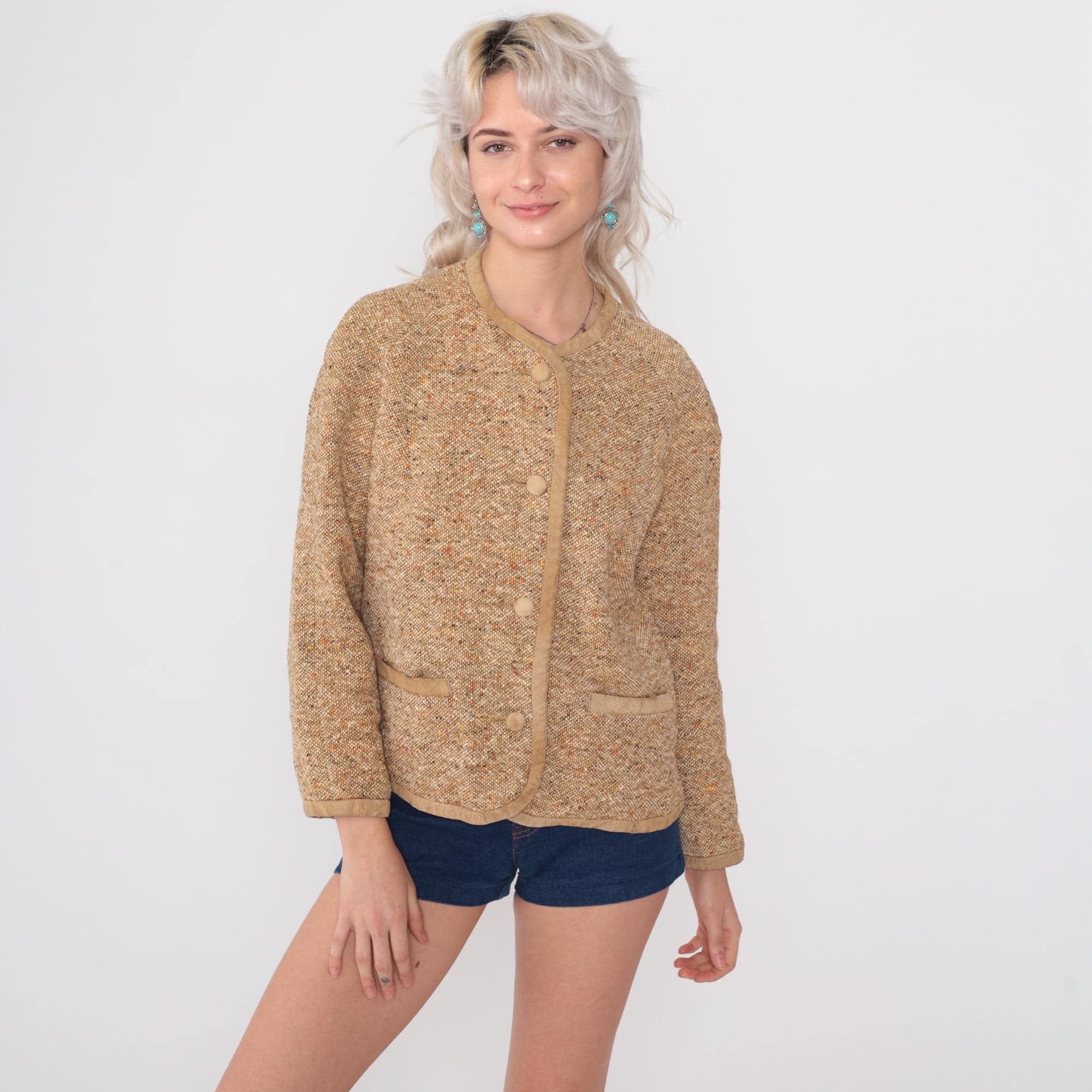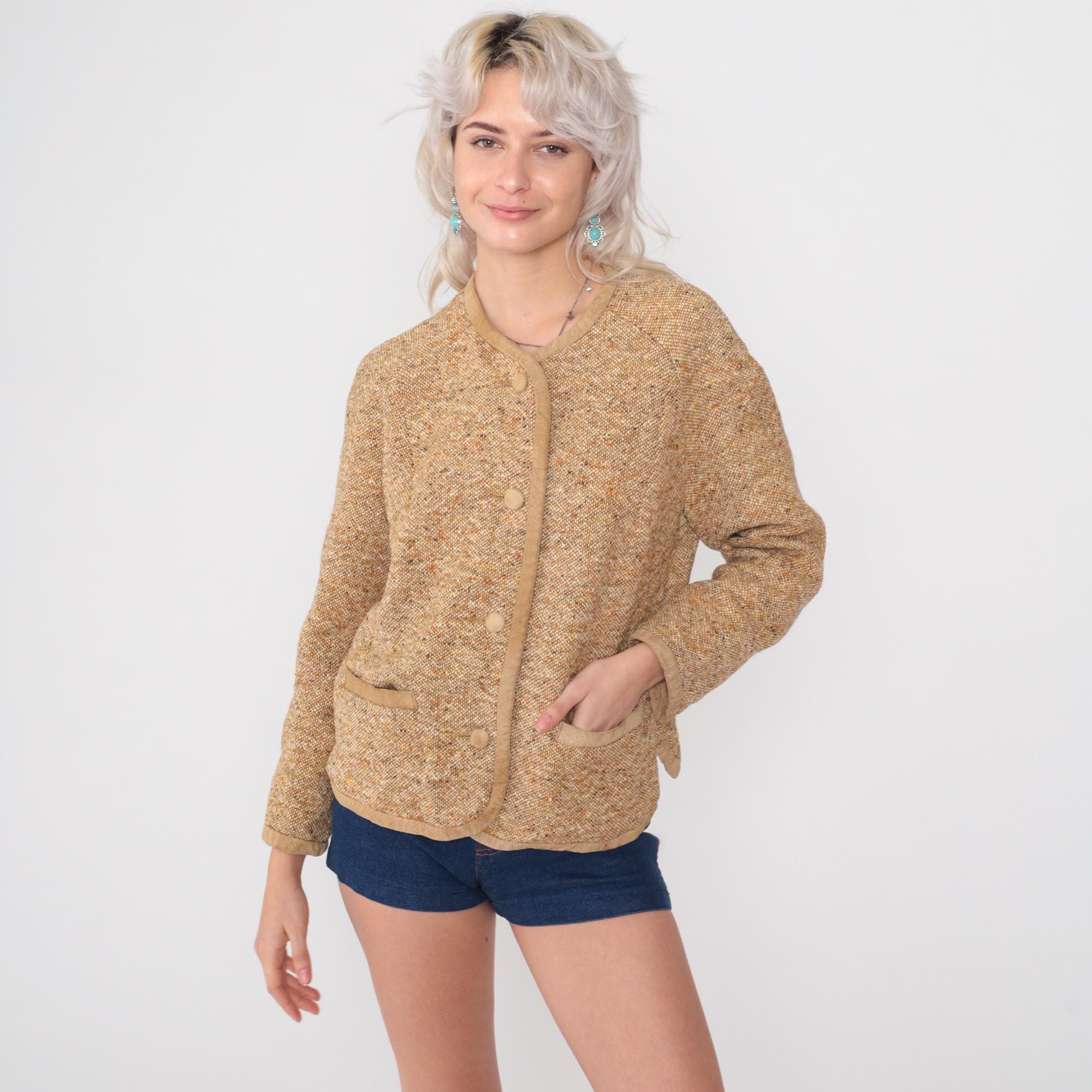 60s tan speckled tweed jacket from Glen of Michigan. Features a collarless neckline with suede trim, front button closure, and two front pockets. Cropped length with long sleeves. Fully acetate lined. Wool blend tweed with multi-colored flecks throughout. Perfect for fall and winter layering.