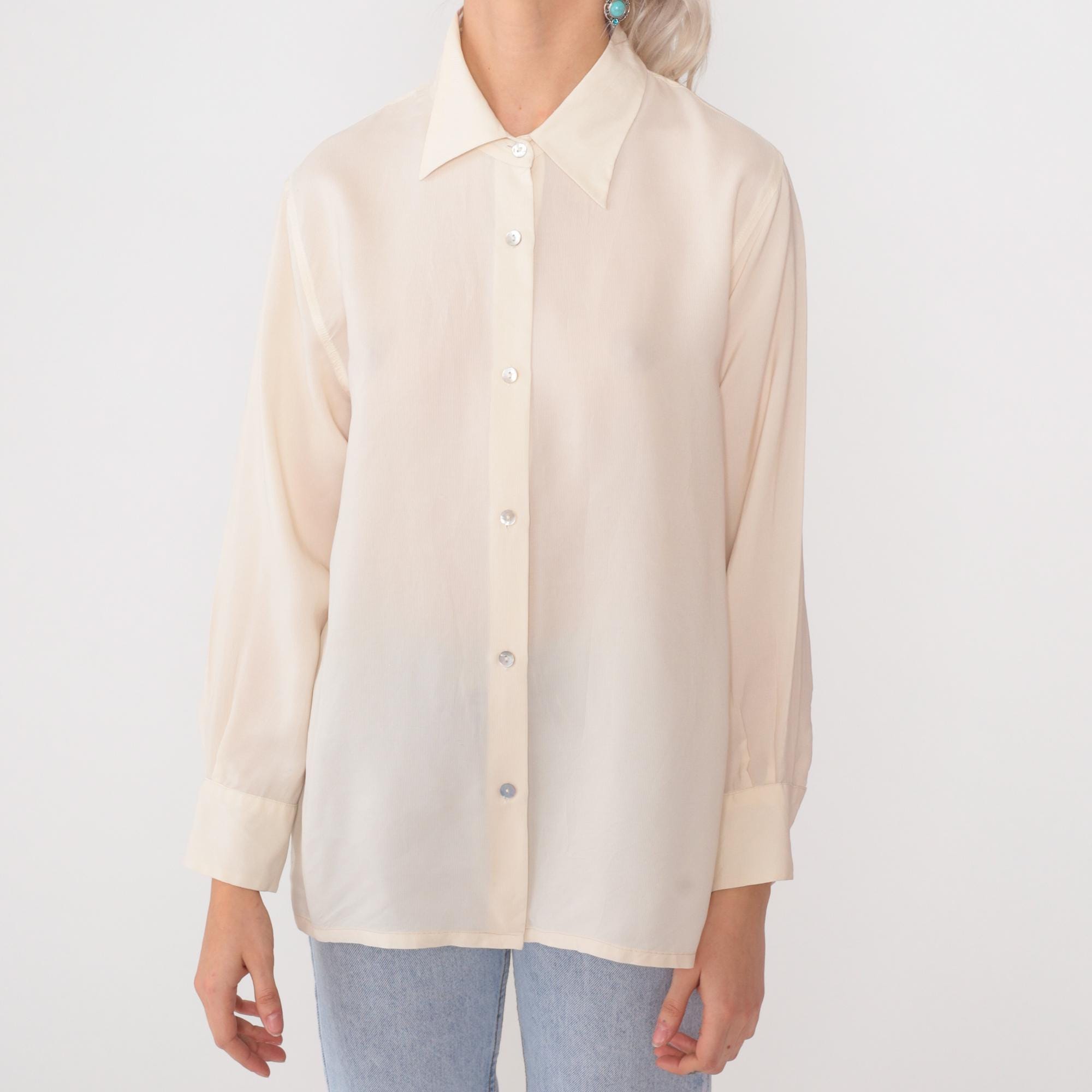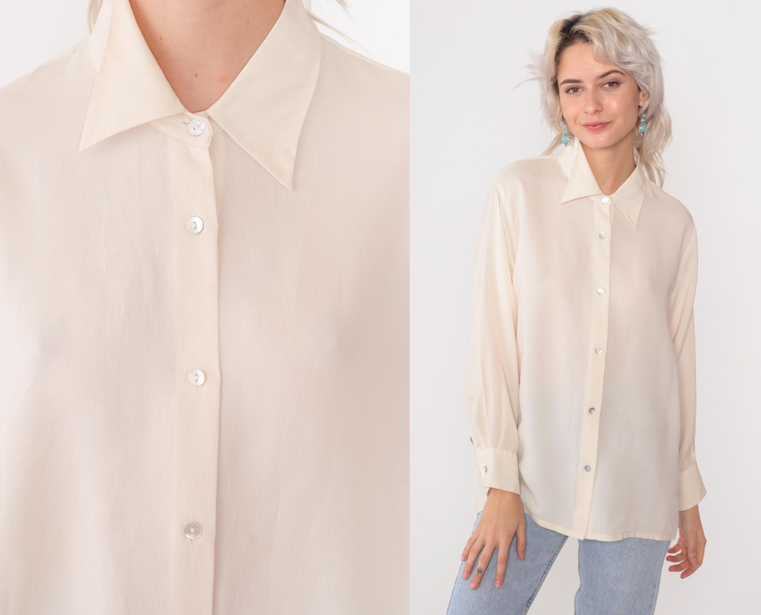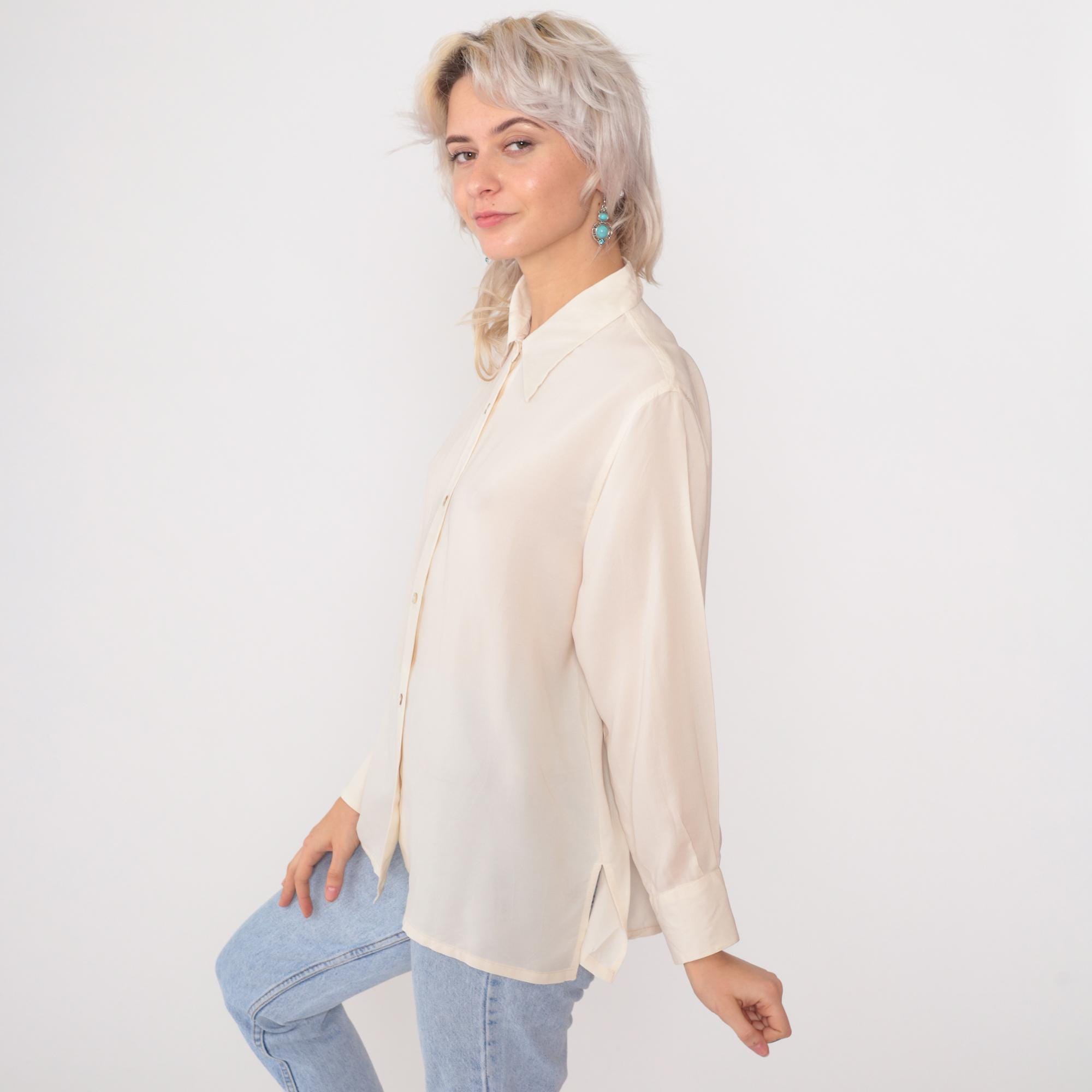 90s cream silk button-down blouse from Silk House. Features a pointed collar, front button closure, long sleeves with button cuffs, and a straight hem.