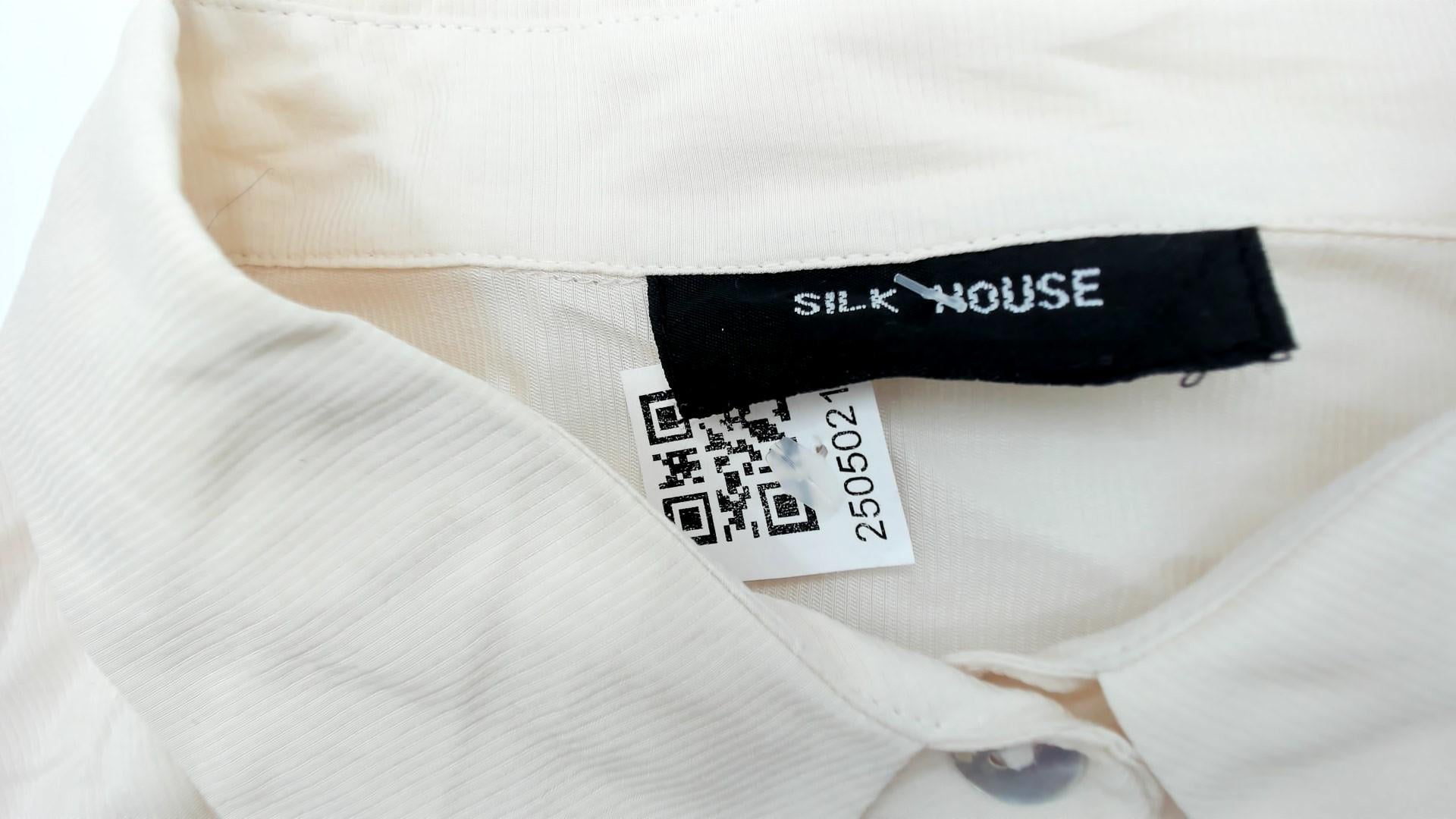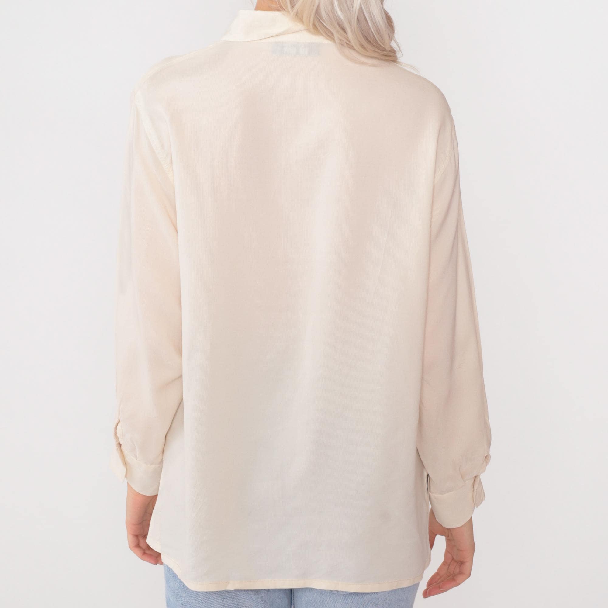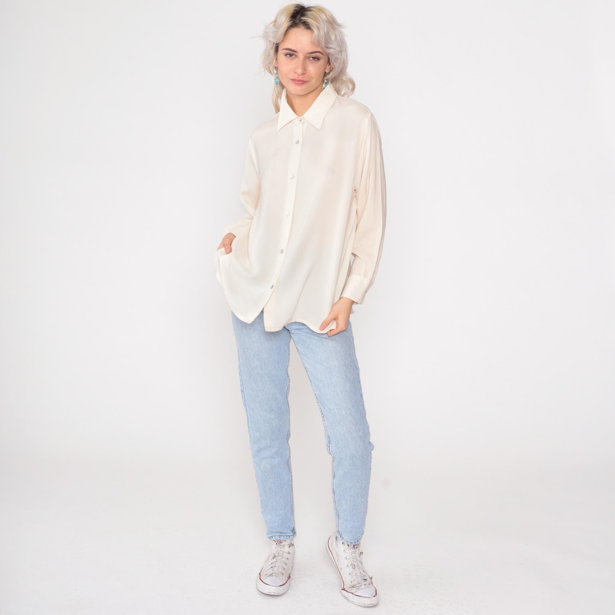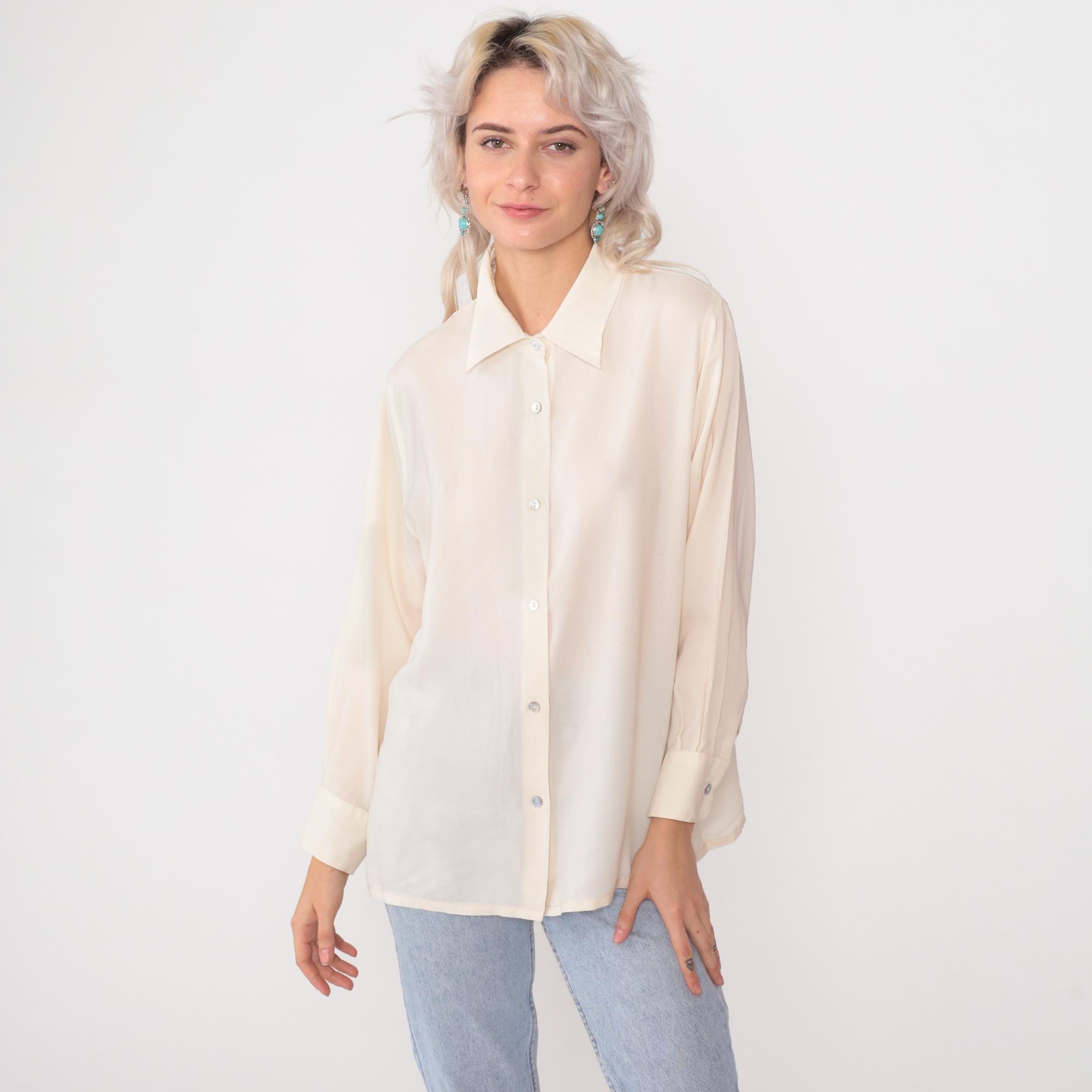 90s cream silk button-down blouse from Silk House. Features a pointed collar, front button closure, long sleeves with button cuffs, and a straight hem.