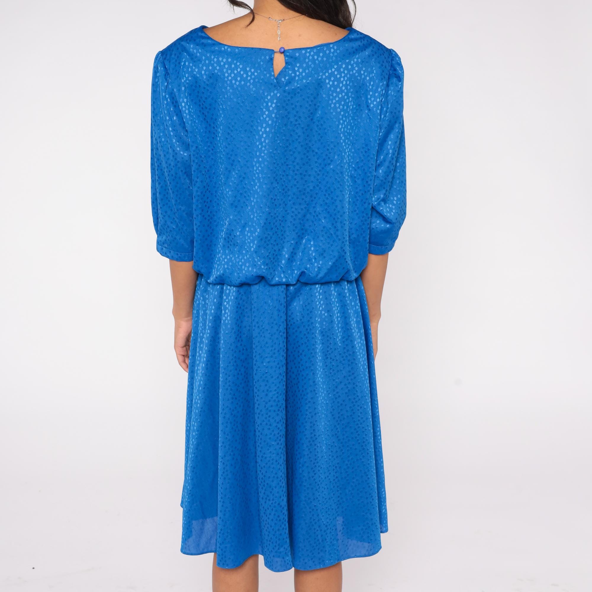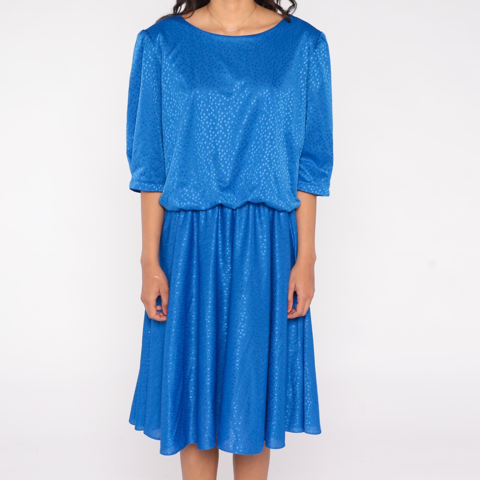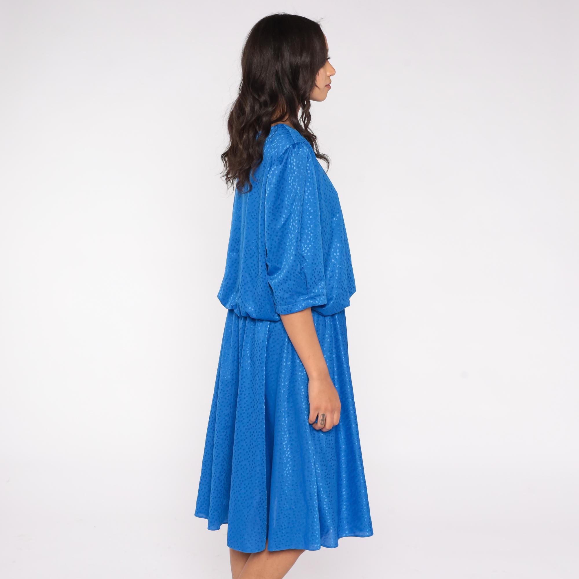 80s Jenny midi dress in royal blue textured jacquard fabric with tonal dot pattern. Features blouson top with elastic waist, 3/4 dolman sleeves, and keyhole button closure at back.