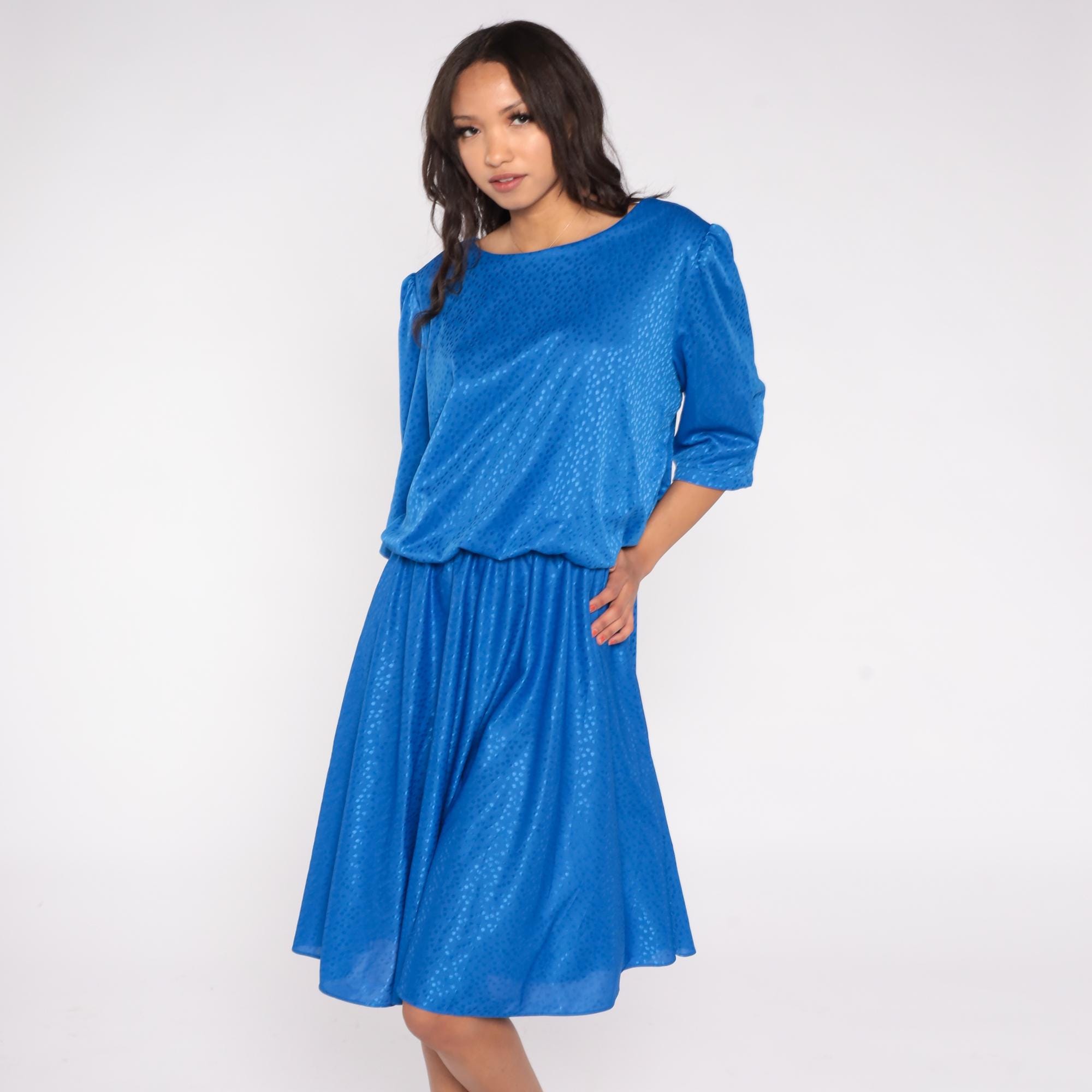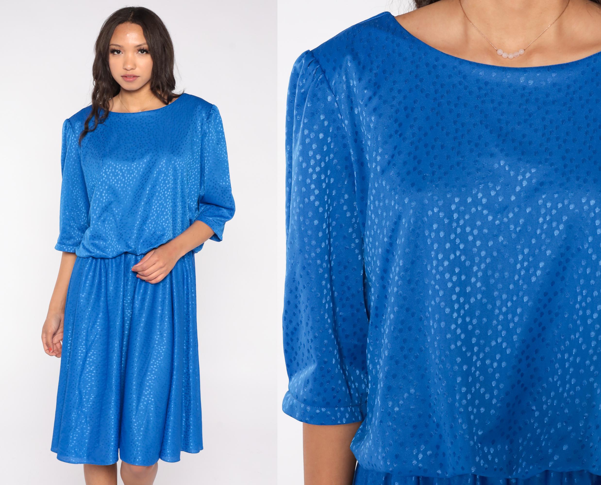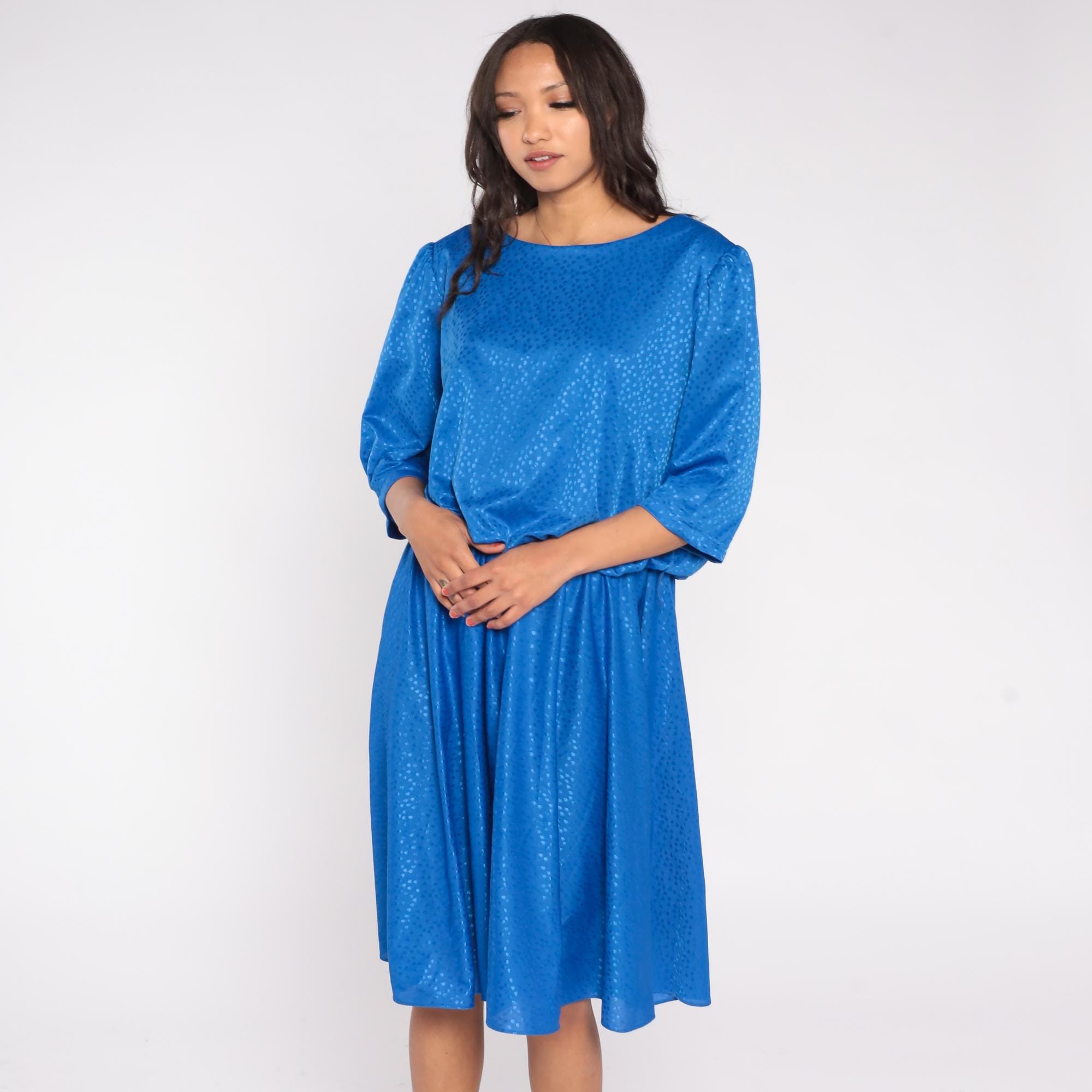 80s Jenny midi dress in royal blue textured jacquard fabric with tonal dot pattern. Features blouson top with elastic waist, 3/4 dolman sleeves, and keyhole button closure at back.