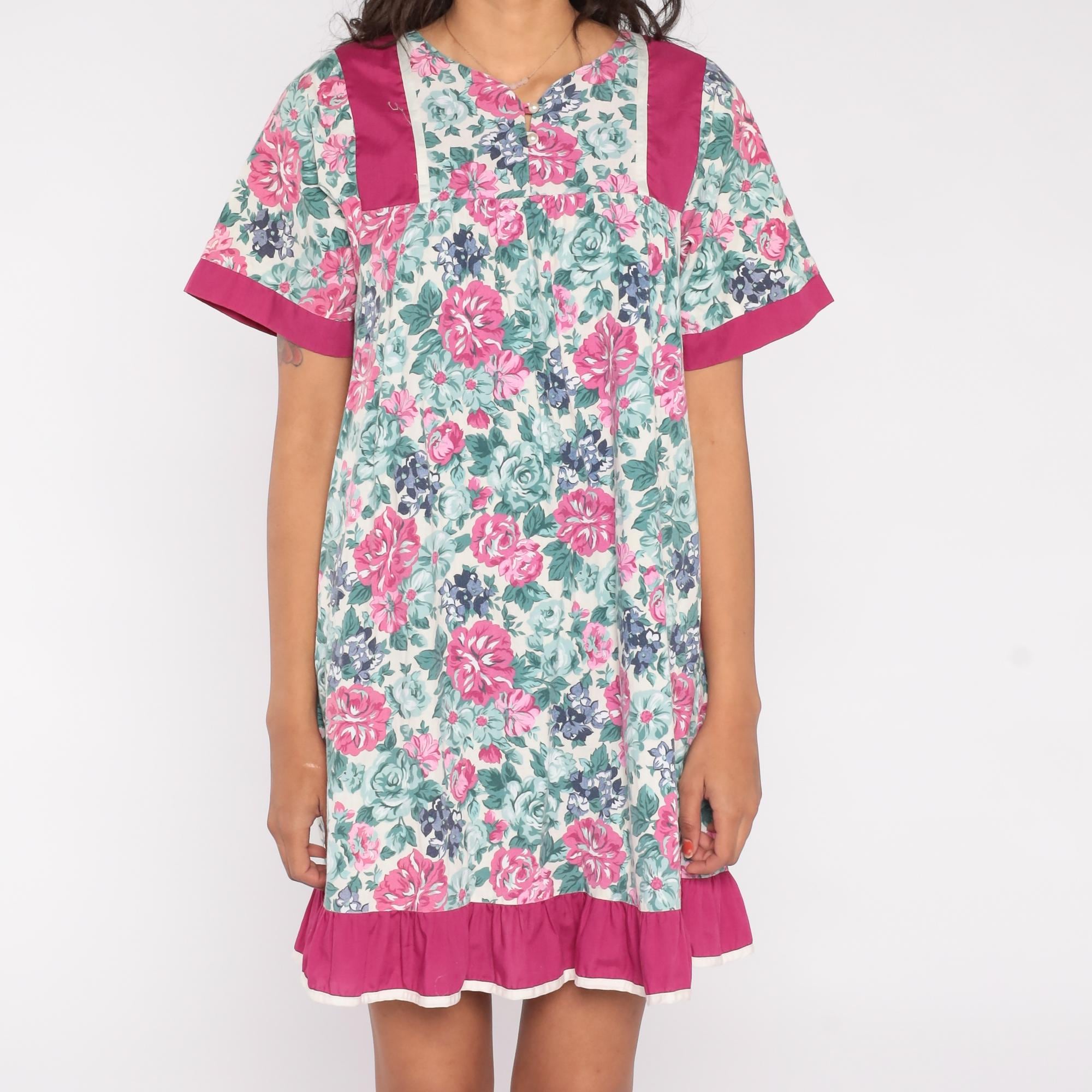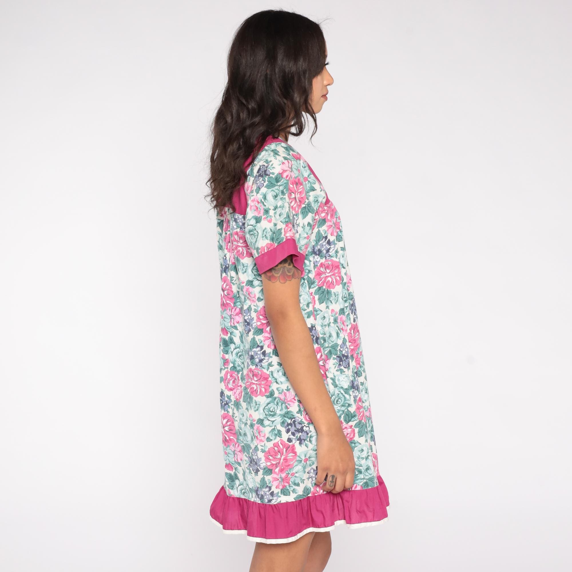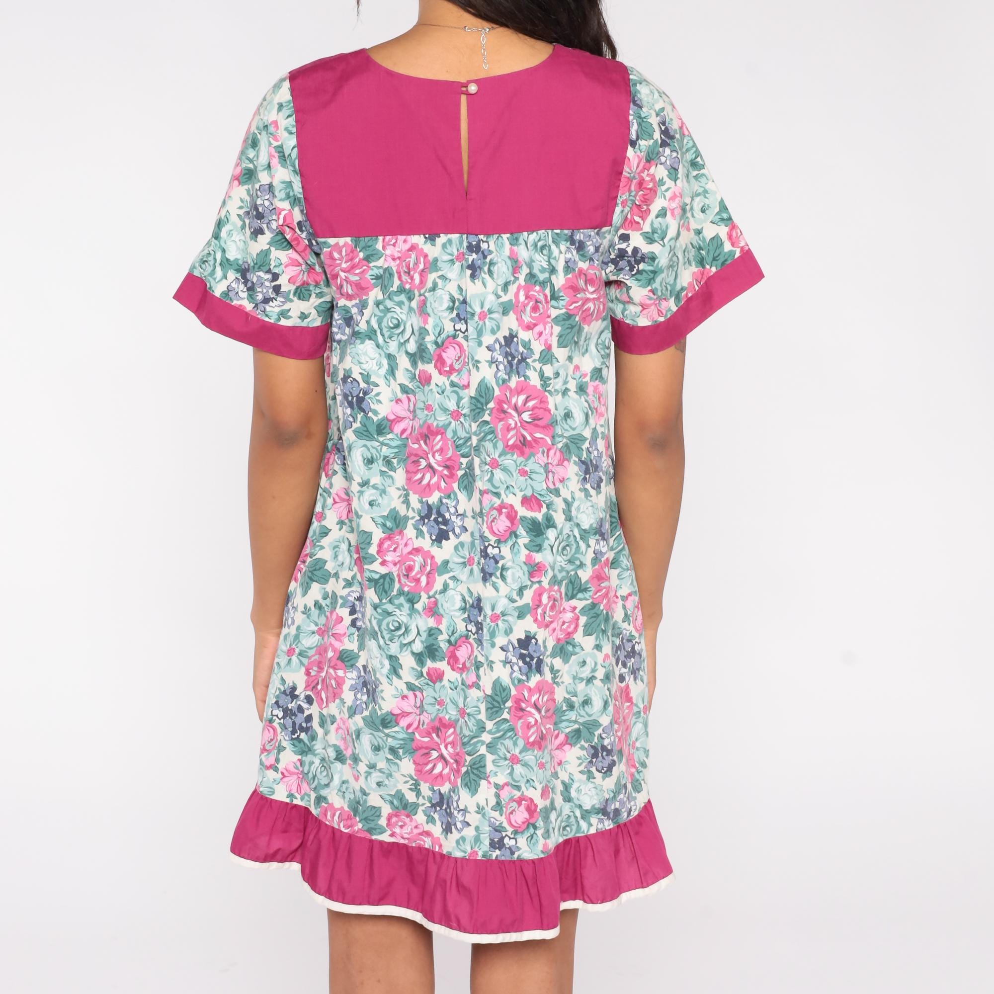 80s mini dress with pink roses and navy flowers on white background. Features bright fuchsia trim on yoke, sleeves and hem. V-neckline with keyhole button closure at back. Short sleeves and gathered ruffle hem.