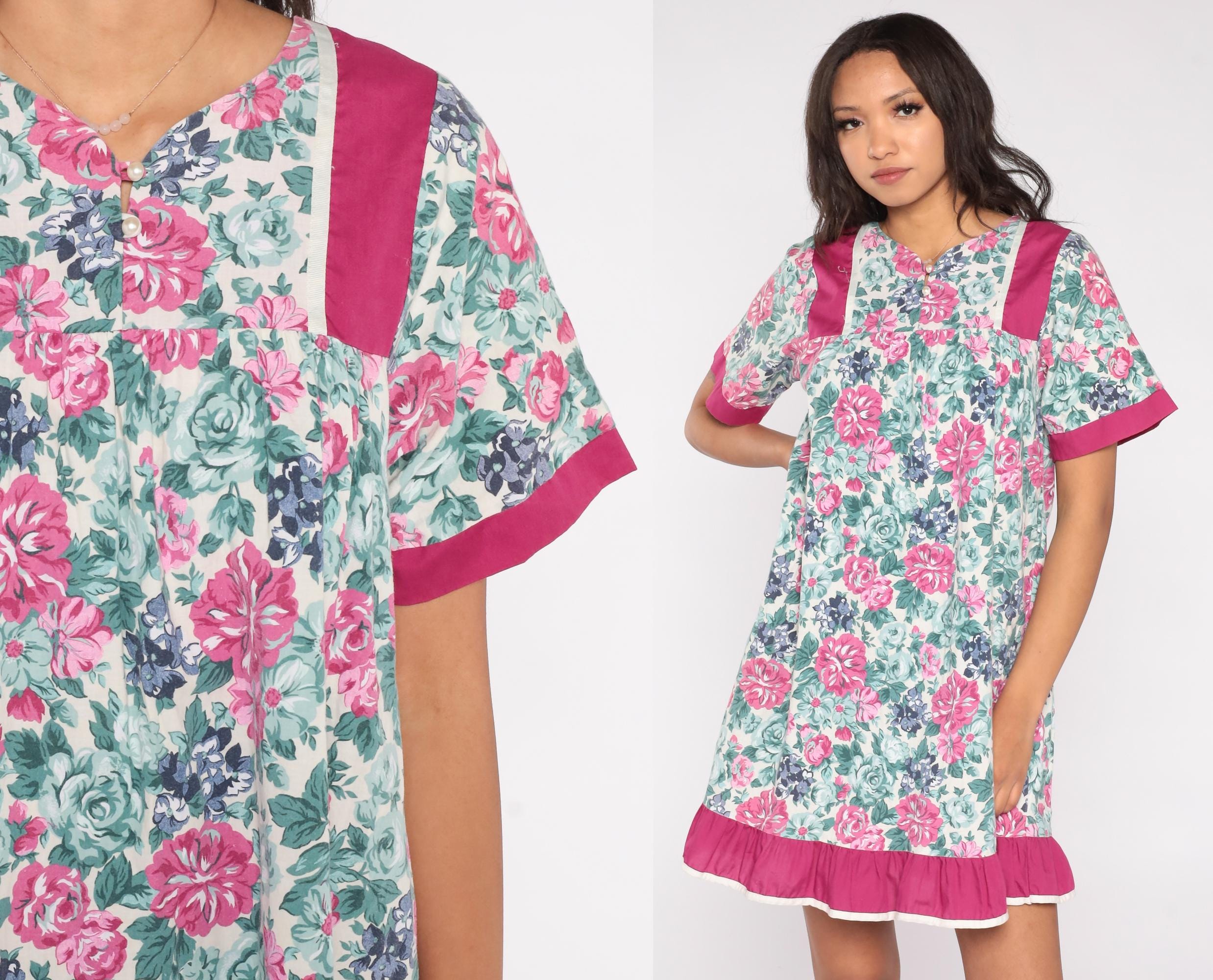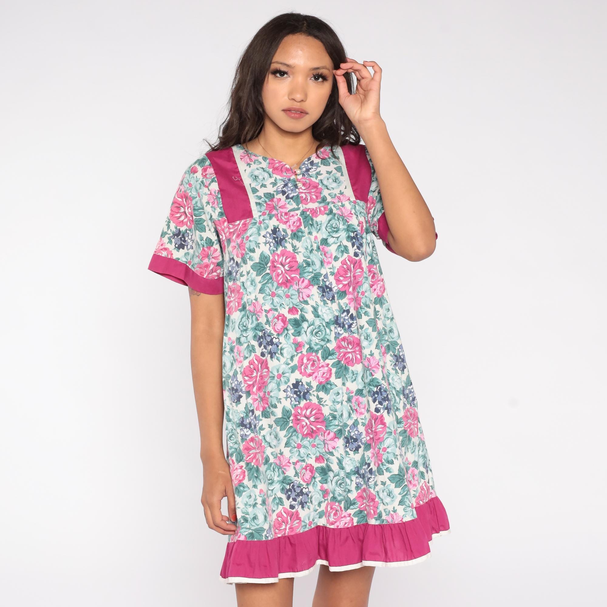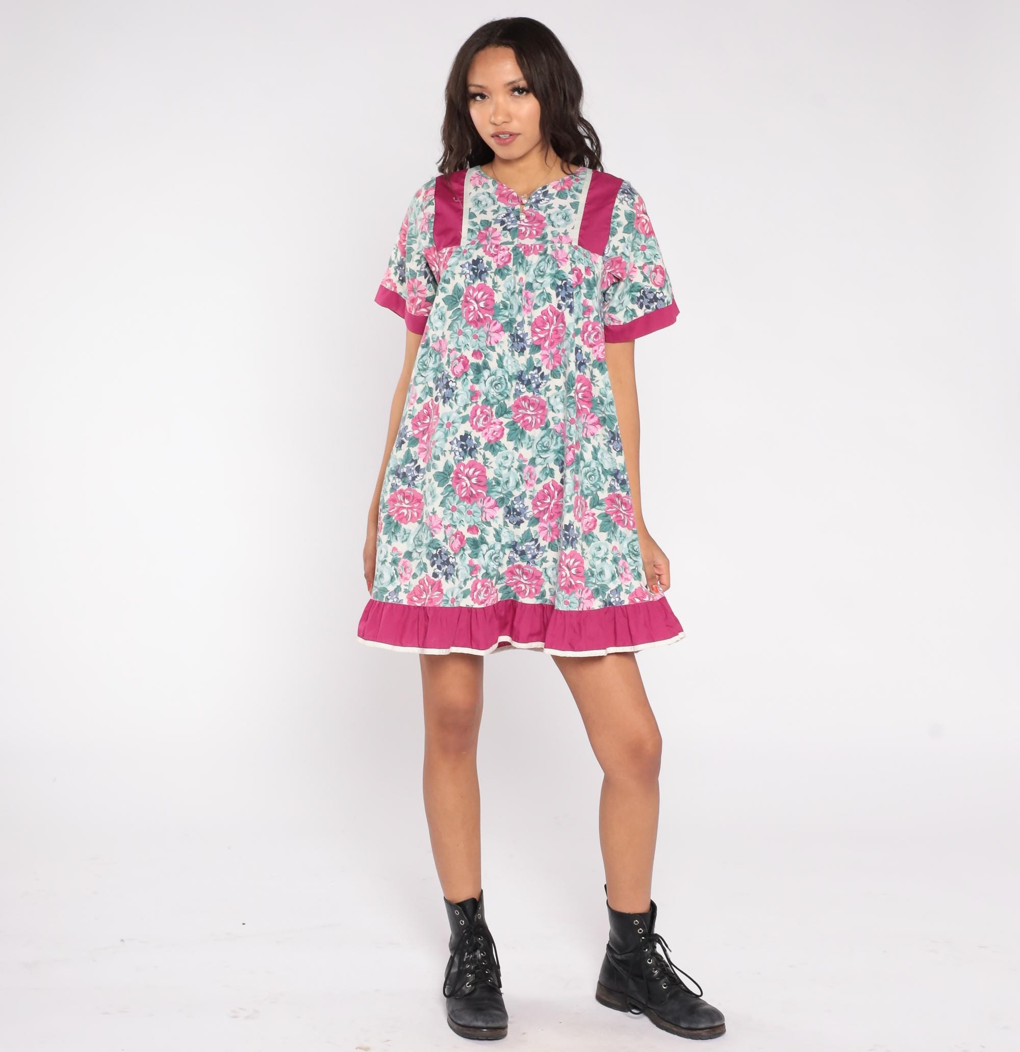 80s mini dress with pink roses and navy flowers on white background. Features bright fuchsia trim on yoke, sleeves and hem. V-neckline with keyhole button closure at back. Short sleeves and gathered ruffle hem.