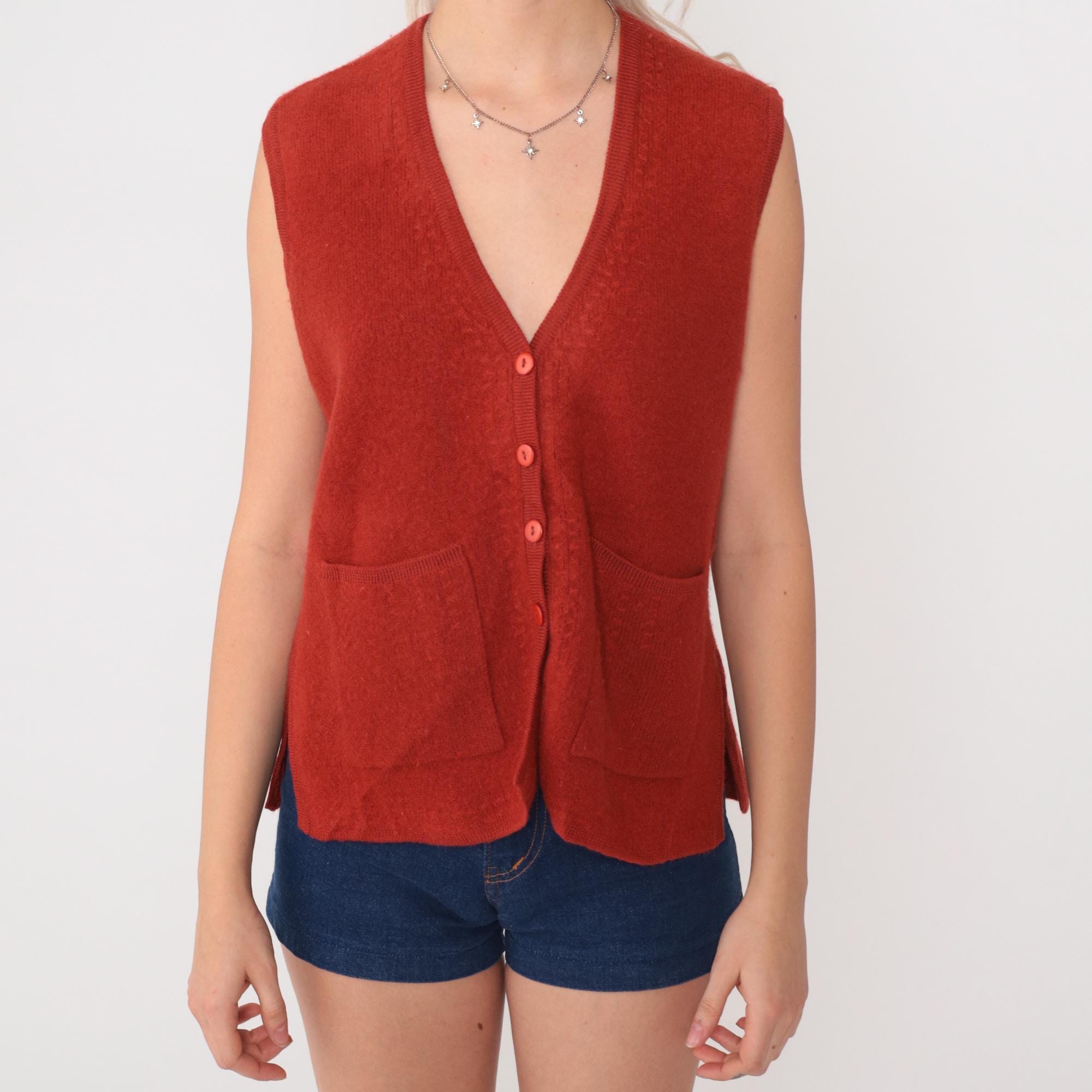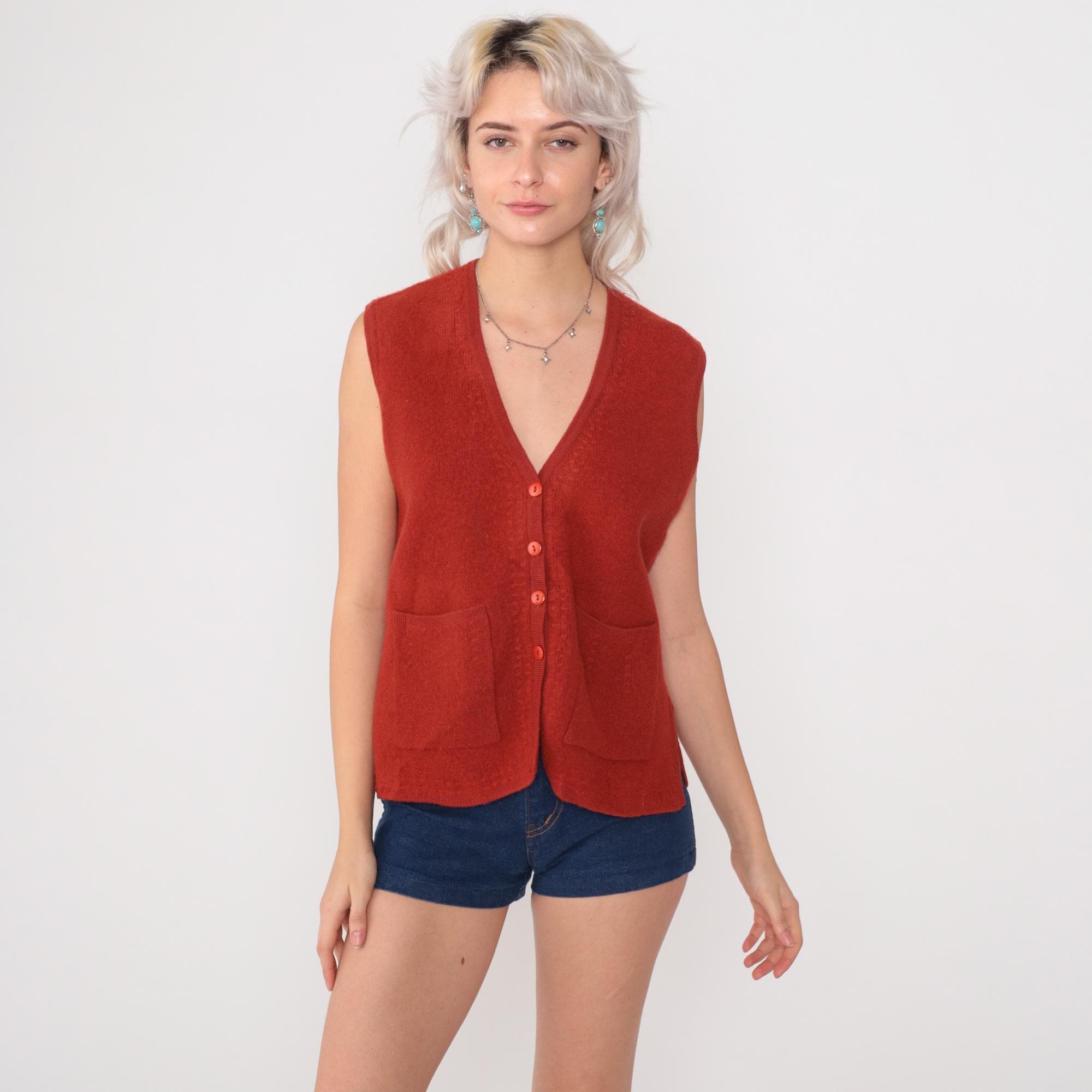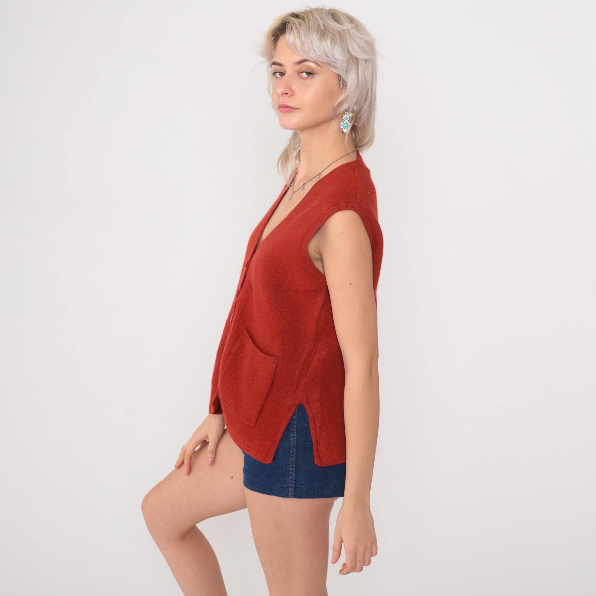 Vintage 70s rust wool sweater vest with button front closure and v-neckline. Features two front patch pockets and ribbed trim. Perfect for layering in a preppy or academic style.