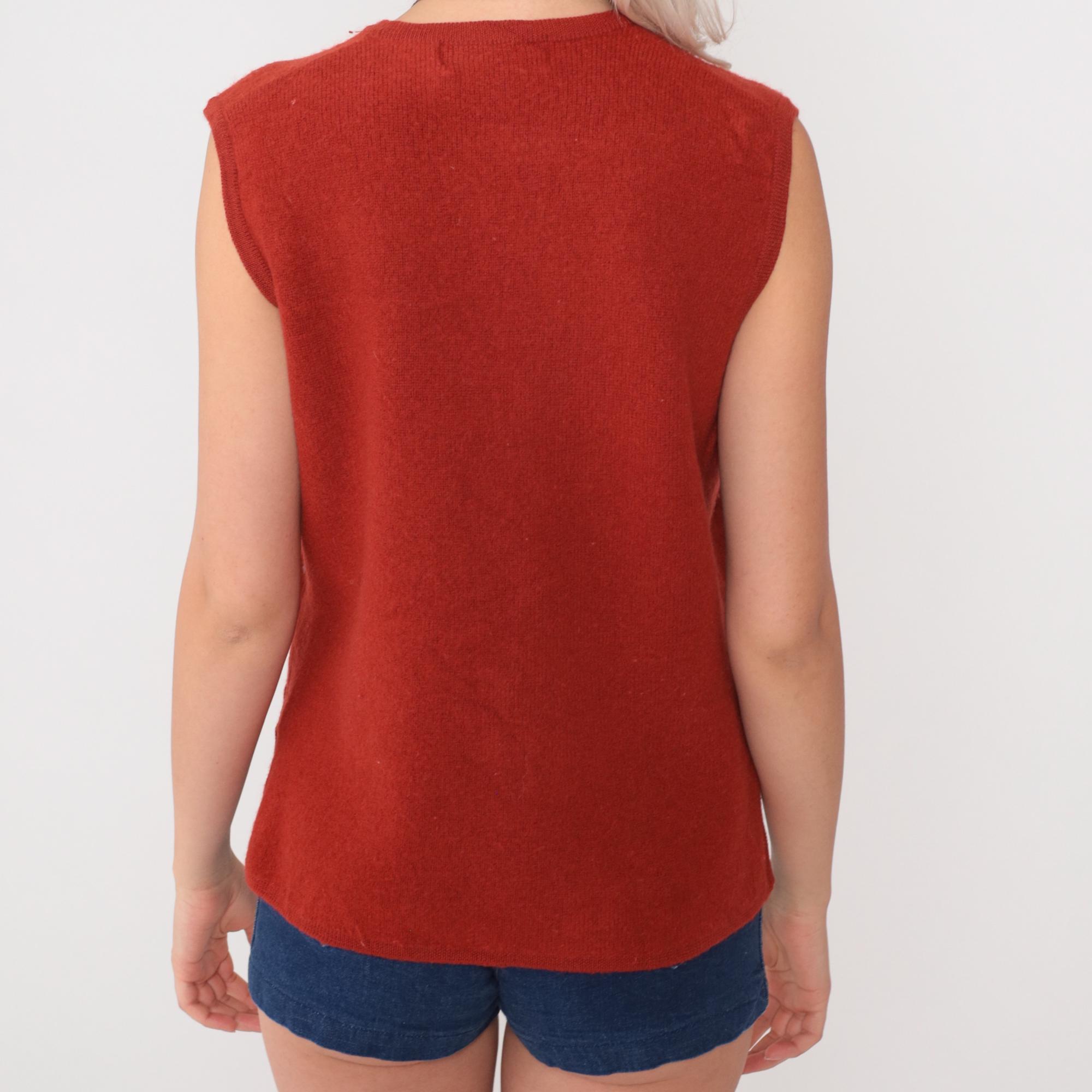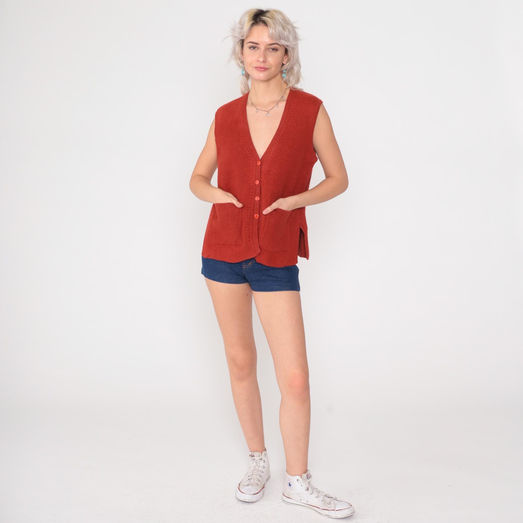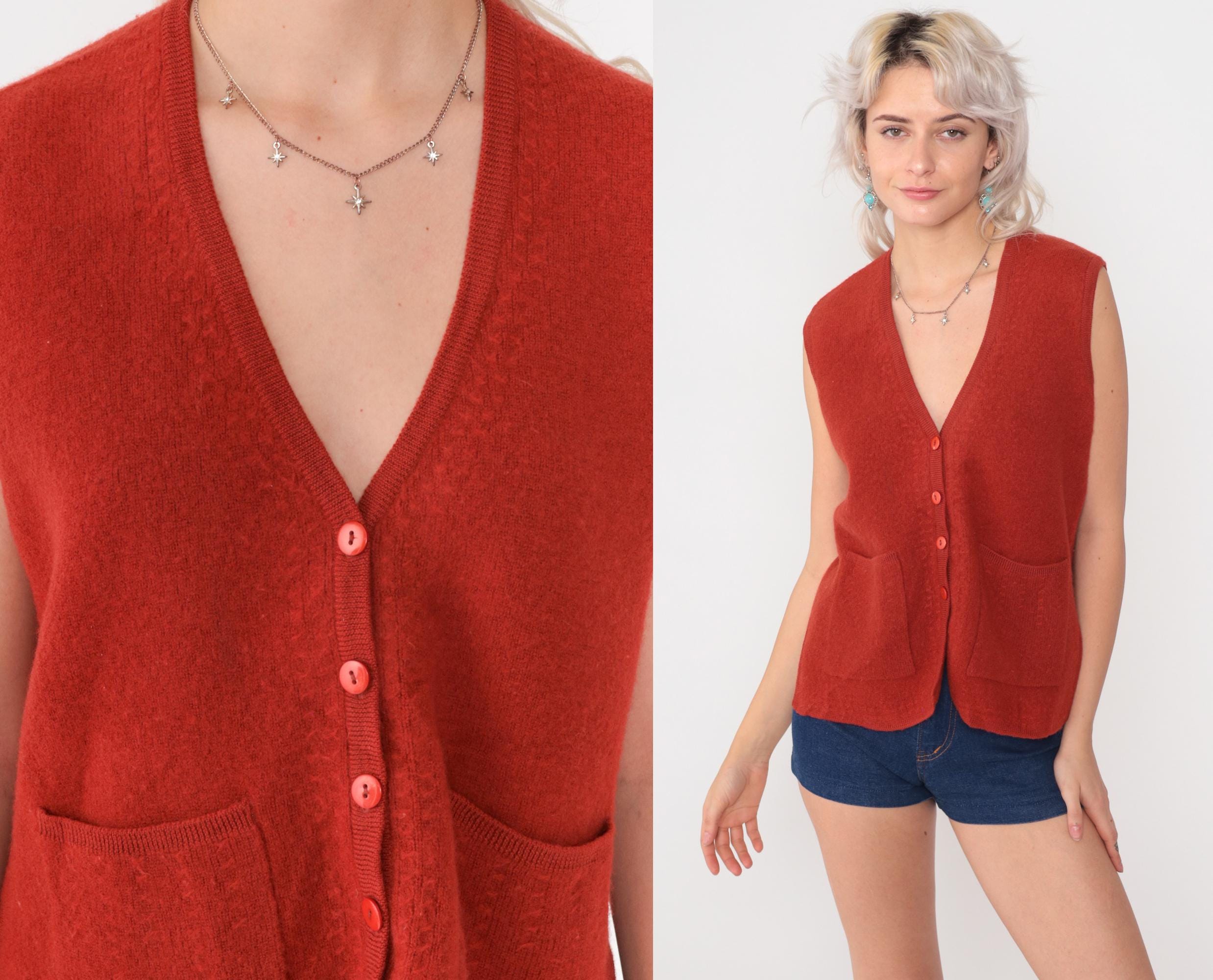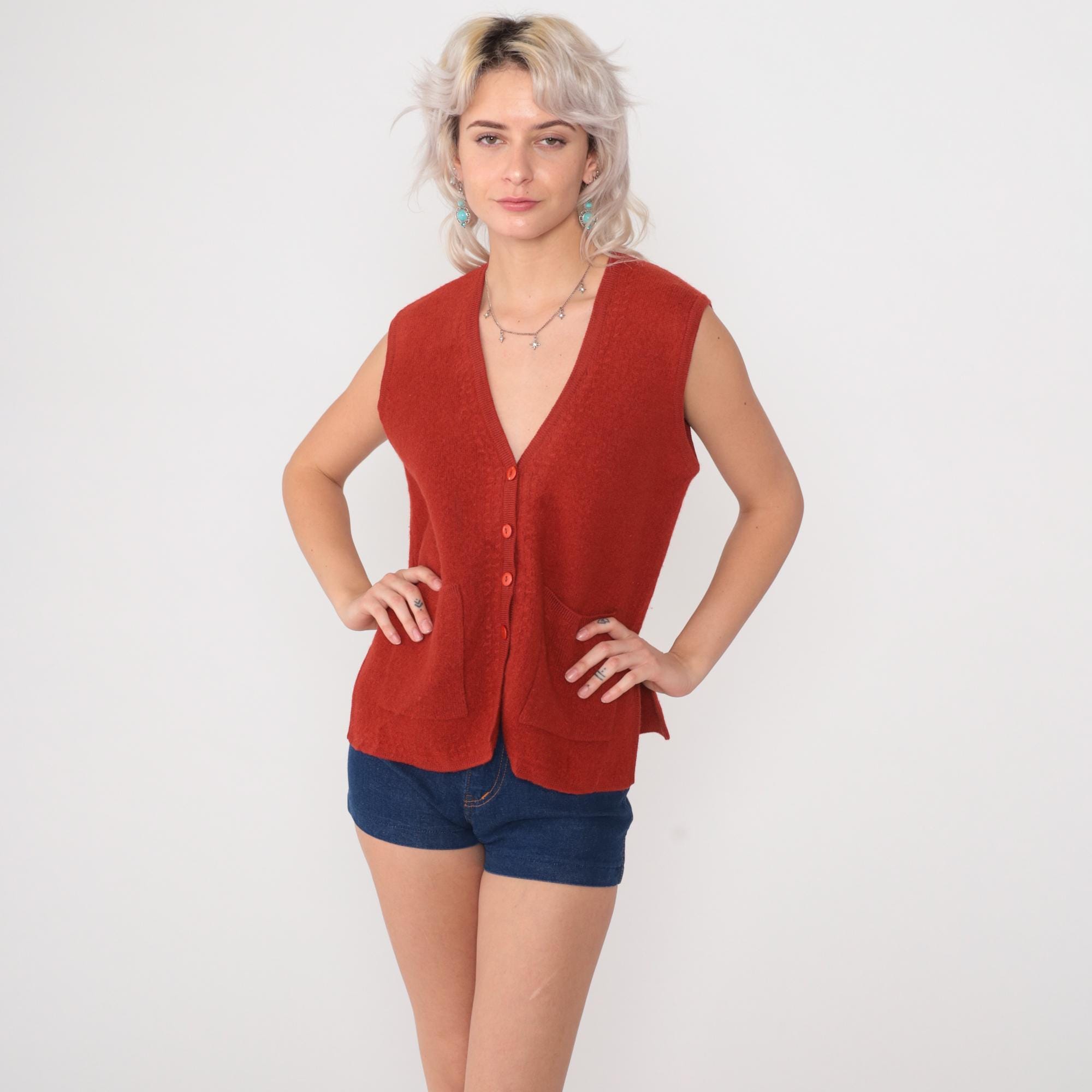 Vintage 70s rust wool sweater vest with button front closure and v-neckline. Features two front patch pockets and ribbed trim. Perfect for layering in a preppy or academic style.