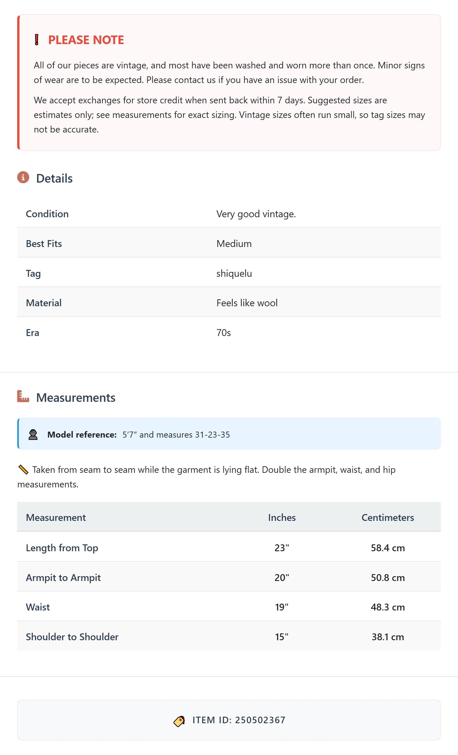 Suggested sizes are estimates only; see measurements for exact sizing. Vintage sizes often run small, so tag sizes may not be accurate.