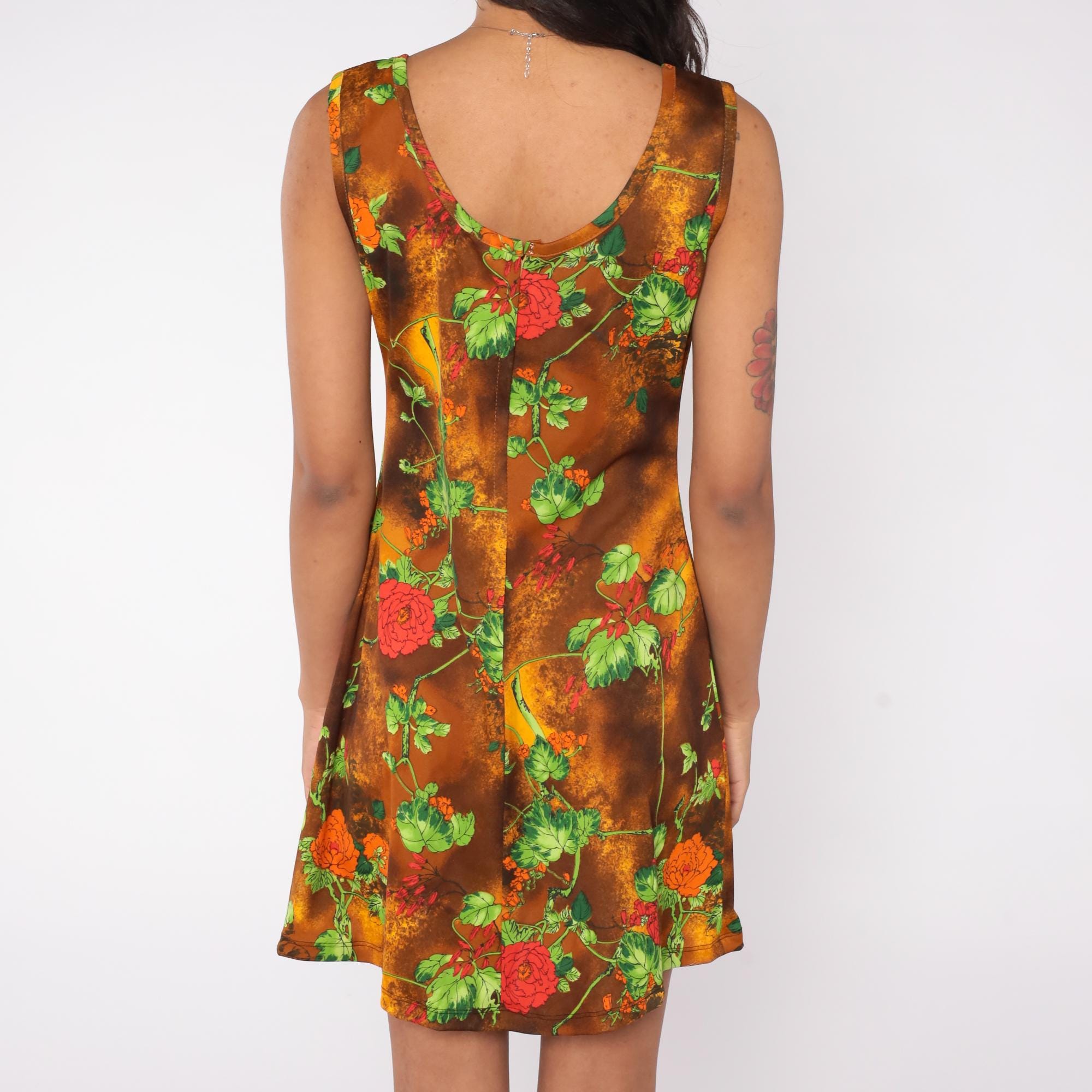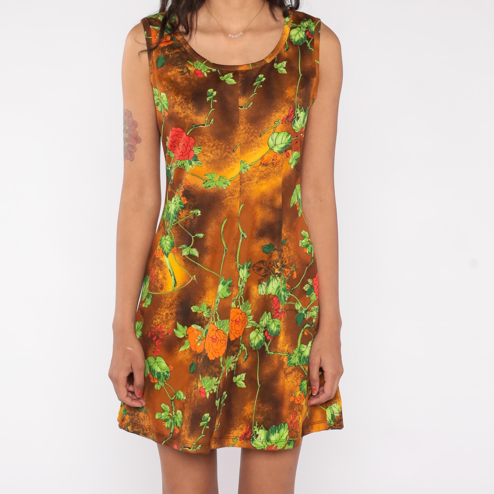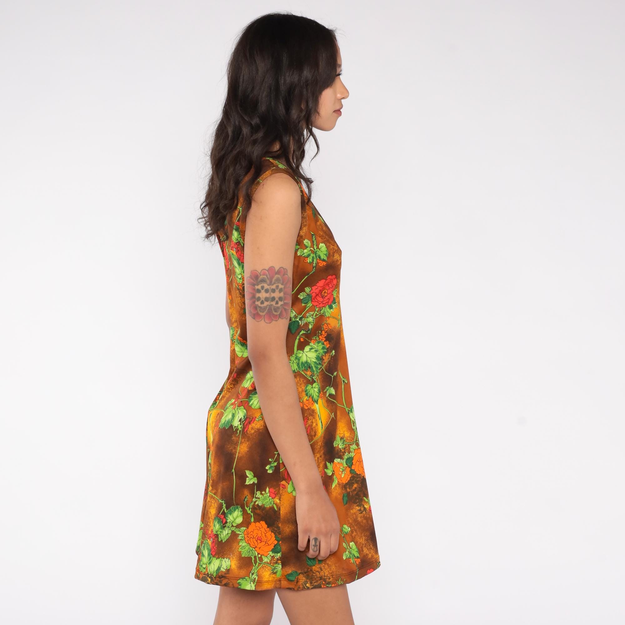 70s mini dress with burnt orange to amber gradient background. Features climbing roses in red-orange tones with bright green leaves. Sleeveless with scoop neck and straight hem.