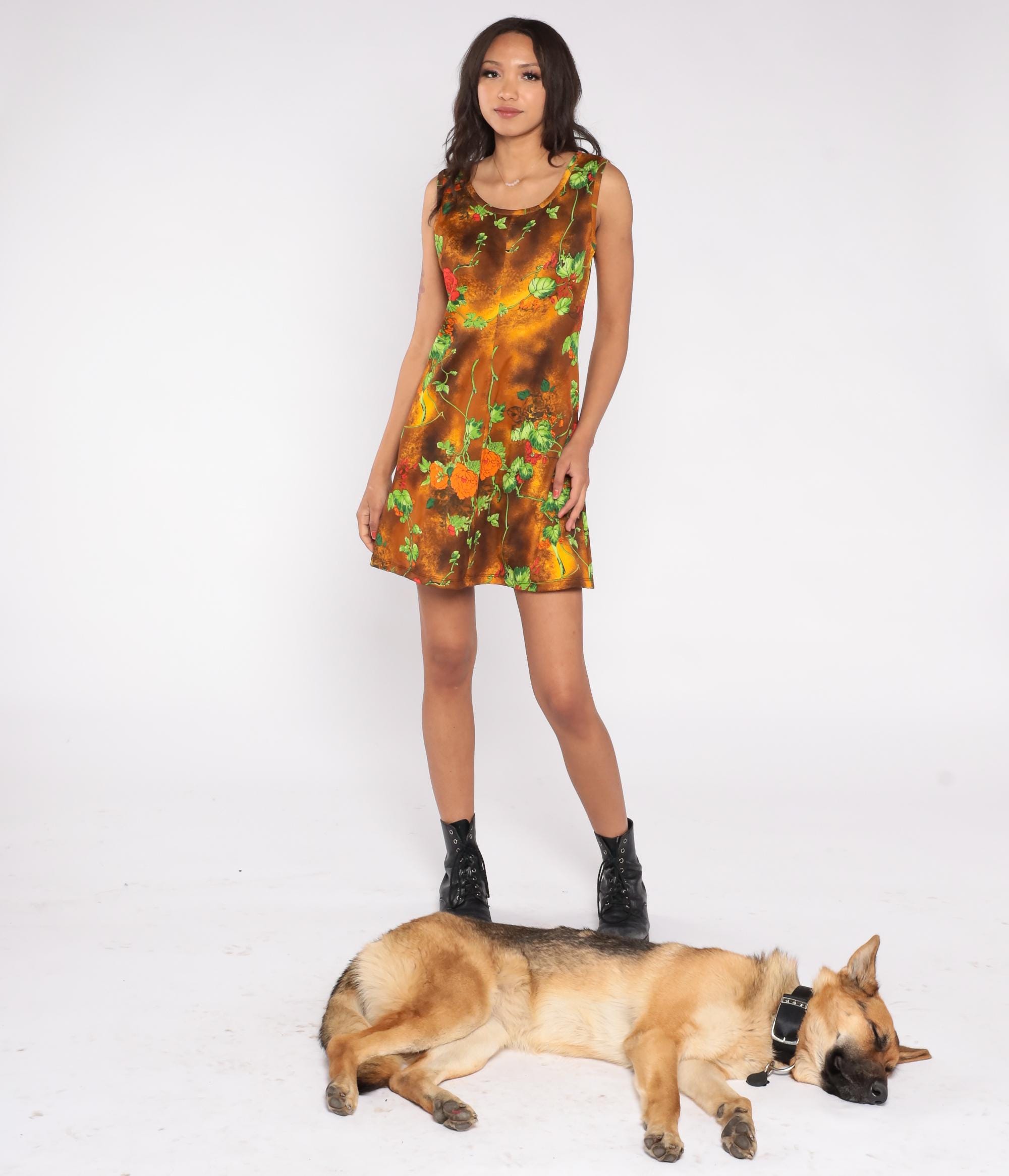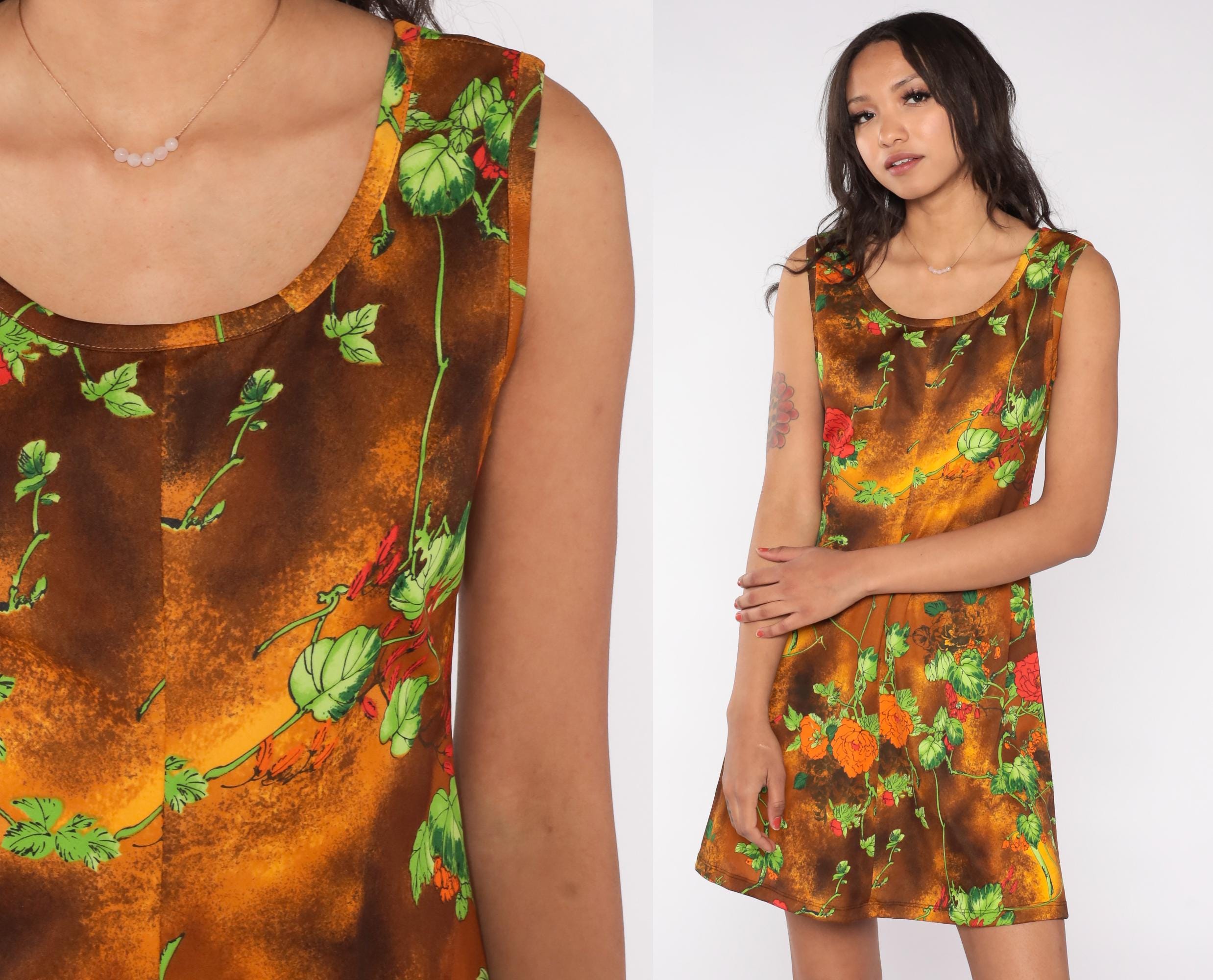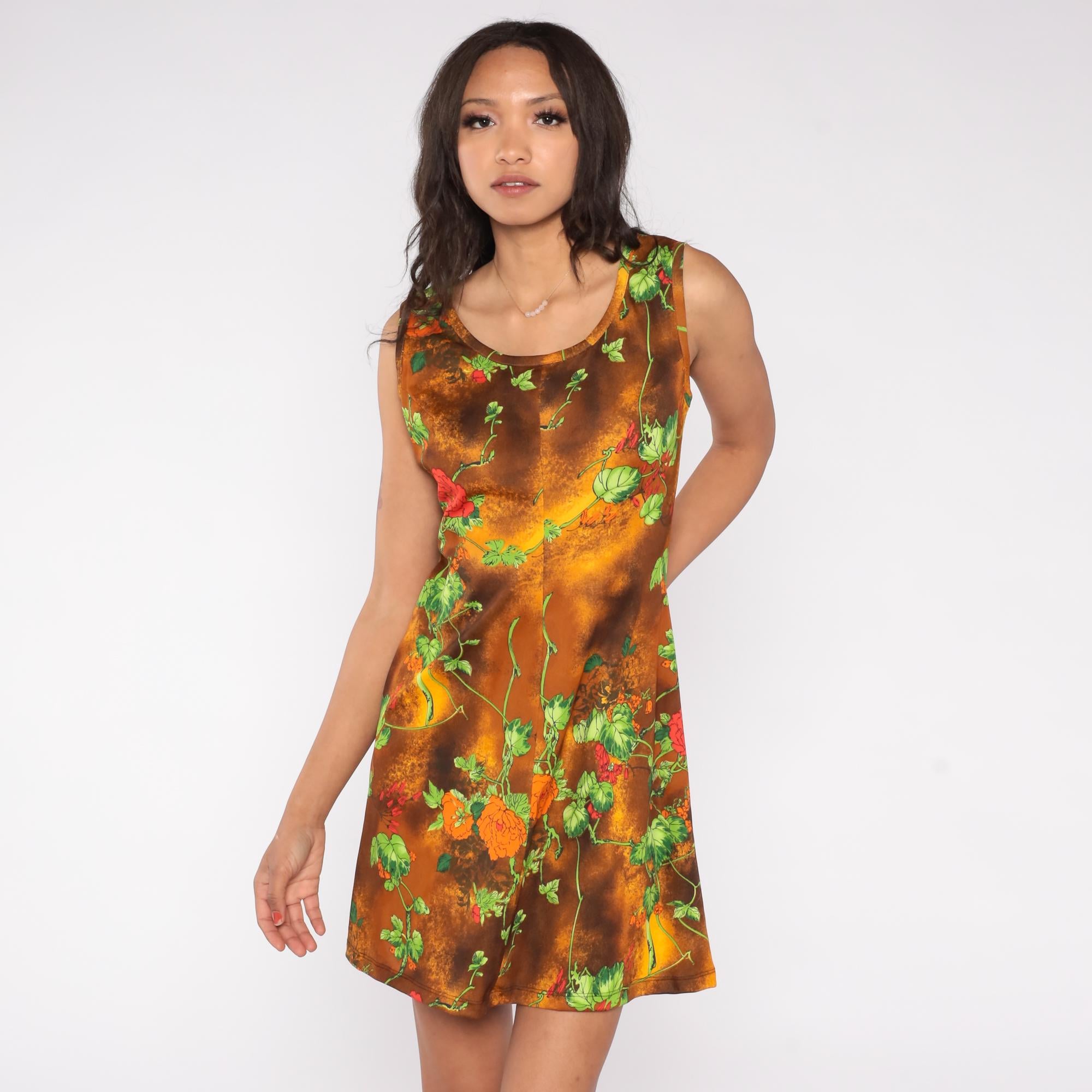 70s mini dress with burnt orange to amber gradient background. Features climbing roses in red-orange tones with bright green leaves. Sleeveless with scoop neck and straight hem.