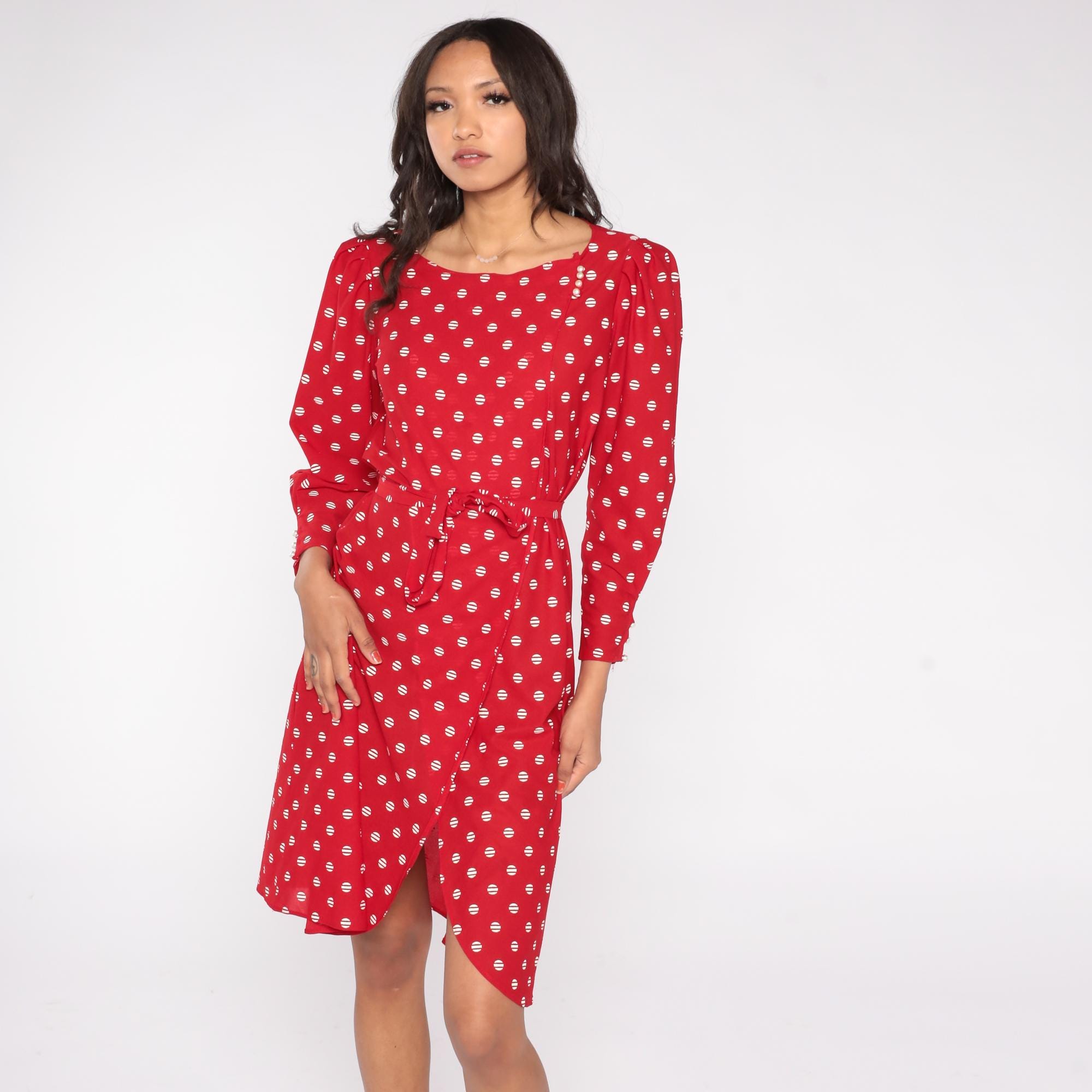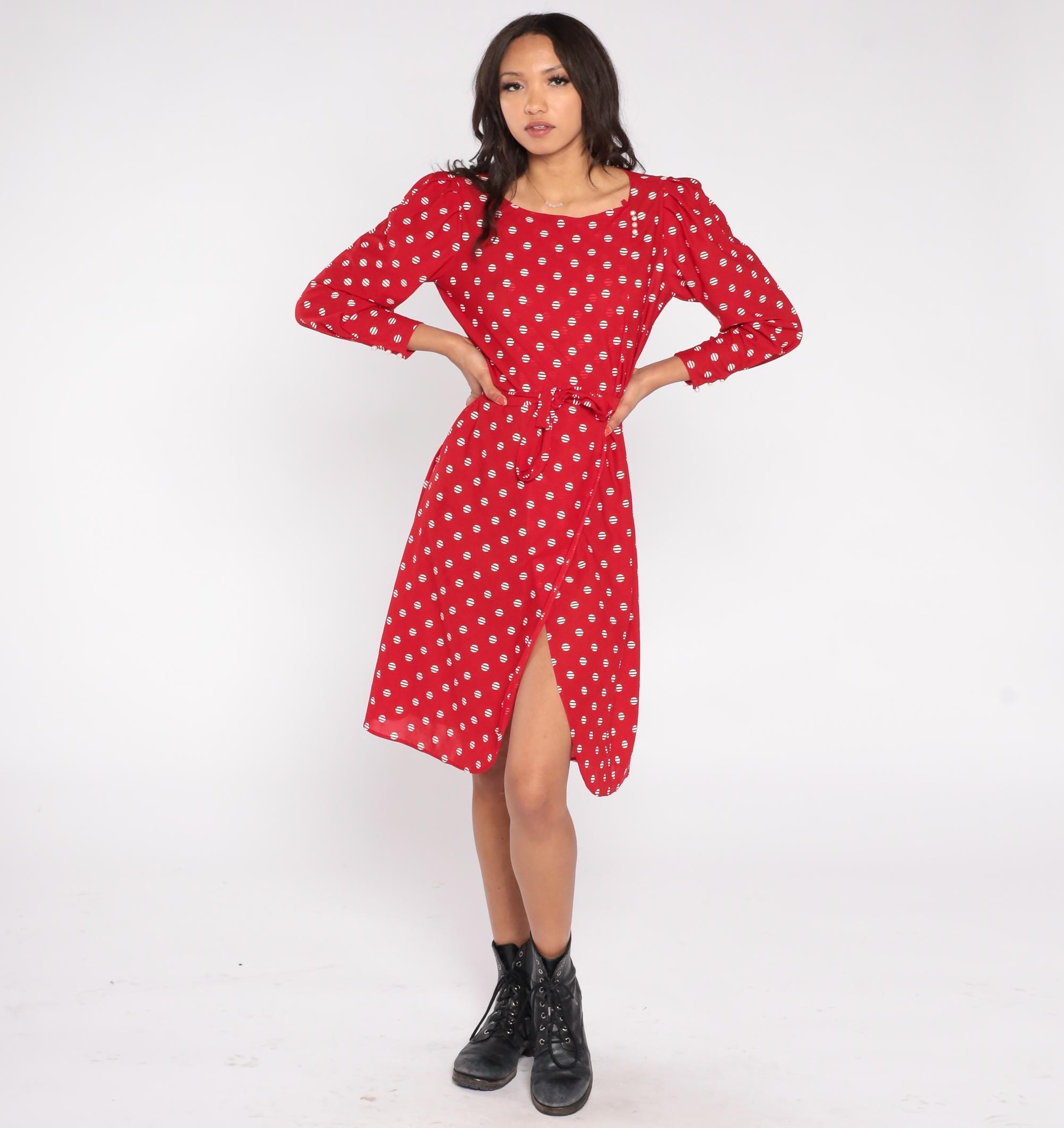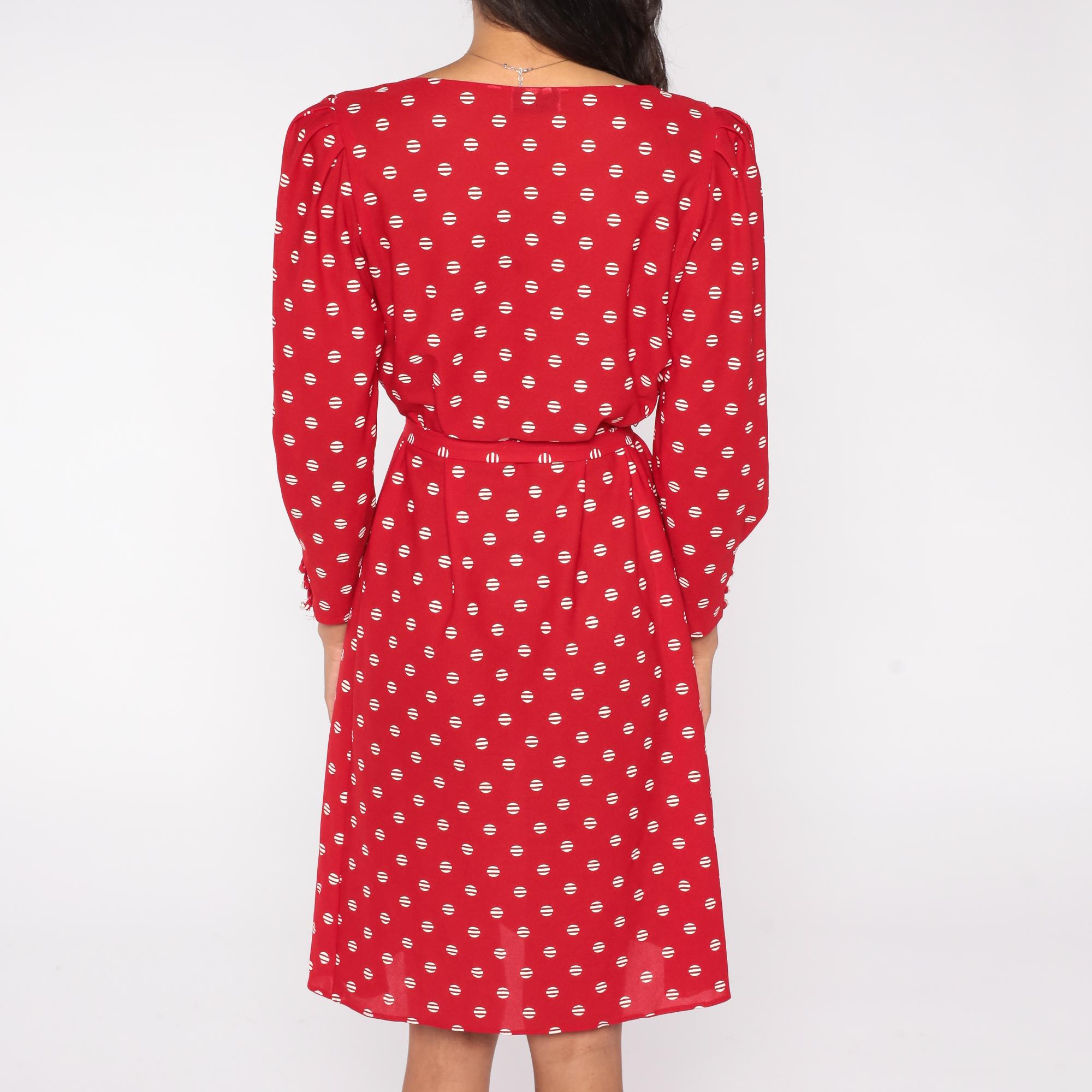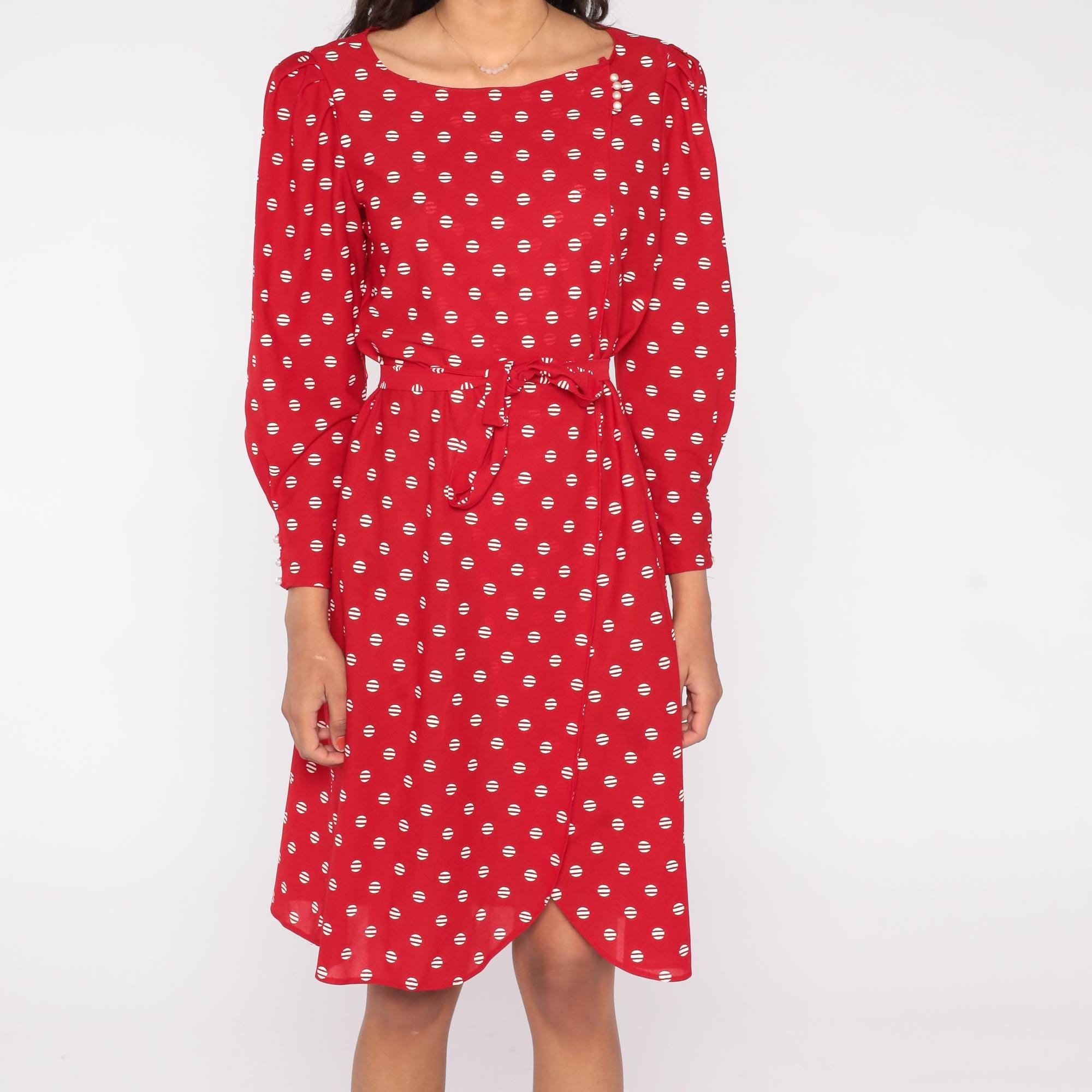 80s red dress by Jane Baar New York with white circle print. Features long sleeves with slight puff at shoulder, ties at waist with belt, and faux wrap skirt with front slit.
