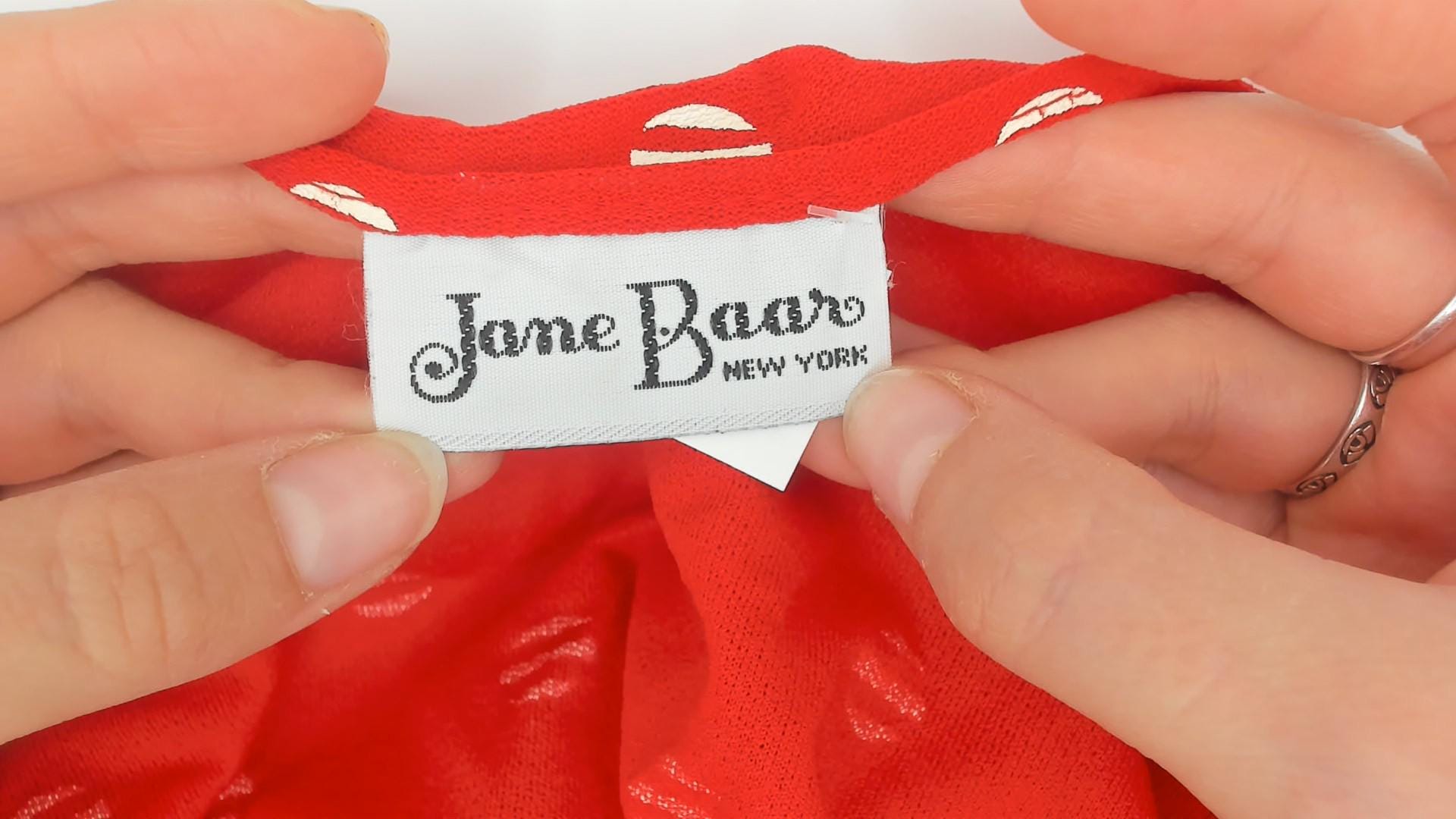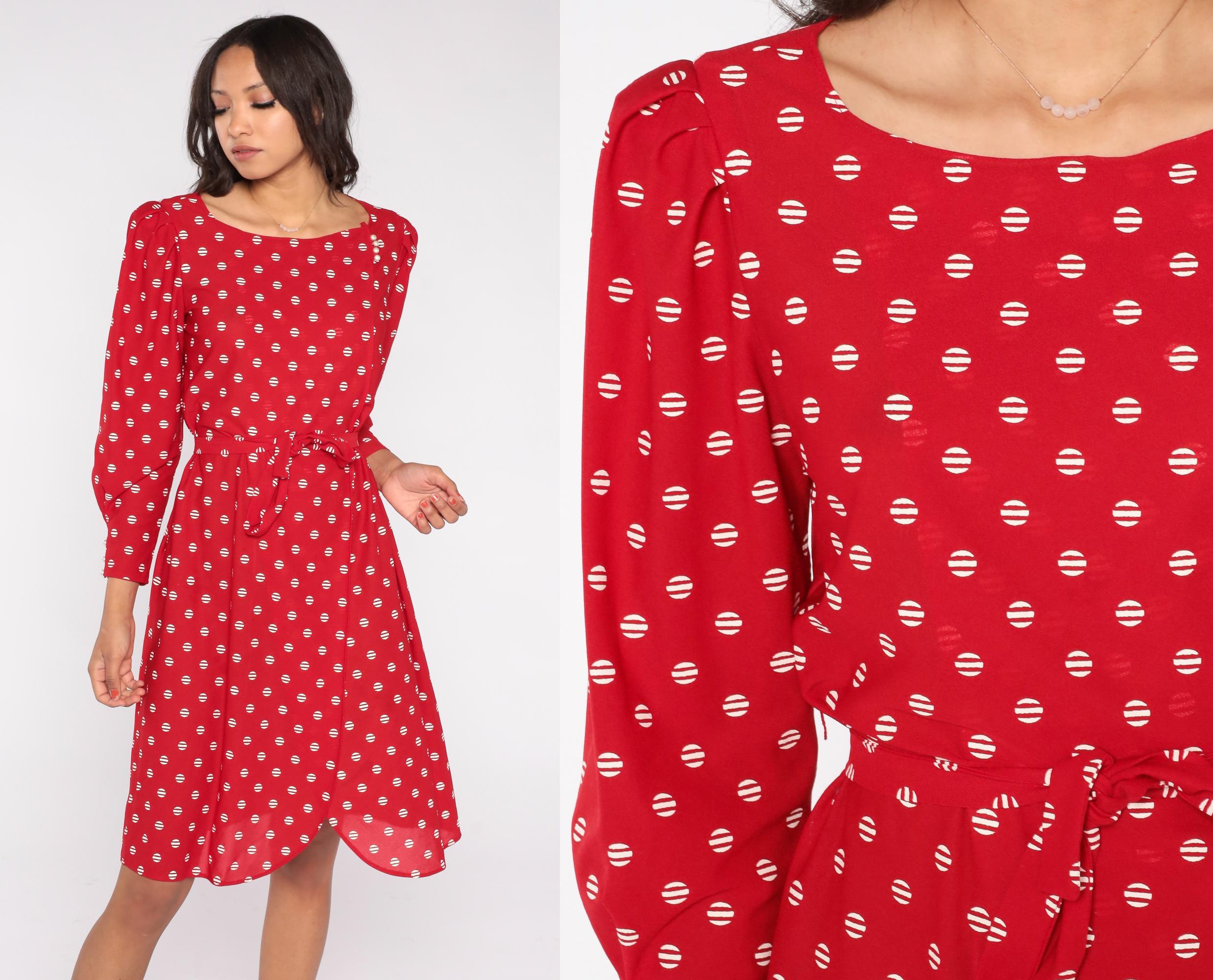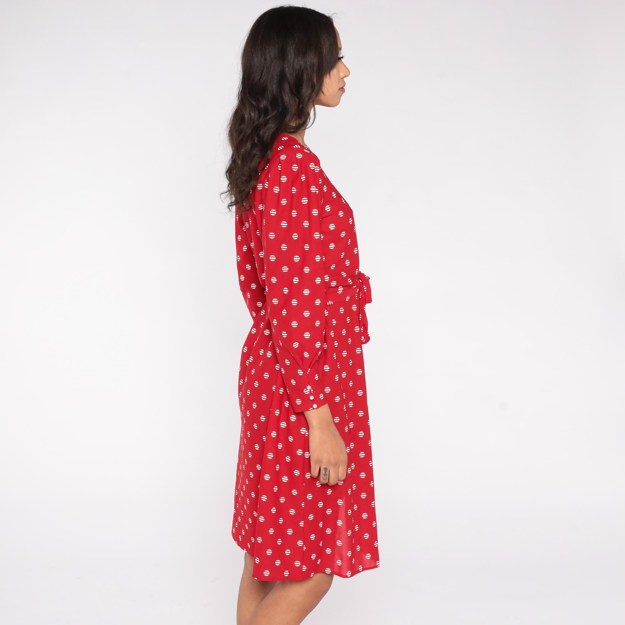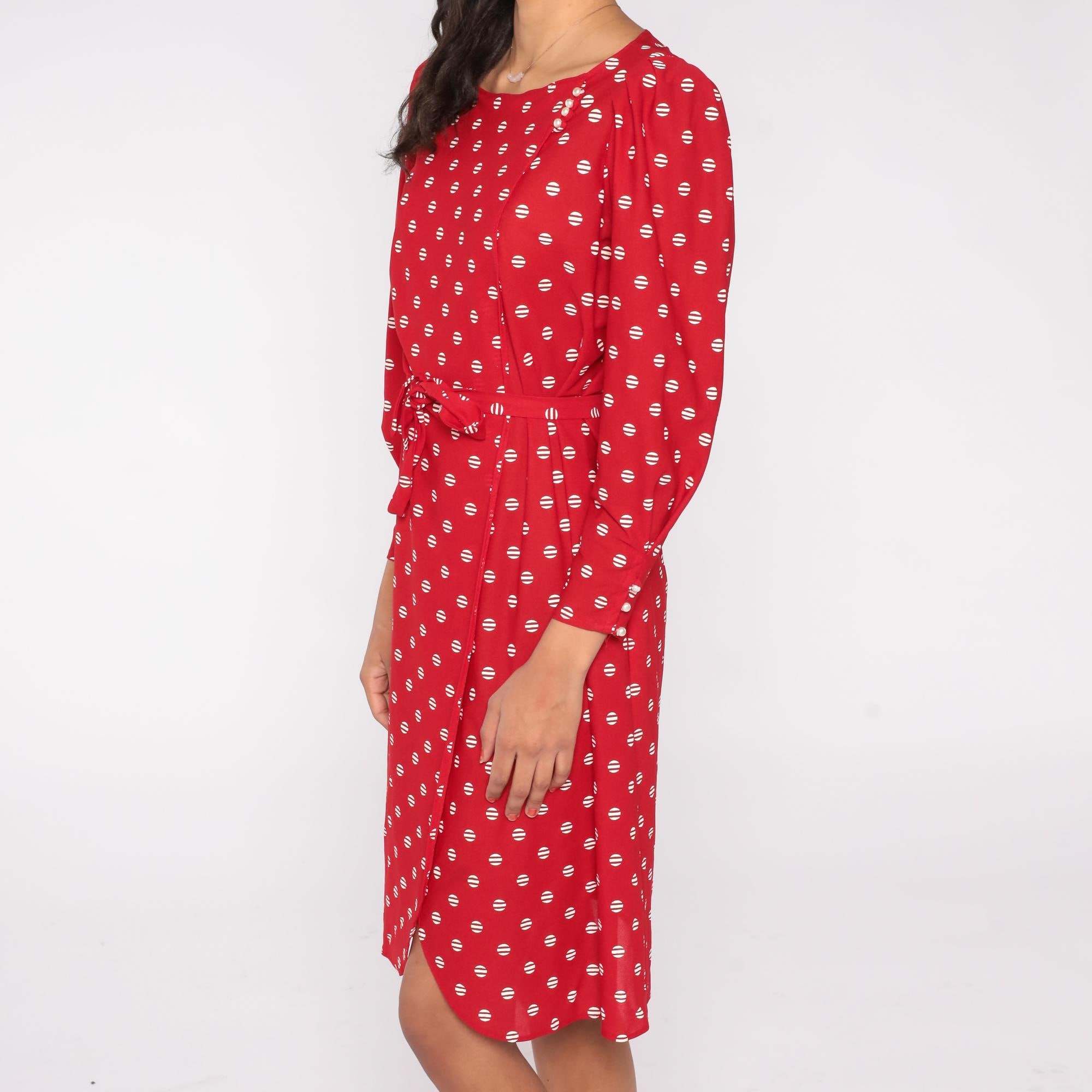 80s red dress by Jane Baar New York with white circle print. Features long sleeves with slight puff at shoulder, ties at waist with belt, and faux wrap skirt with front slit.