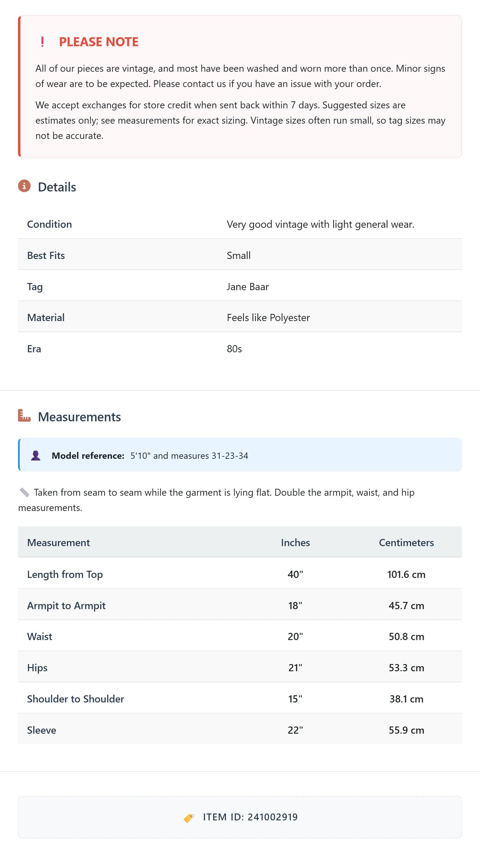 Suggested sizes are estimates only; see measurements for exact sizing. Vintage sizes often run small, so tag sizes may not be accurate.