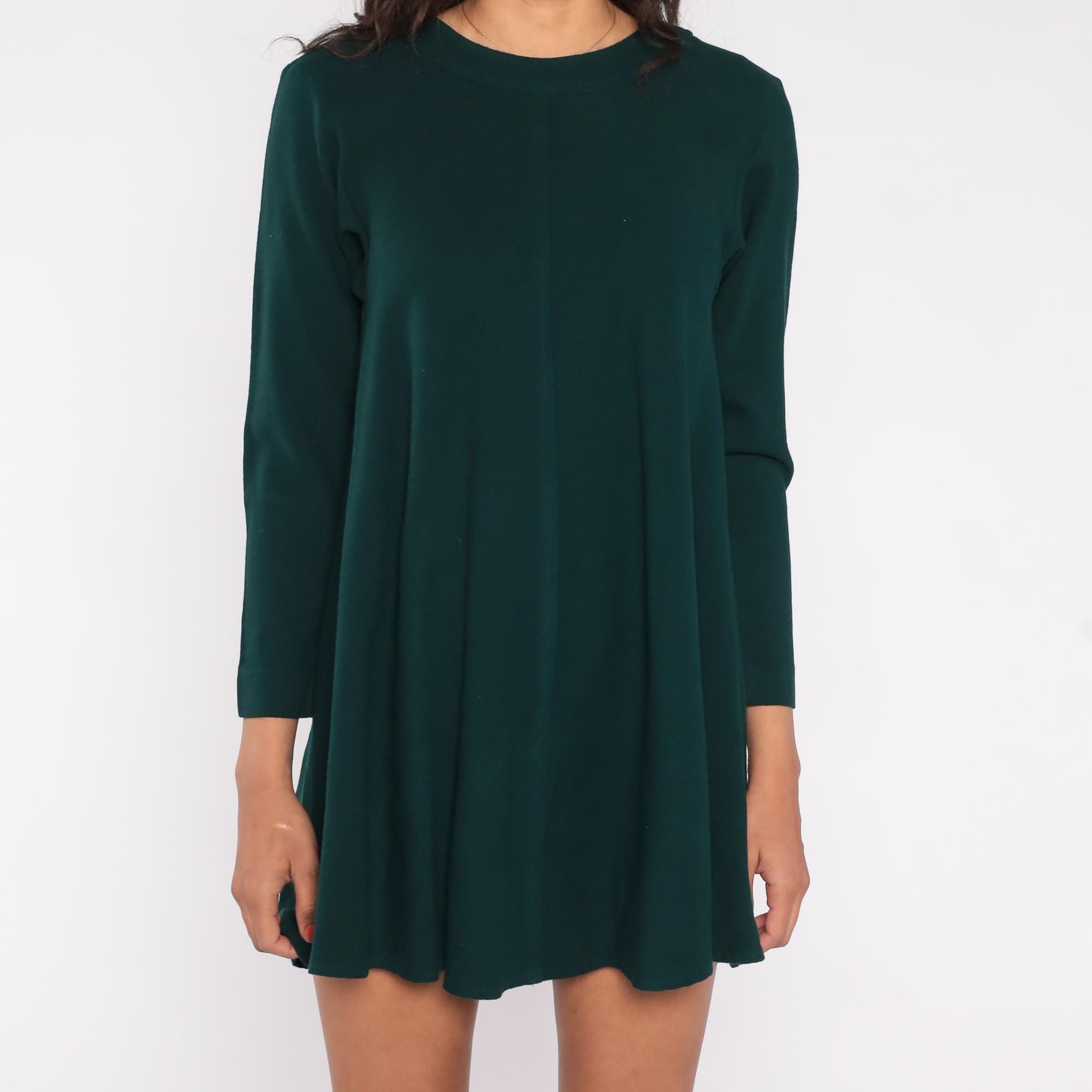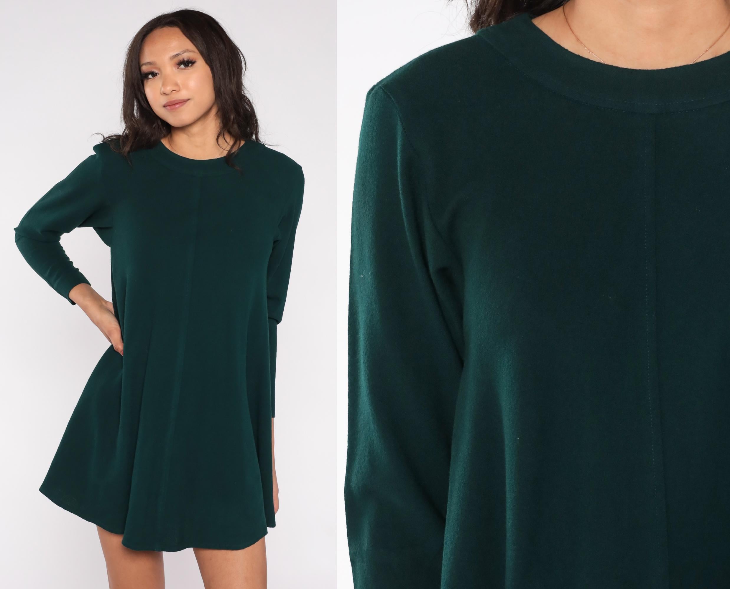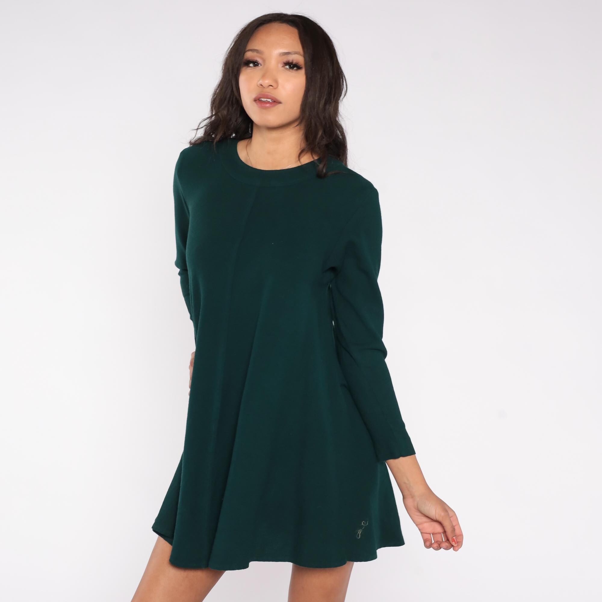 90s forest green mini dress by Kathryn Conover New York. Features A-line silhouette, long sleeves, crew neck, and back zipper.