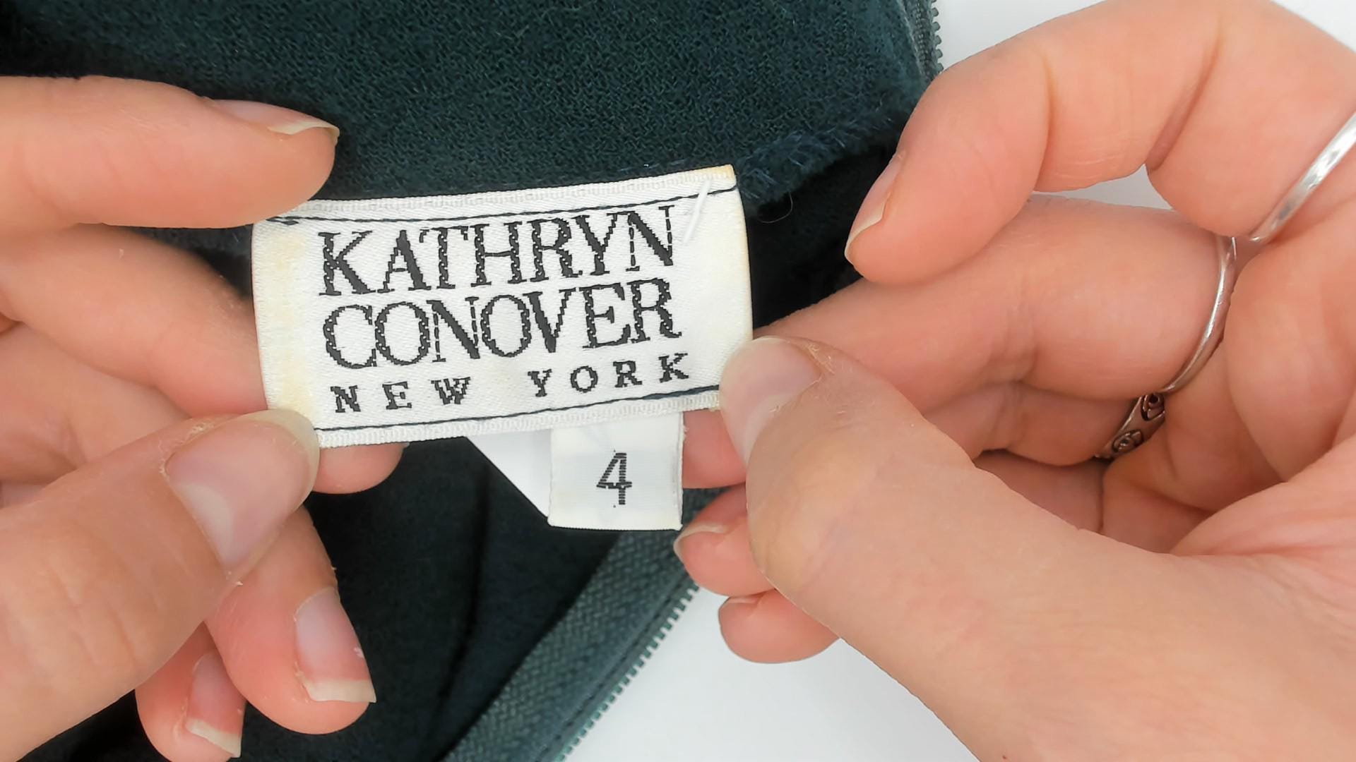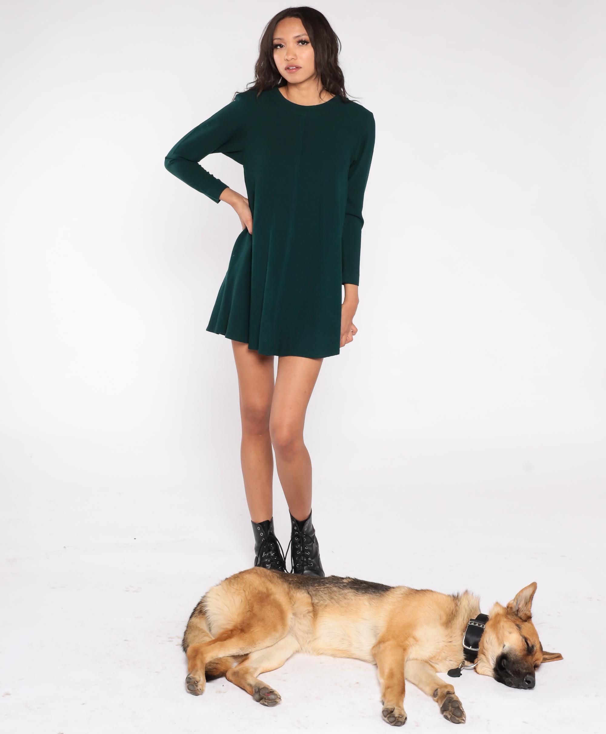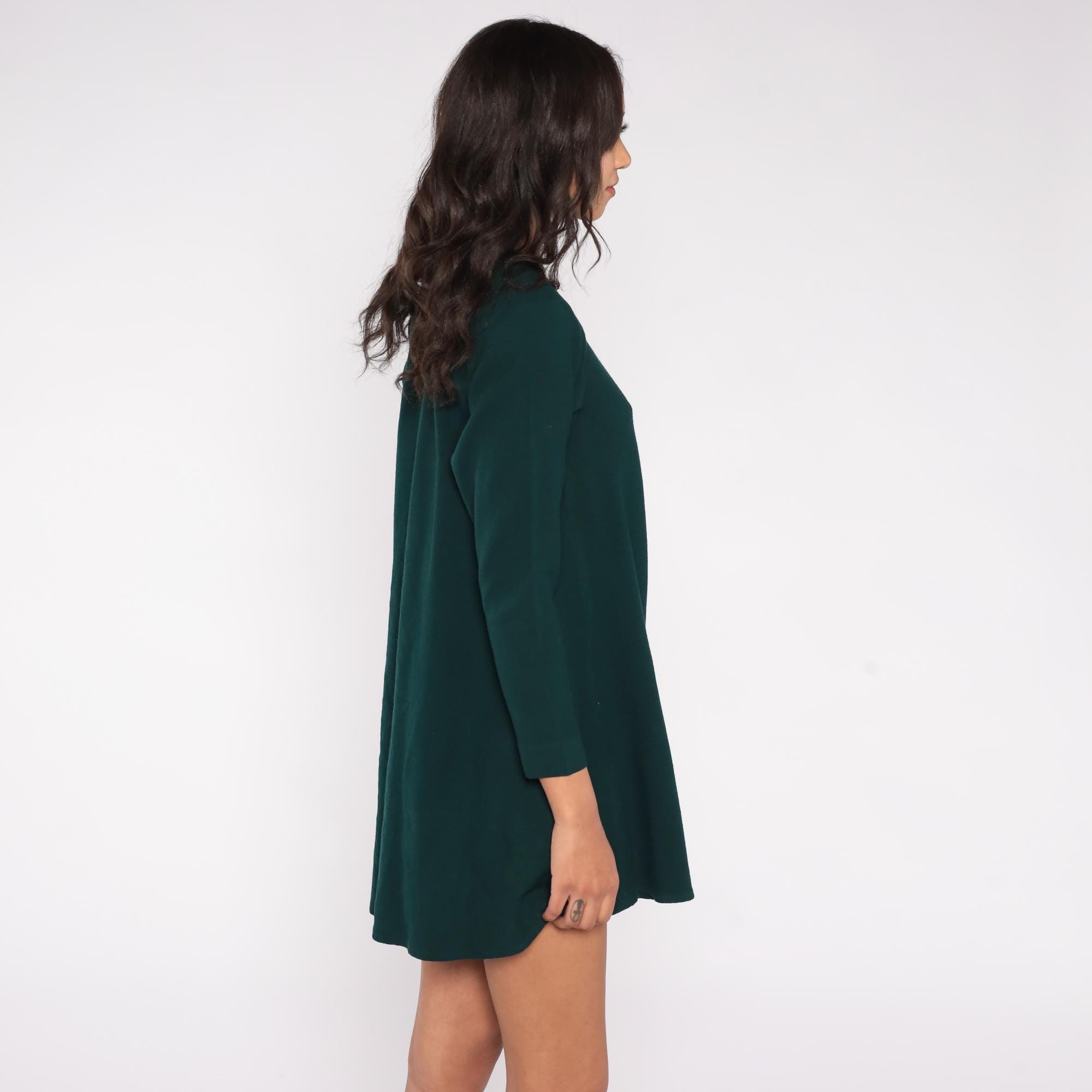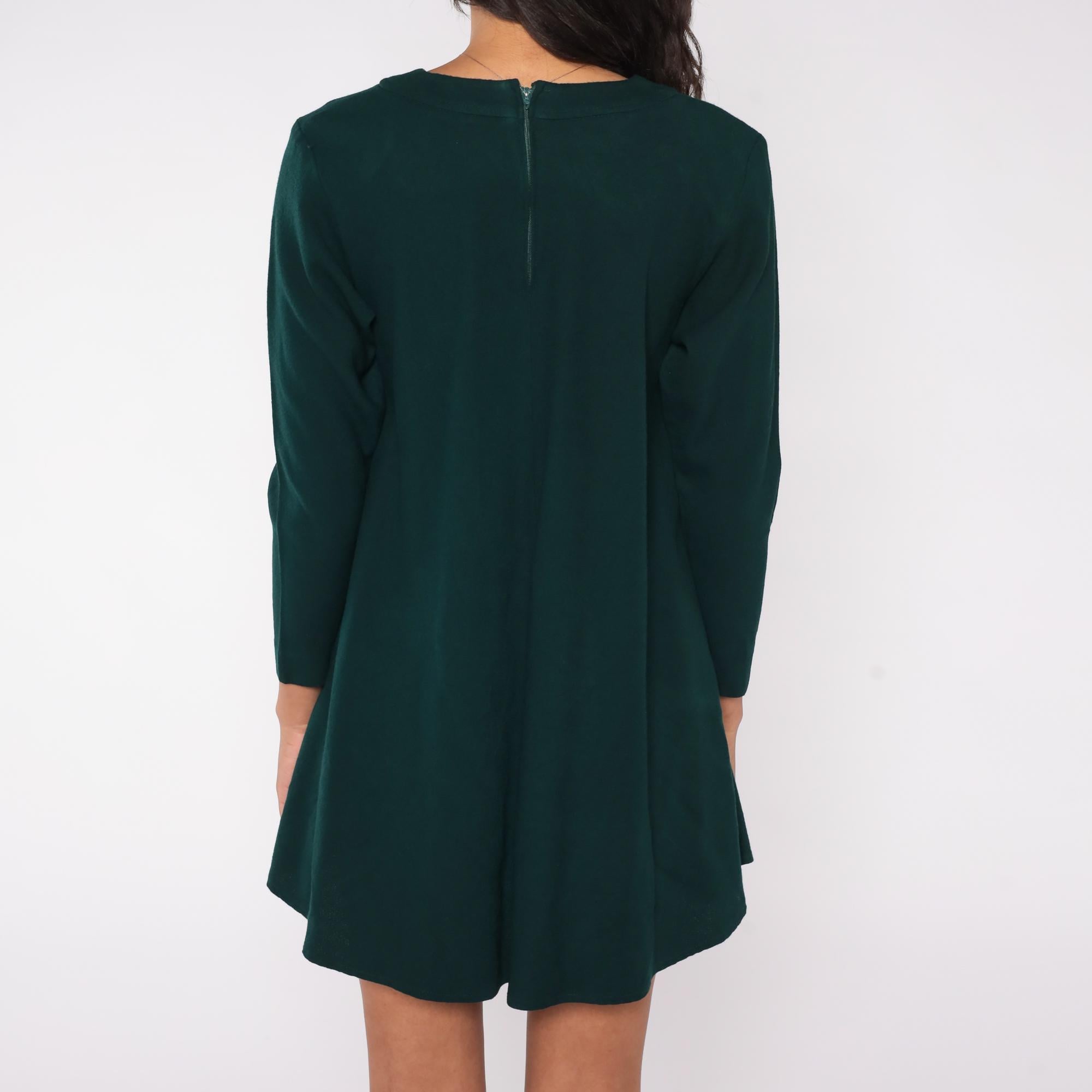 90s forest green mini dress by Kathryn Conover New York. Features A-line silhouette, long sleeves, crew neck, and back zipper.
