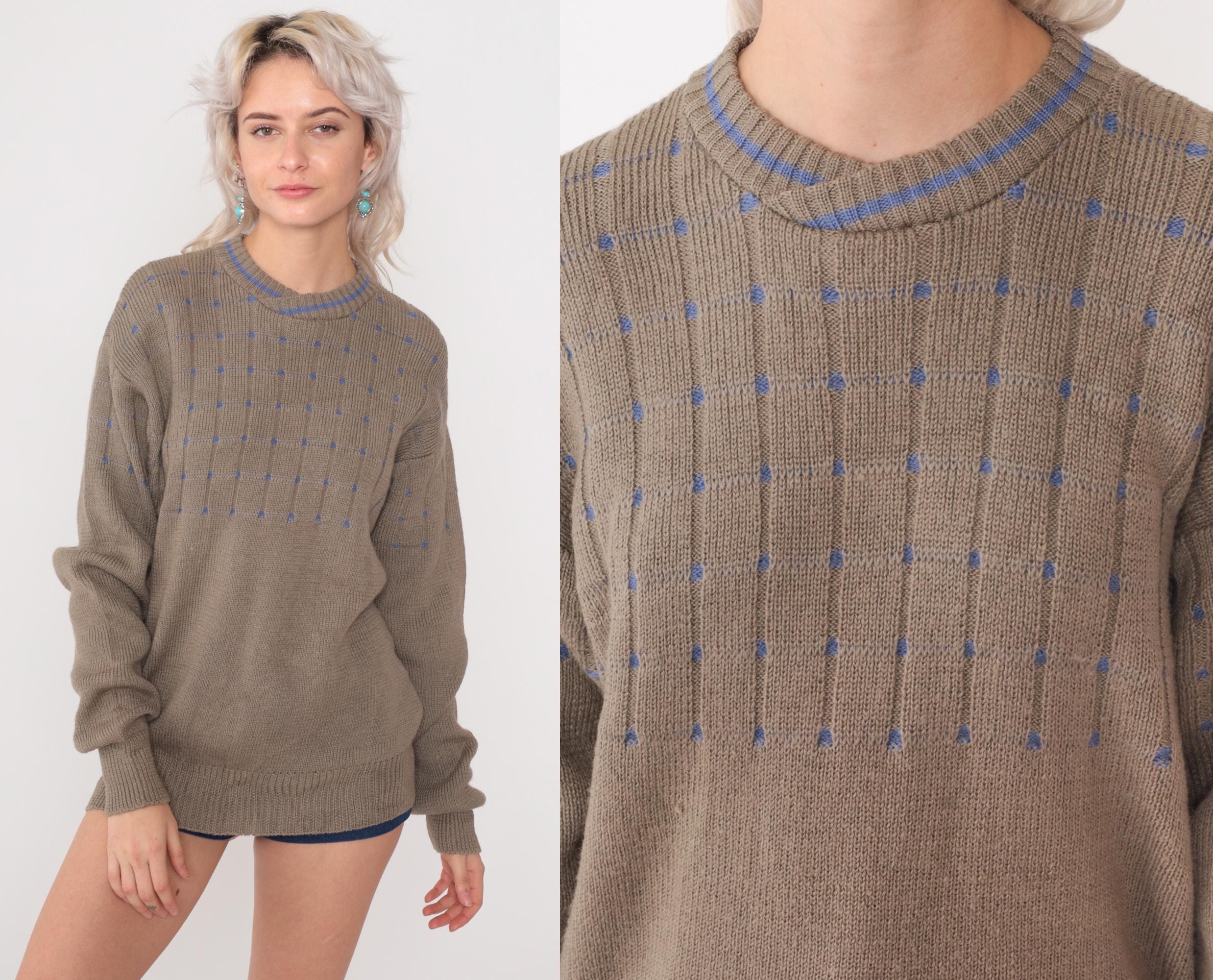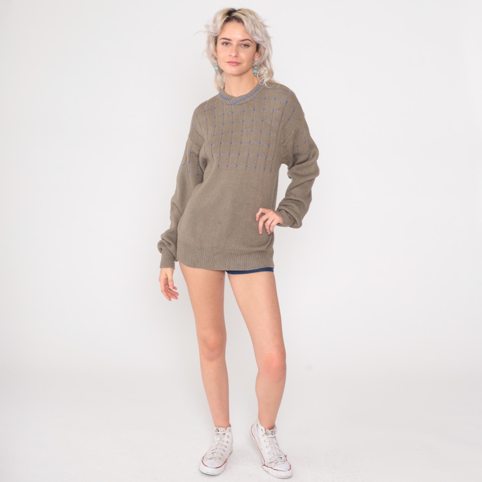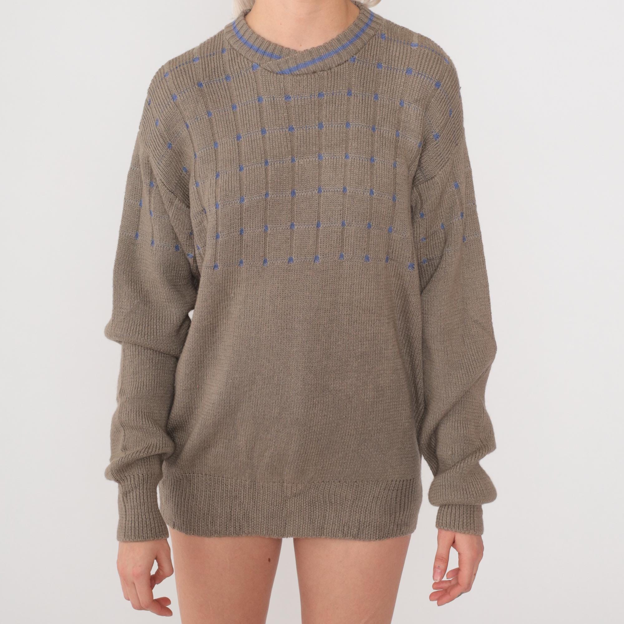 Vintage 80s wool sweater with a distinctive blue grid pattern on a taupe tan background. It features a crewneck design, drop shoulder silhouette, and oversized fit. Ribbed collar, cuffs, and hem.