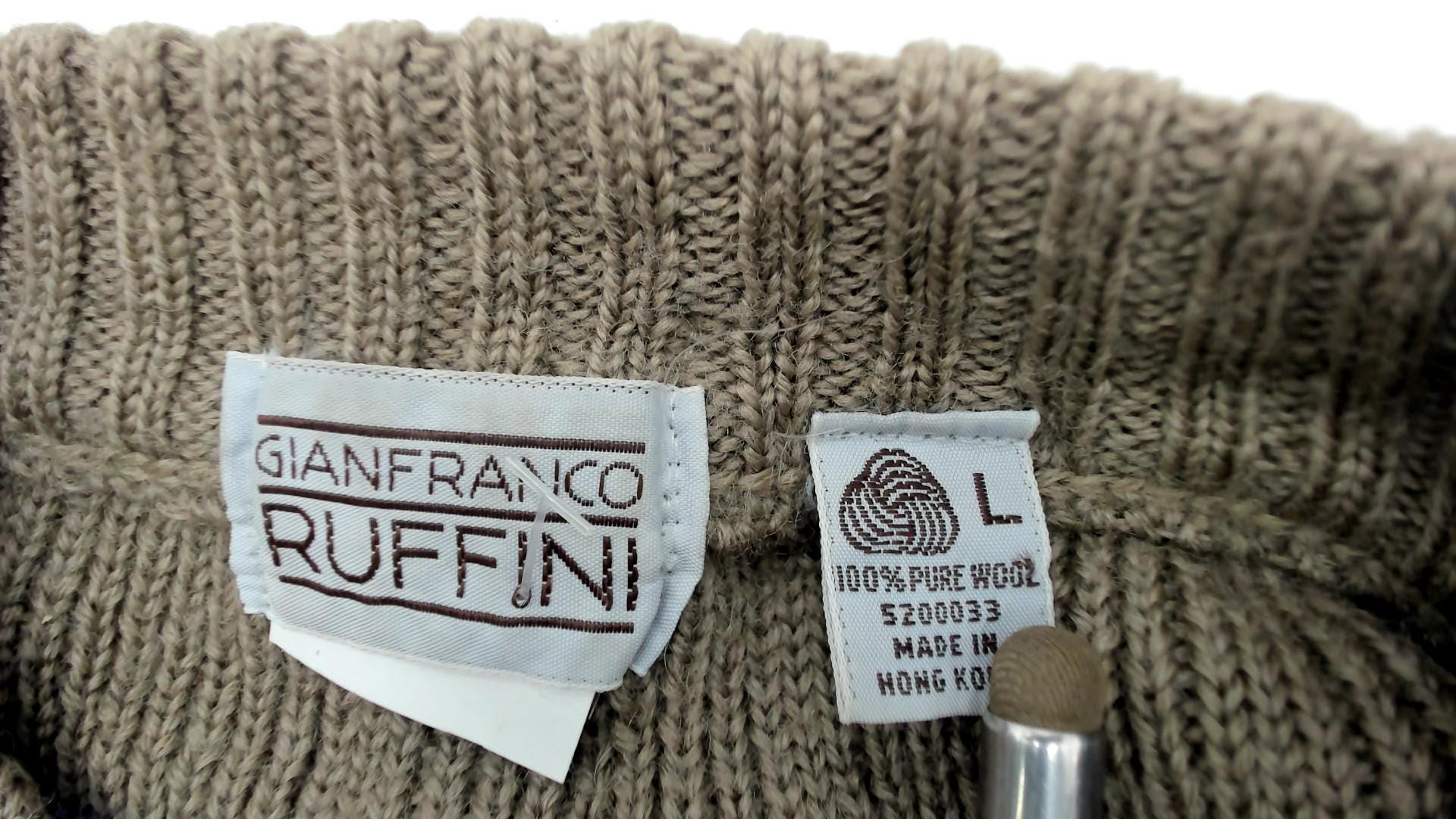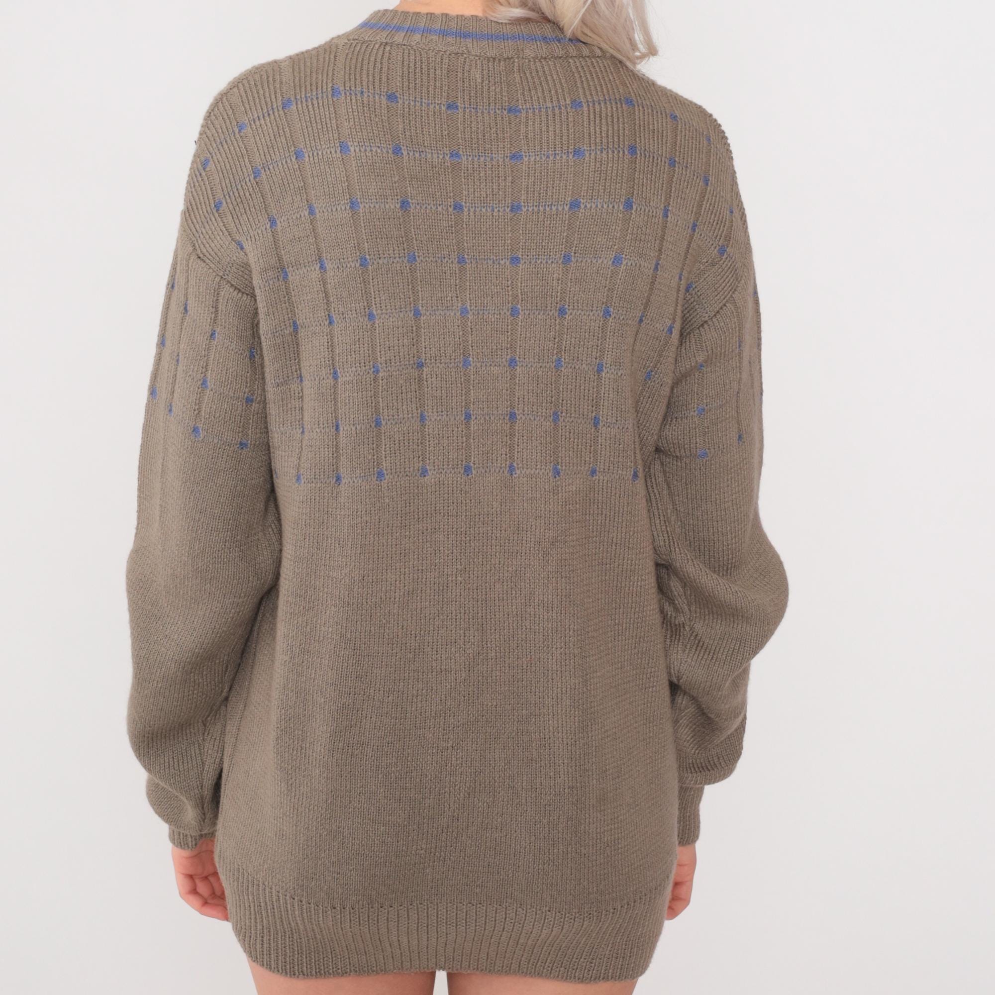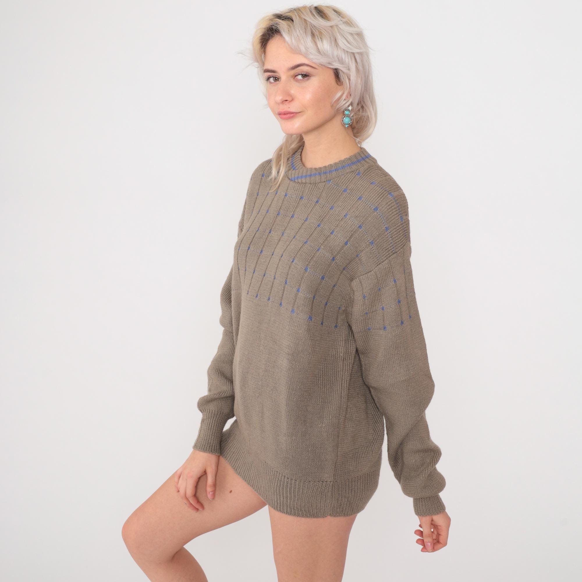 Vintage 80s wool sweater with a distinctive blue grid pattern on a taupe tan background. It features a crewneck design, drop shoulder silhouette, and oversized fit. Ribbed collar, cuffs, and hem.