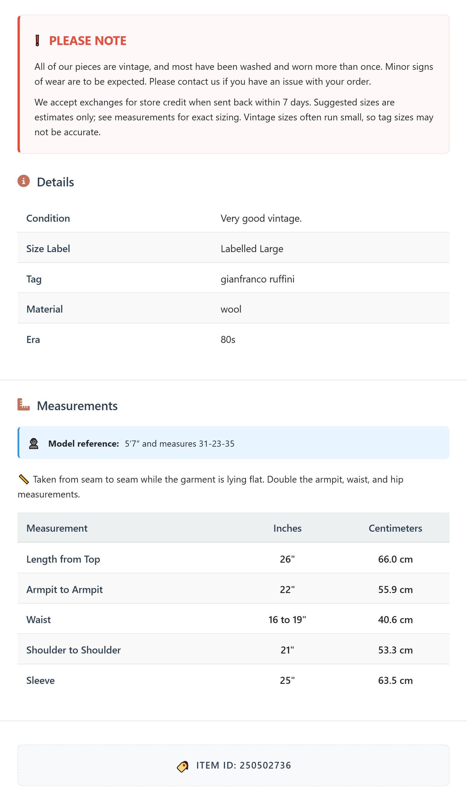 Suggested sizes are estimates only; see measurements for exact sizing. Vintage sizes often run small, so tag sizes may not be accurate.