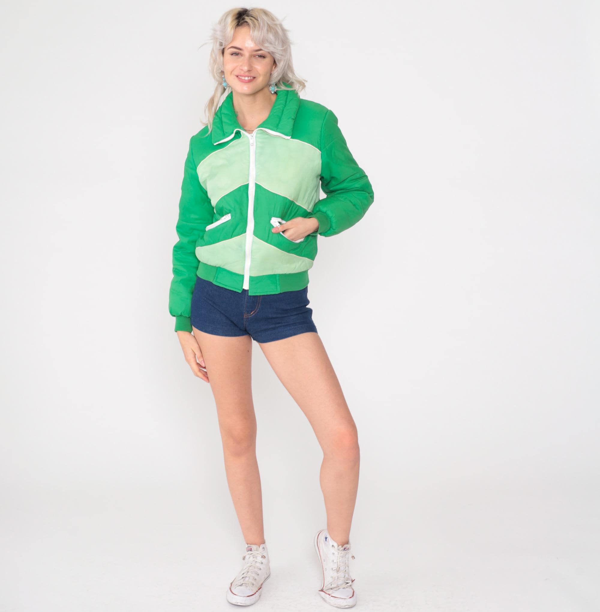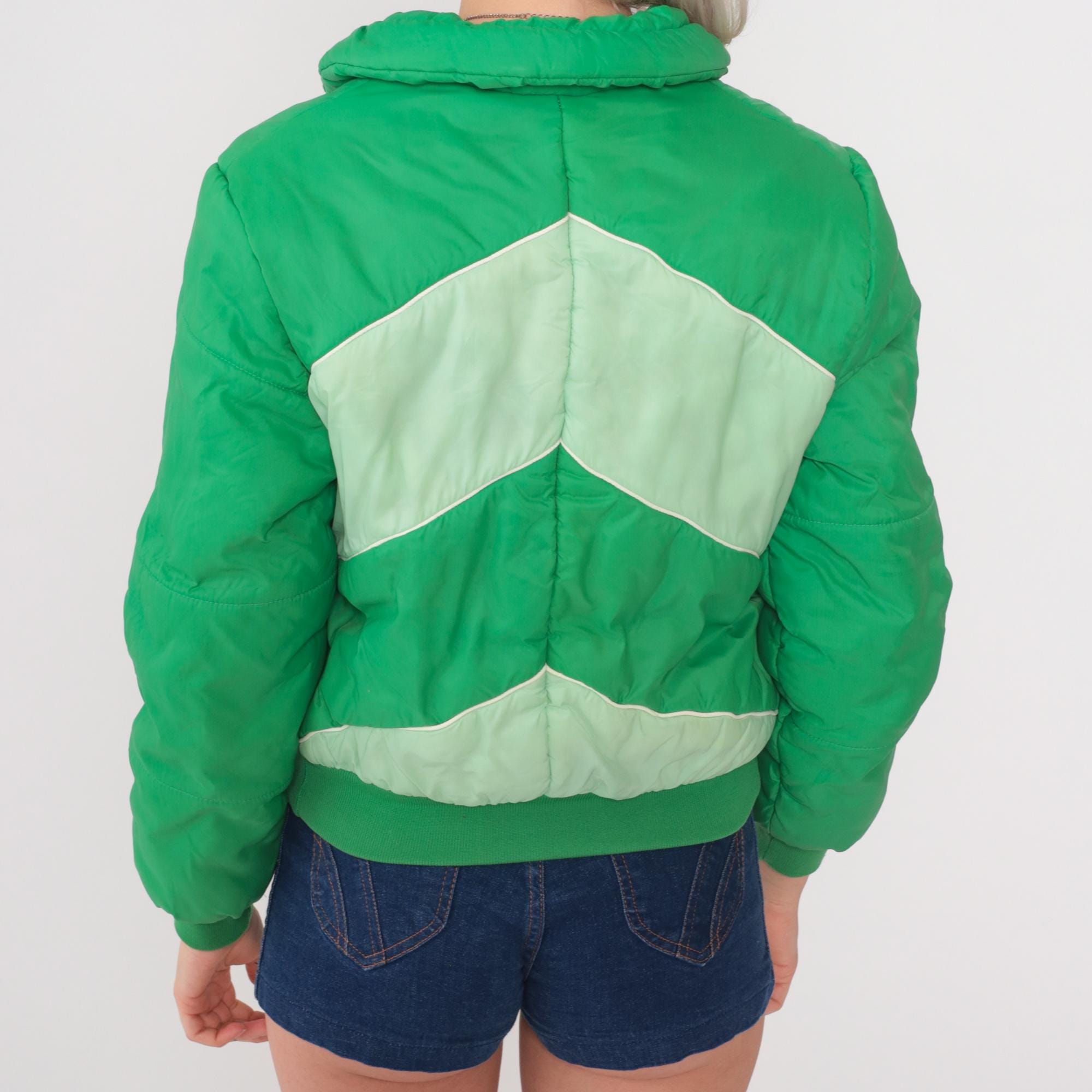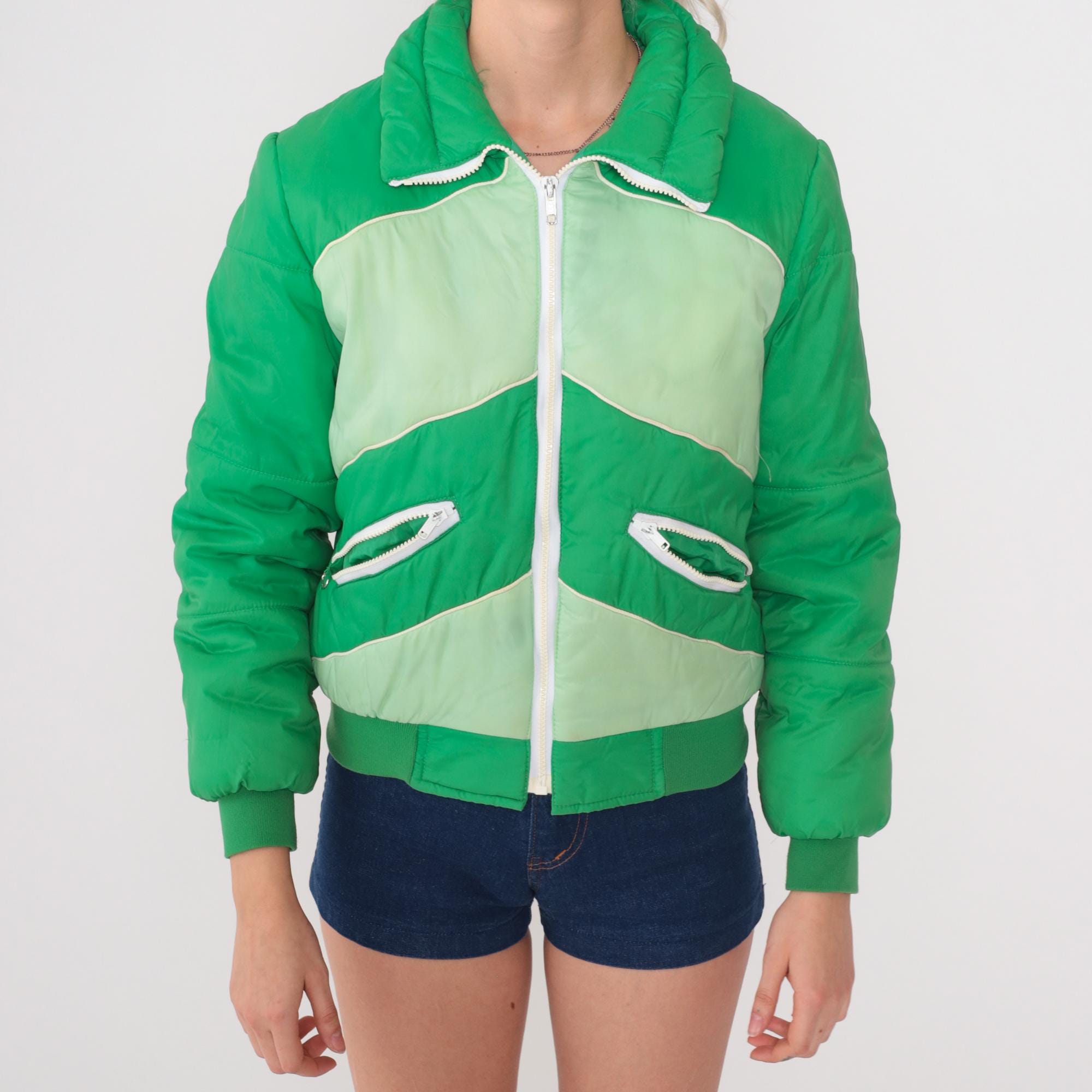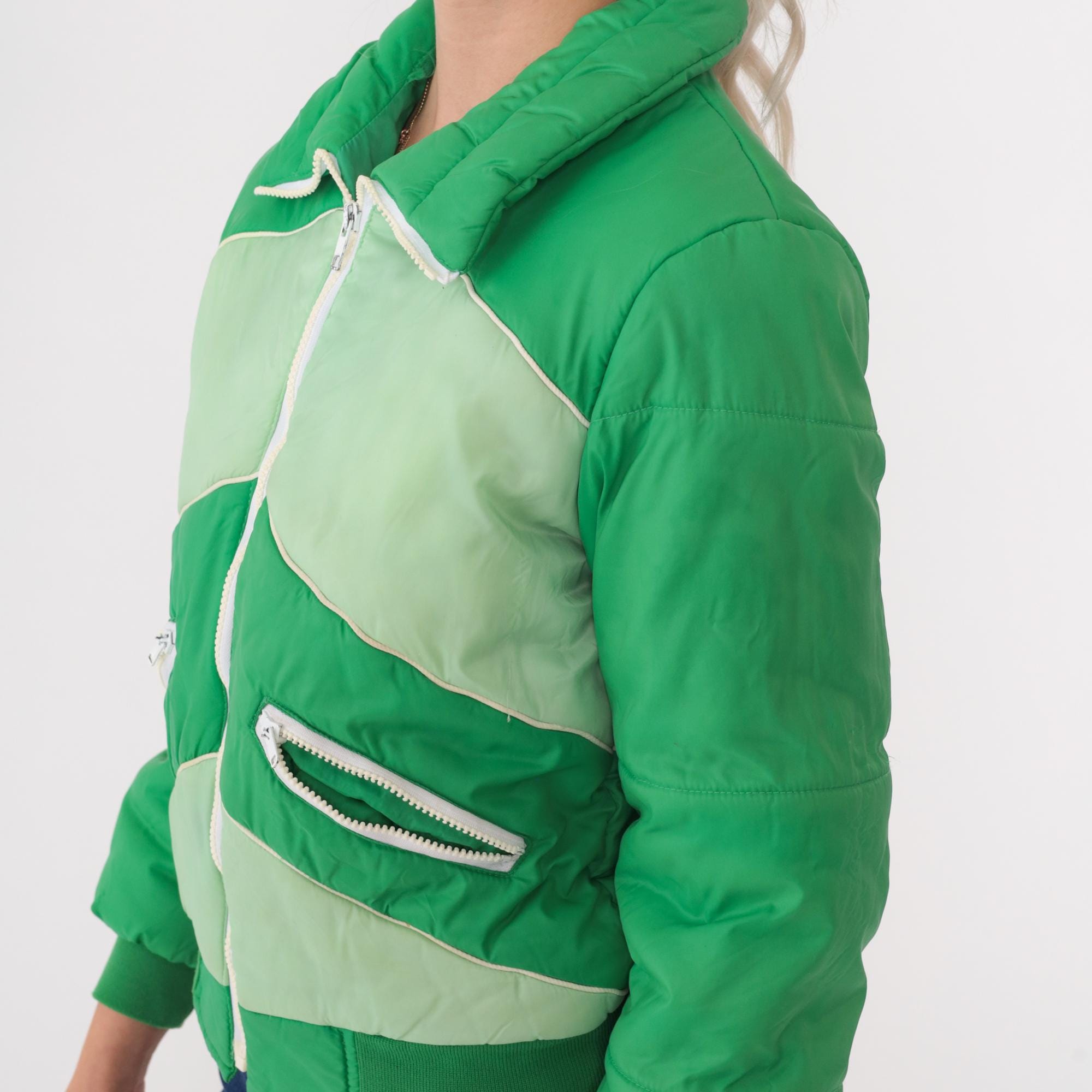 Vintage 80s green ski jacket by Squaw Peak featuring a striking two-tone color block design in mint and kelly green. White zip front closure with matching white piping detail and zip pockets. Made from nylon with polyester fill. Chevron-style pattern with ribbed cuffs and hem.