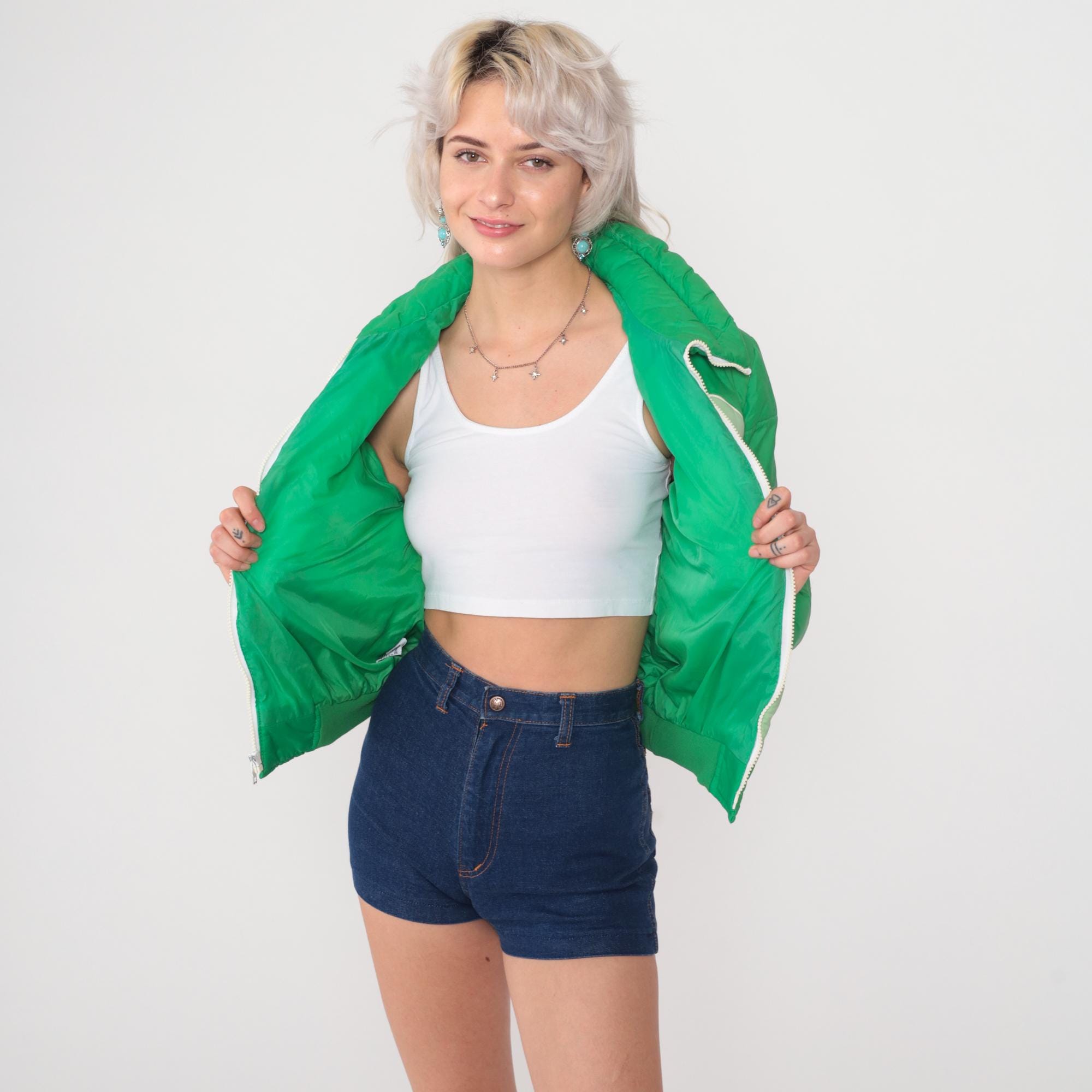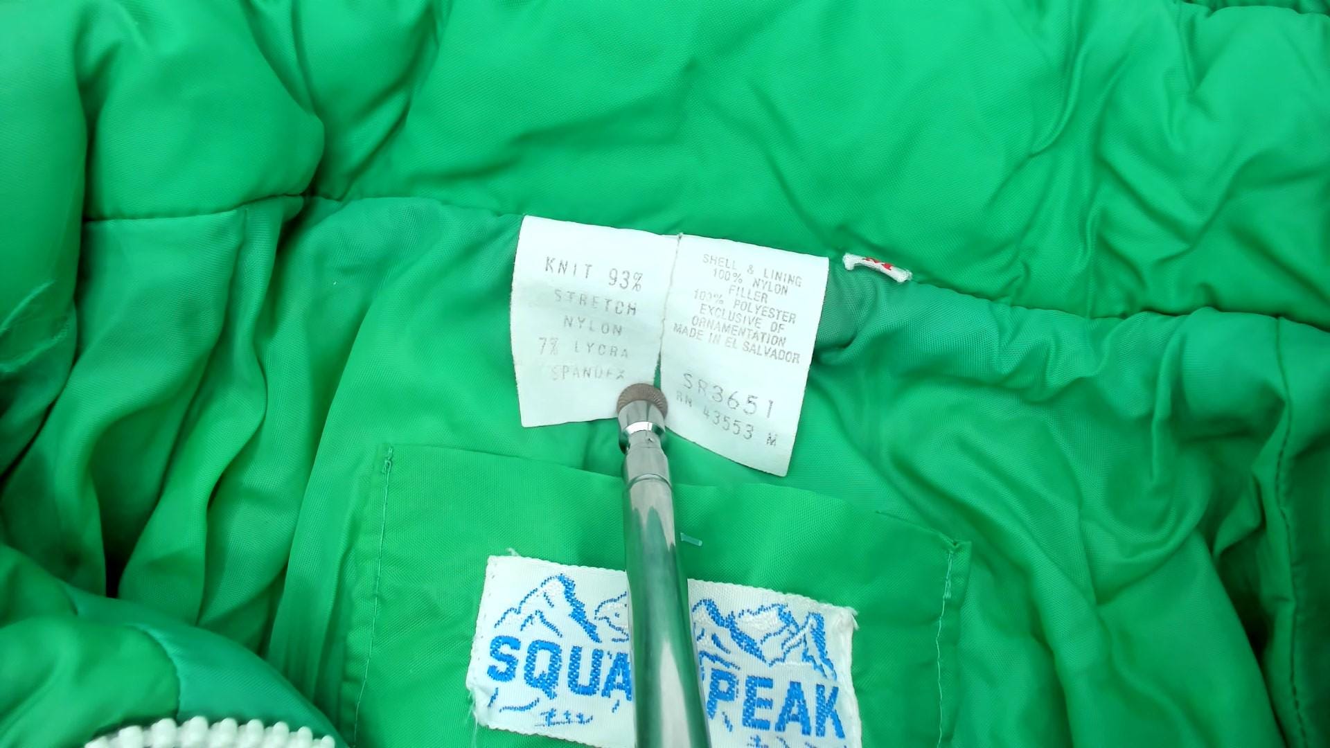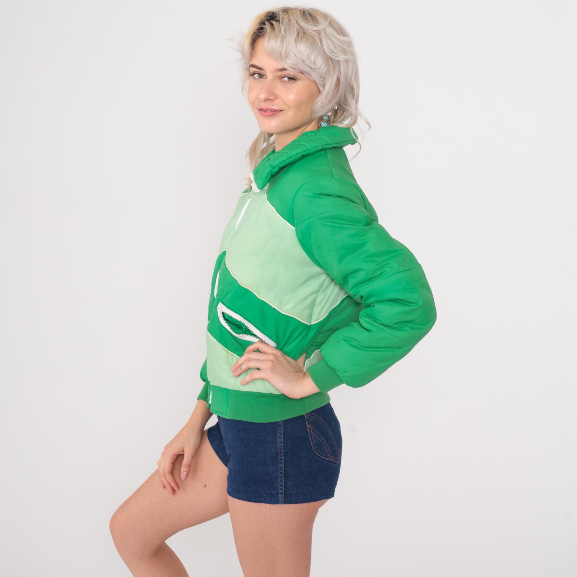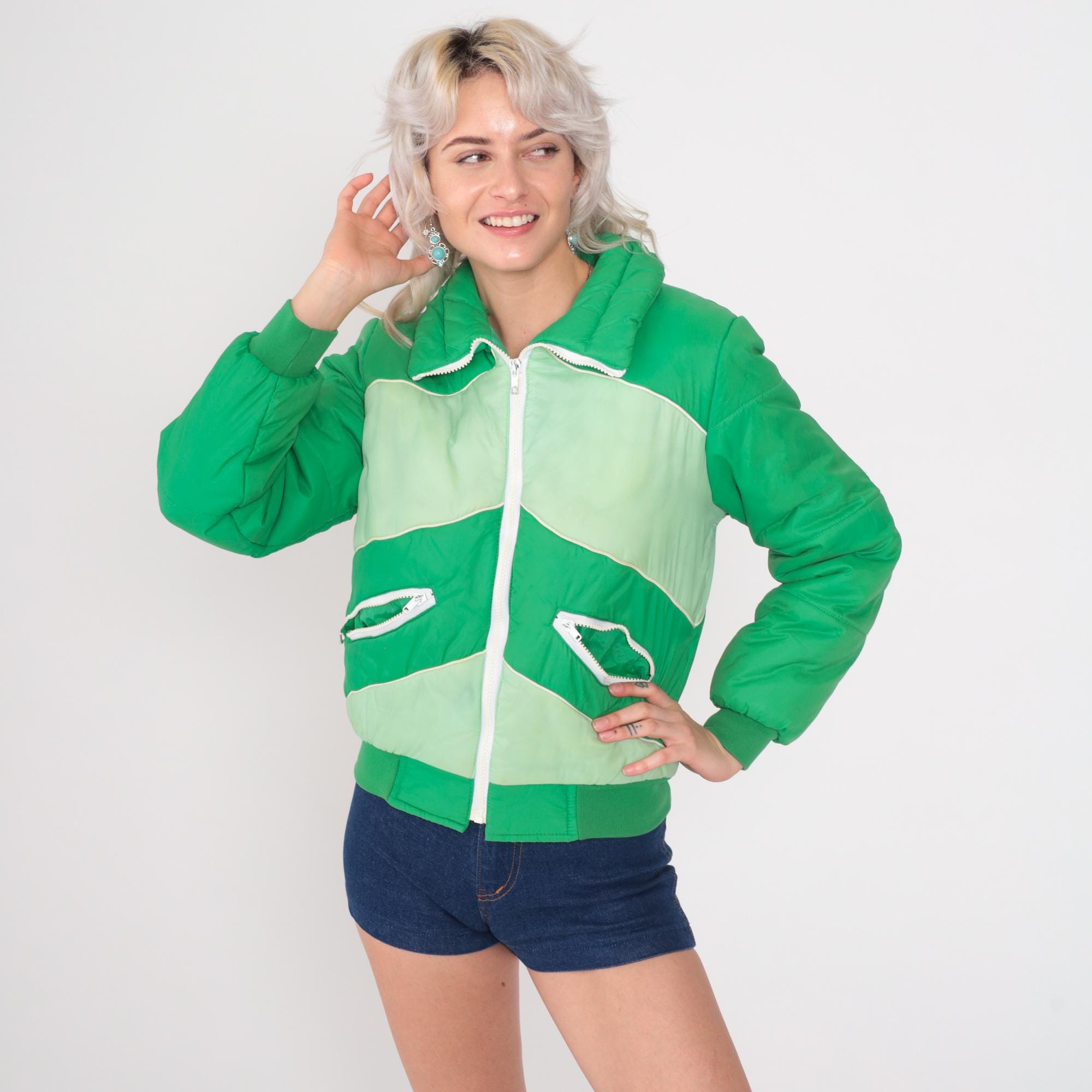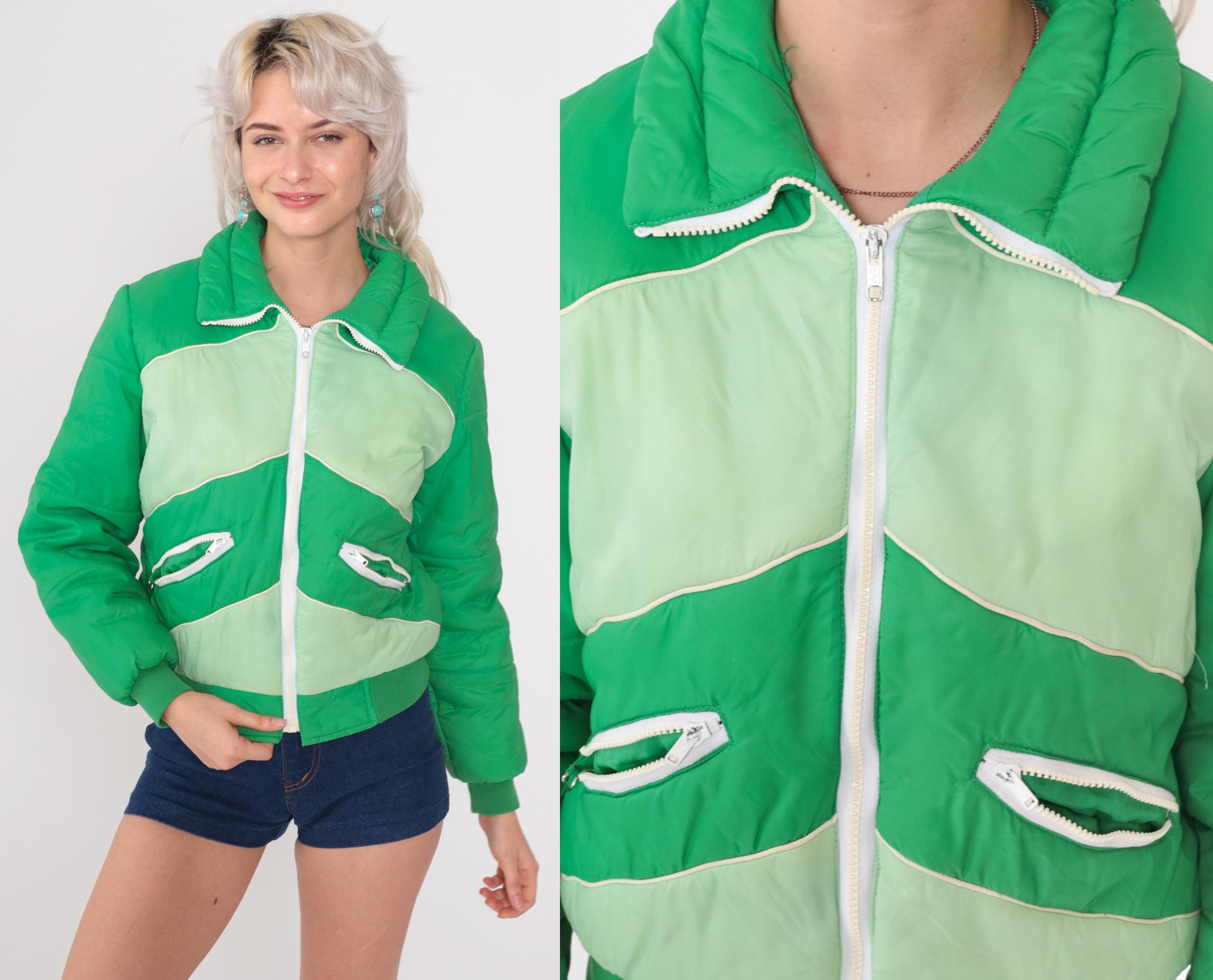 Vintage 80s green ski jacket by Squaw Peak featuring a striking two-tone color block design in mint and kelly green. White zip front closure with matching white piping detail and zip pockets. Made from nylon with polyester fill. Chevron-style pattern with ribbed cuffs and hem.