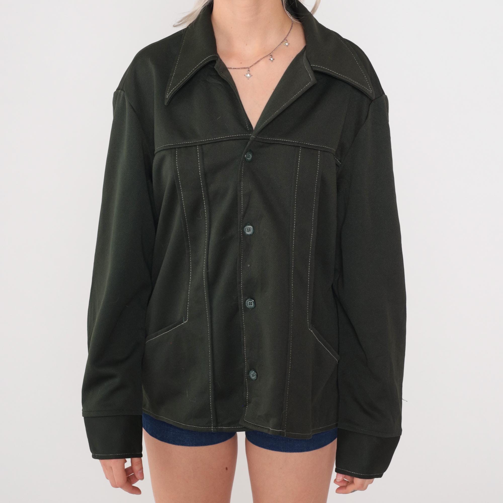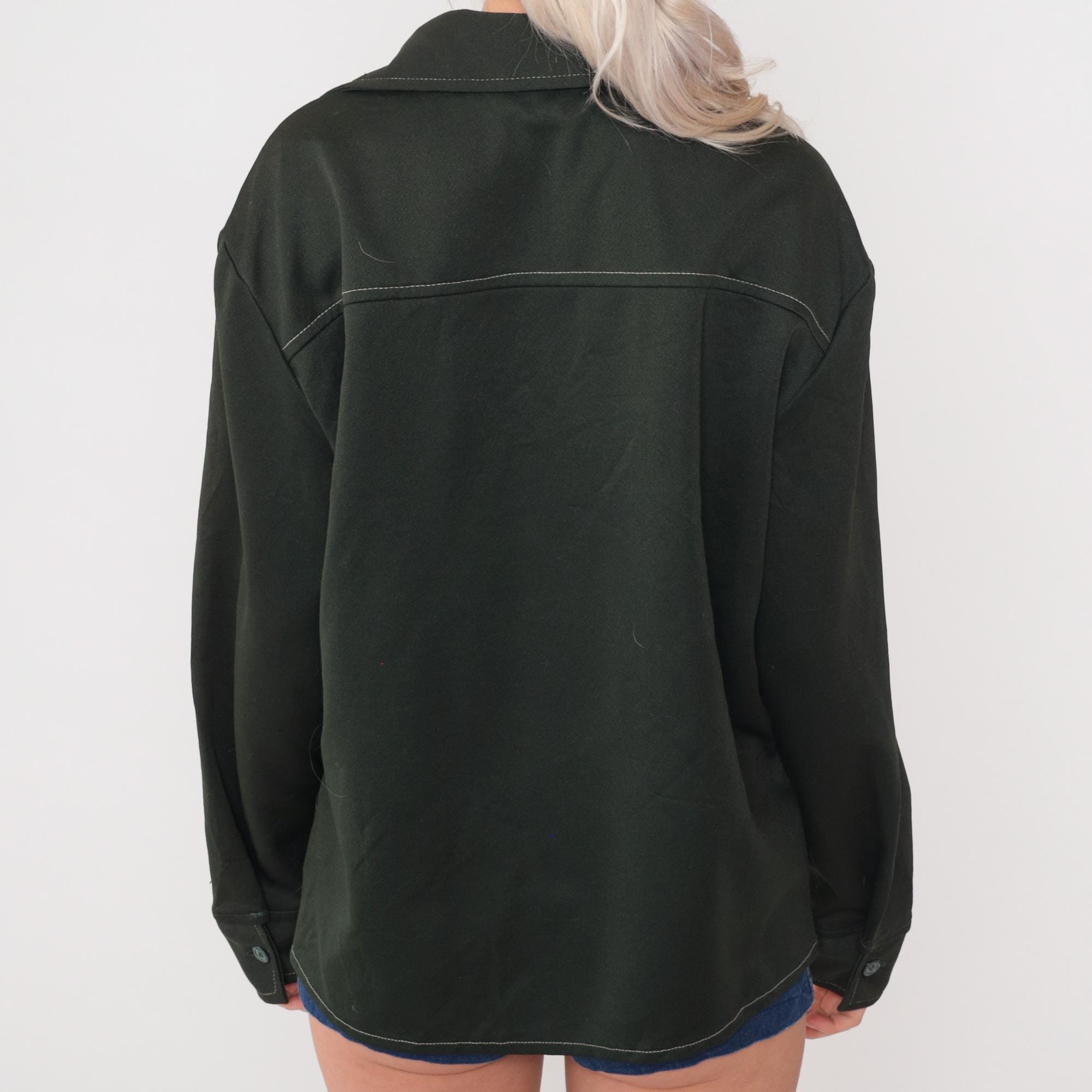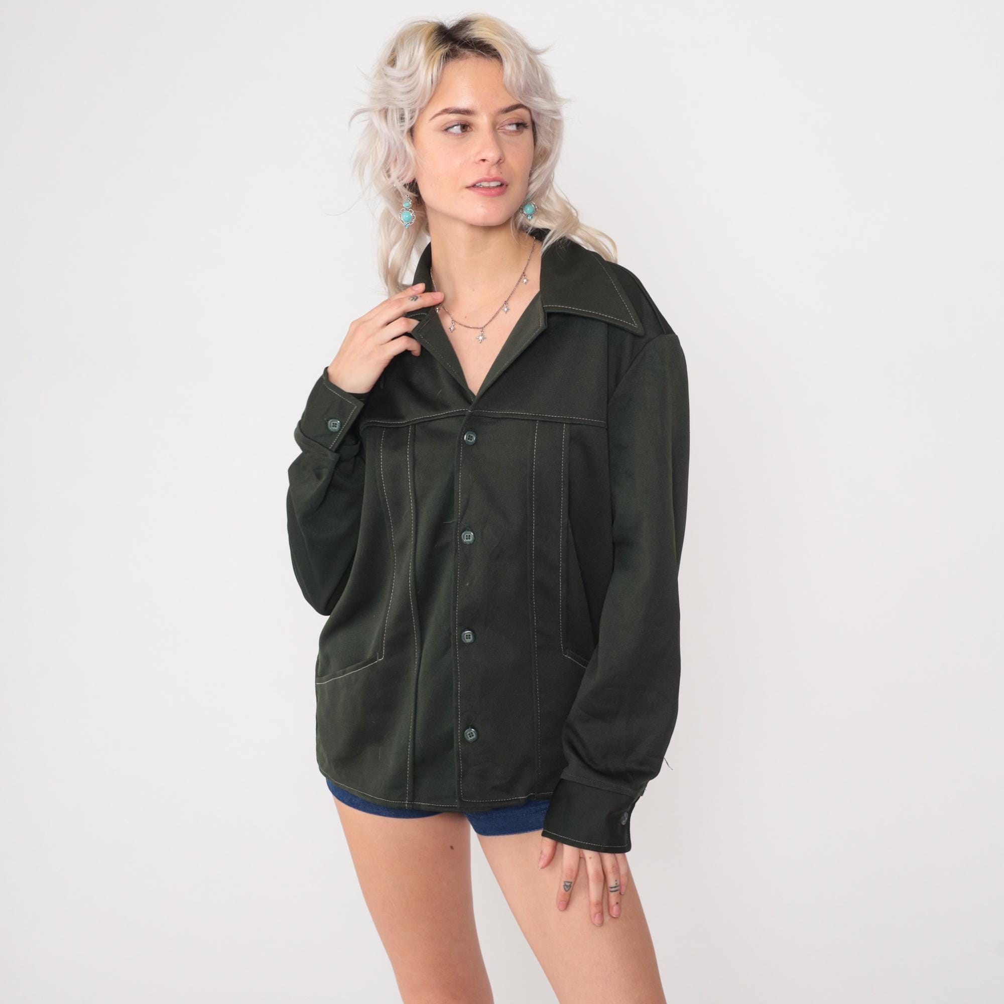 Vintage 70s Wrangler olive green shacket in polyester with distinctive contrast topstitching throughout. Features button front closure, pointed collar, and angled front pockets. This versatile shirt-jacket hybrid has a boxy silhouette and forest green color.