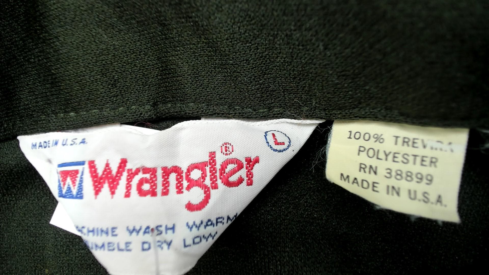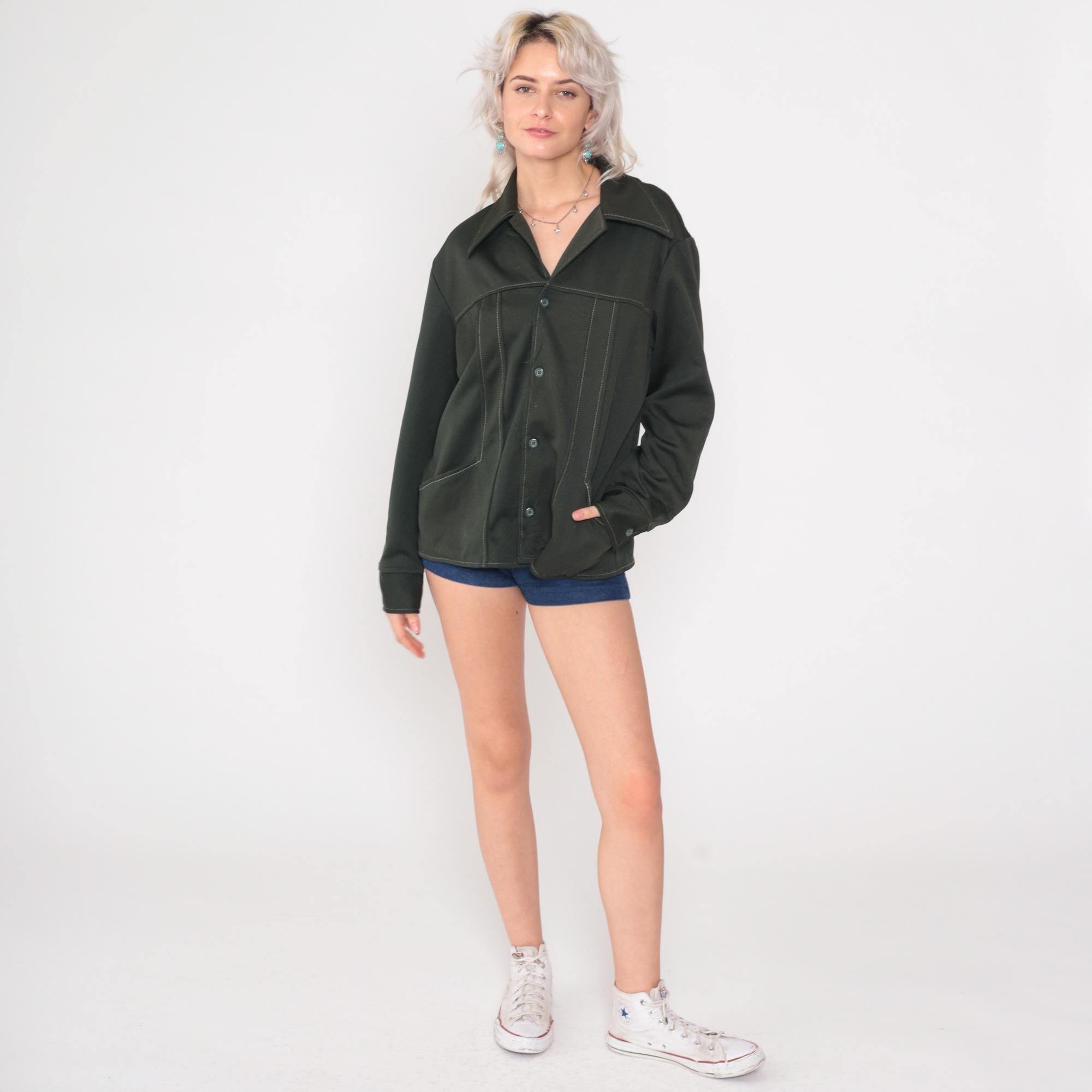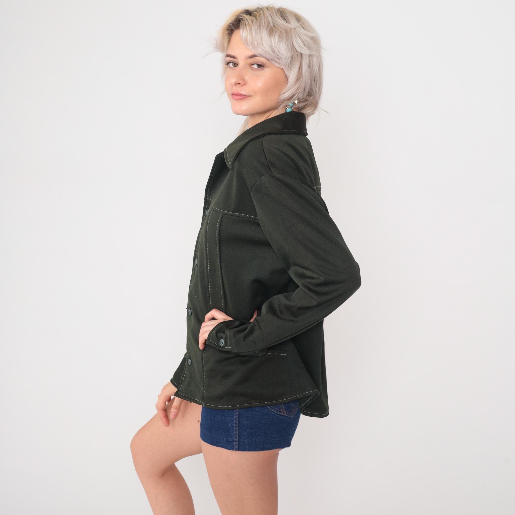 Vintage 70s Wrangler olive green shacket in polyester with distinctive contrast topstitching throughout. Features button front closure, pointed collar, and angled front pockets. This versatile shirt-jacket hybrid has a boxy silhouette and forest green color.