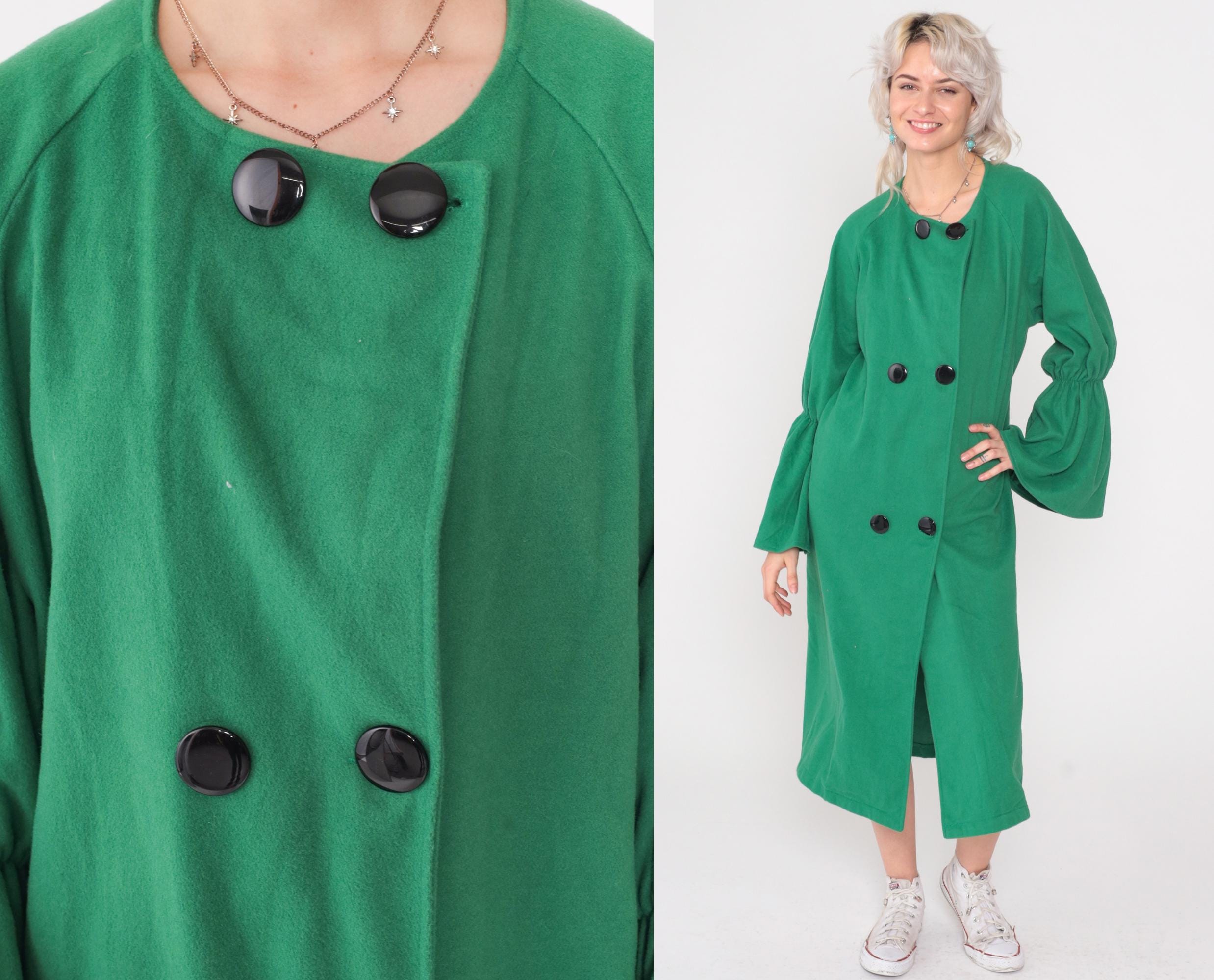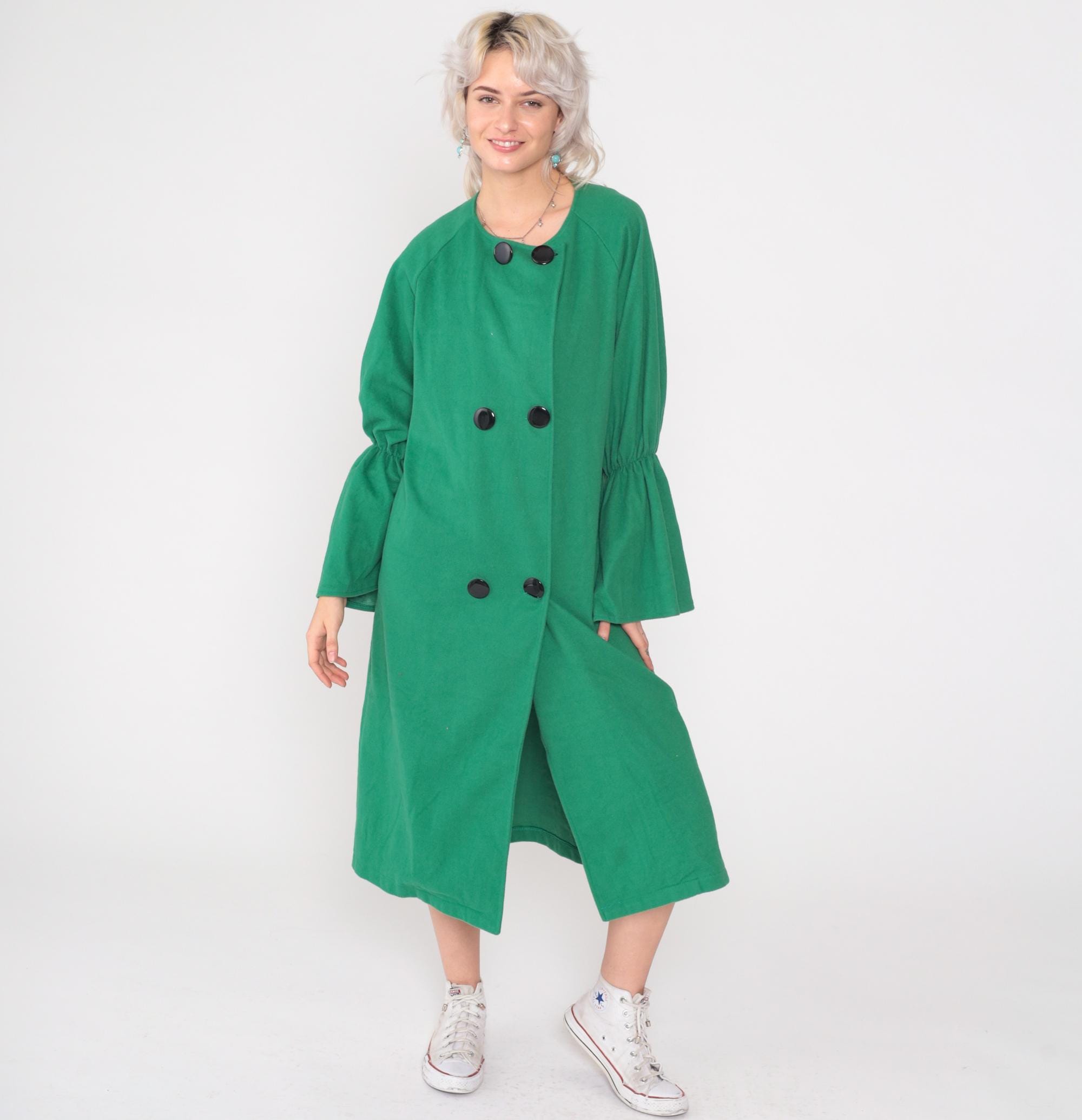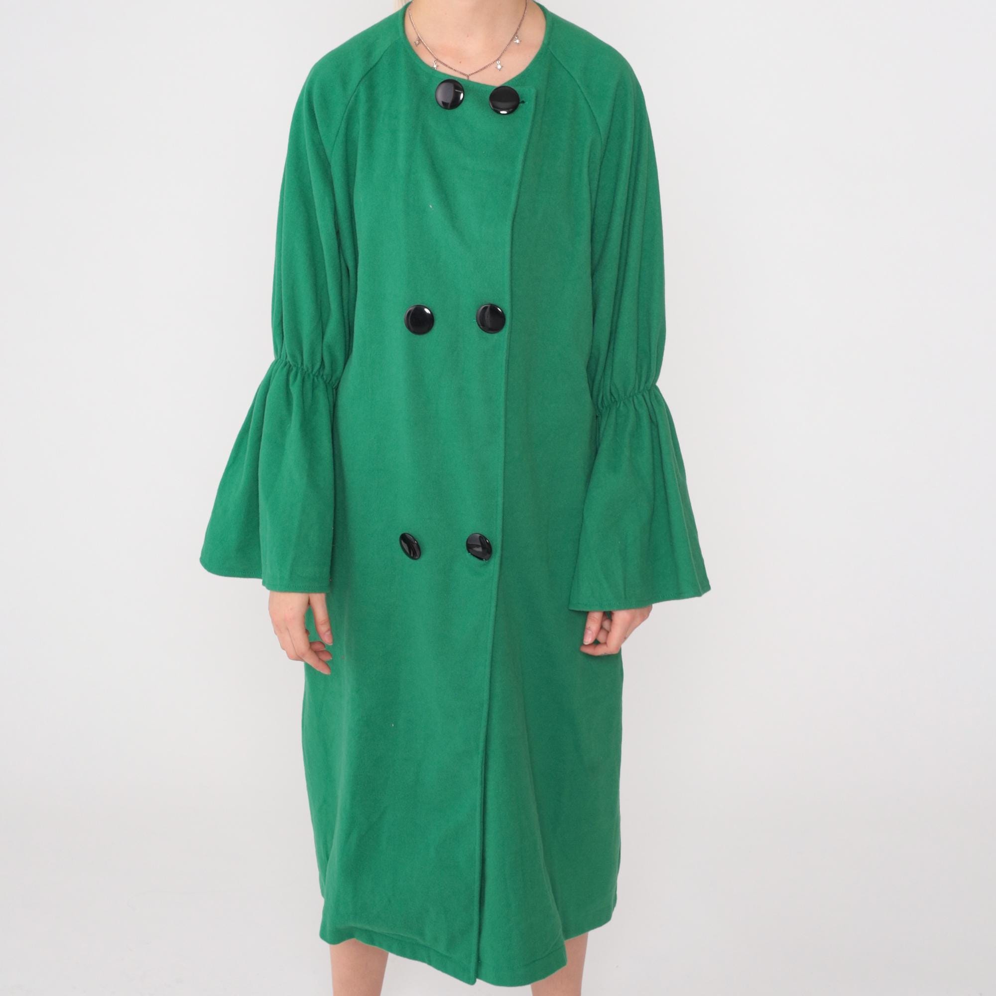 Y2K era green statement coat with dramatic bell sleeves. Features double-breasted black button closure and collarless neckline. Made from soft polyester fleece in a vibrant kelly/emerald green.