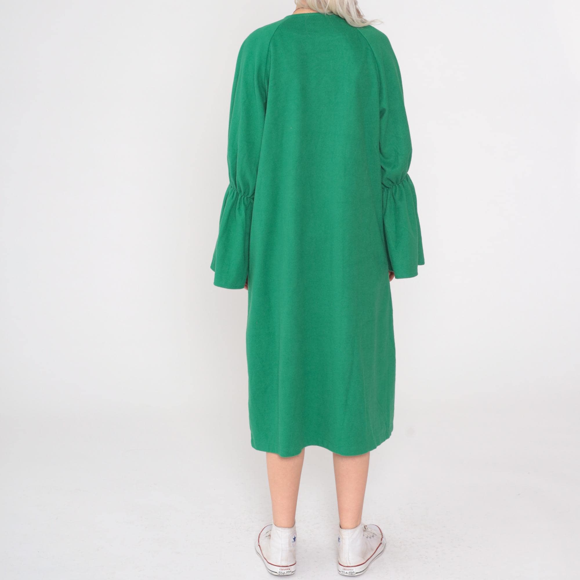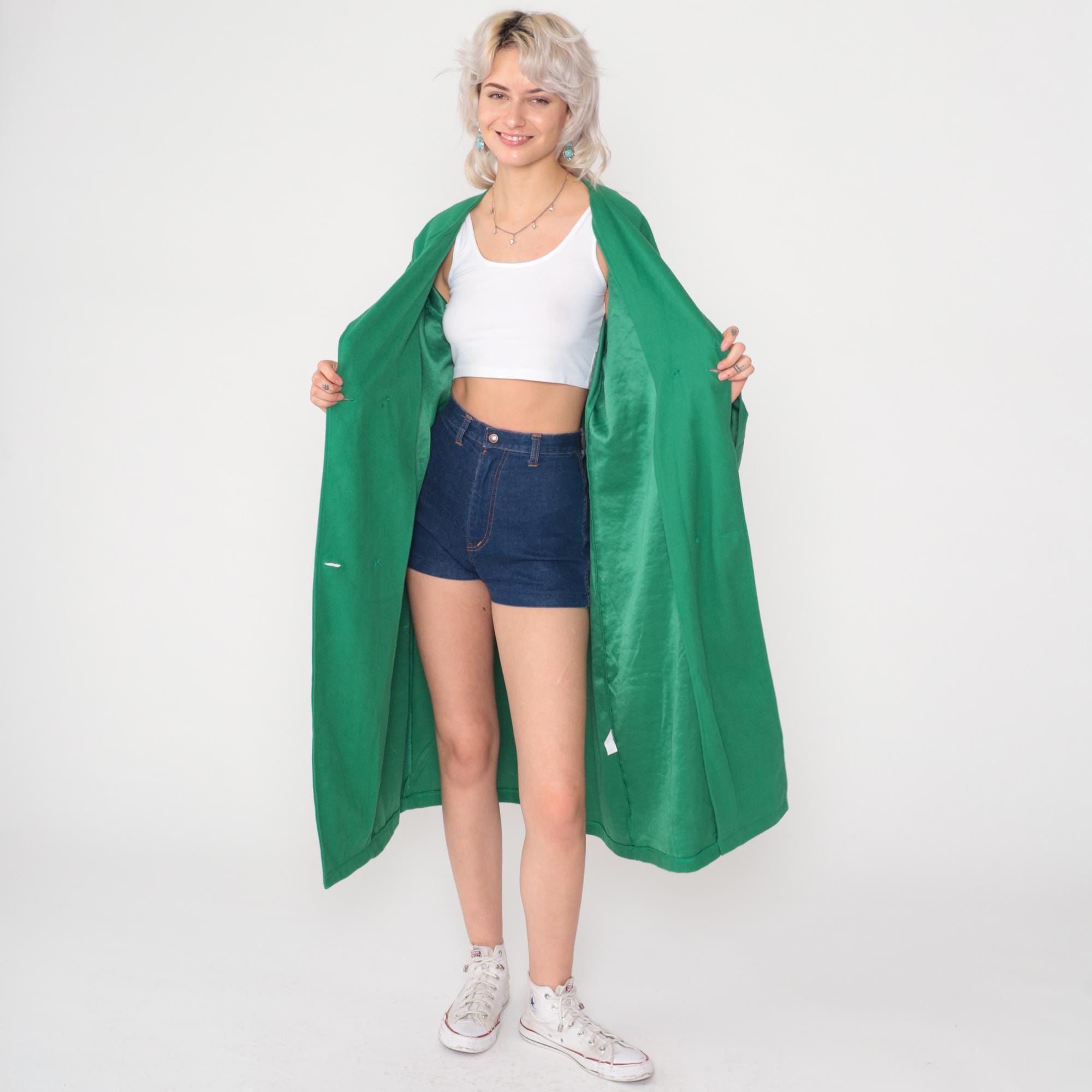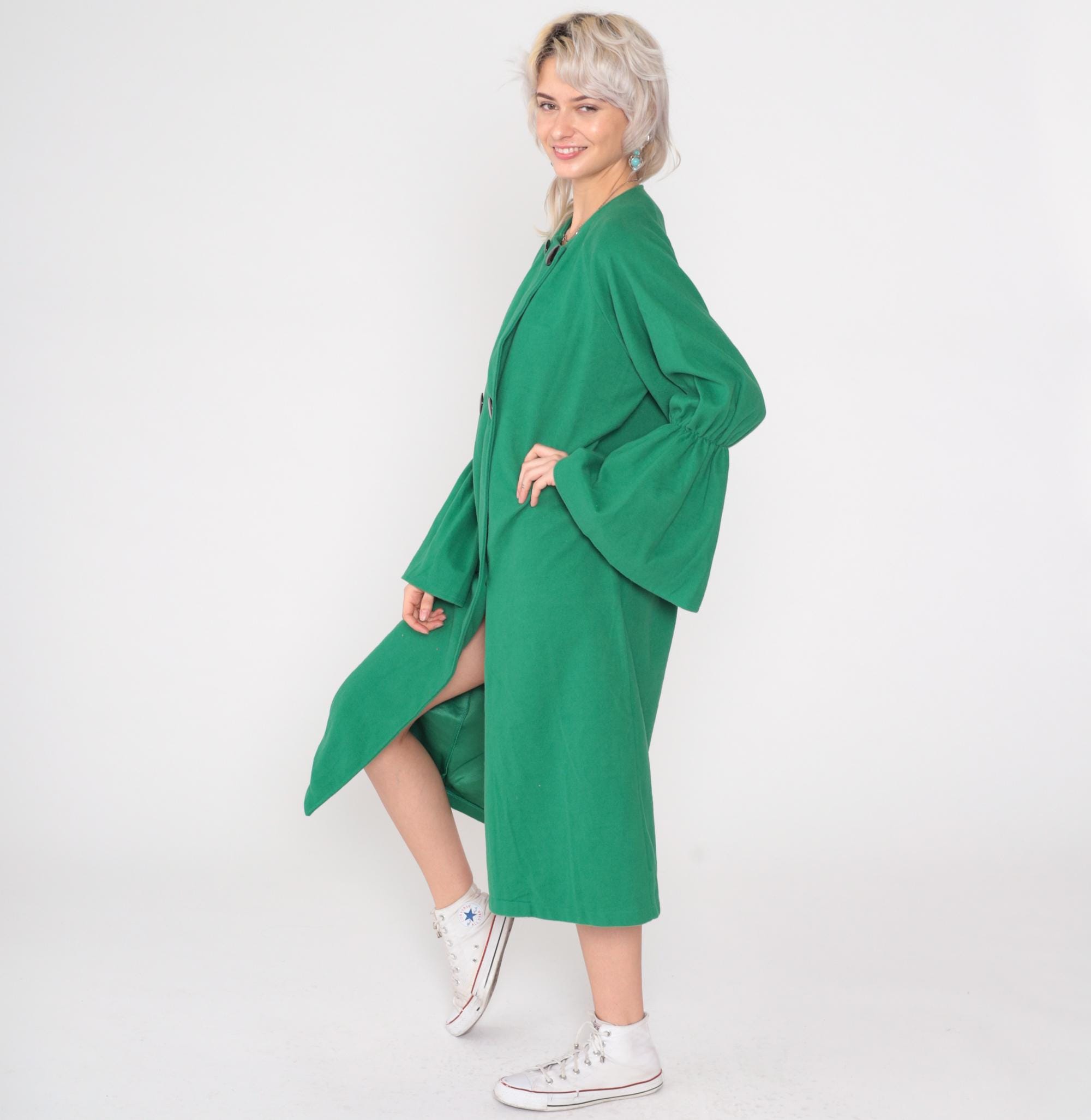 Y2K era green statement coat with dramatic bell sleeves. Features double-breasted black button closure and collarless neckline. Made from soft polyester fleece in a vibrant kelly/emerald green.