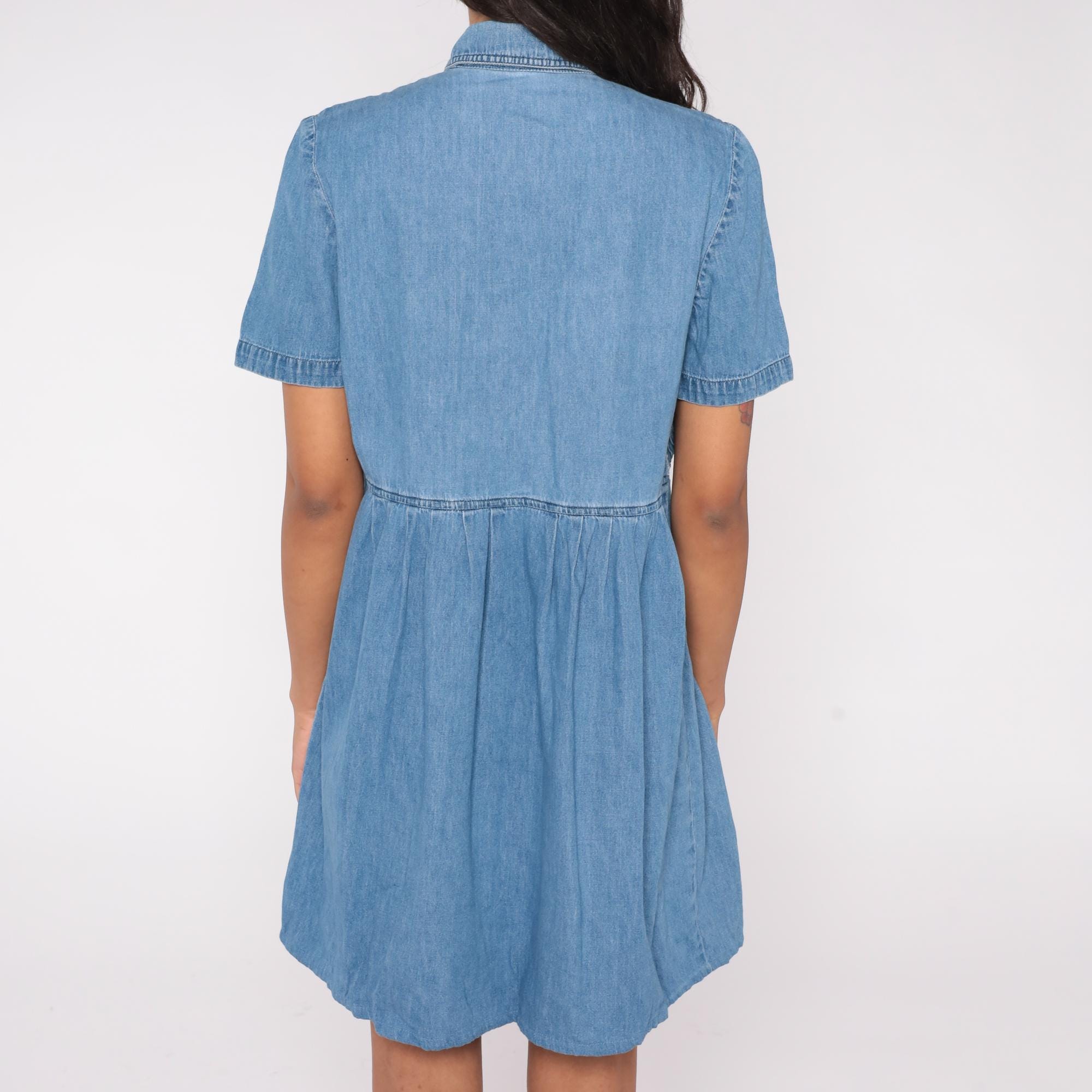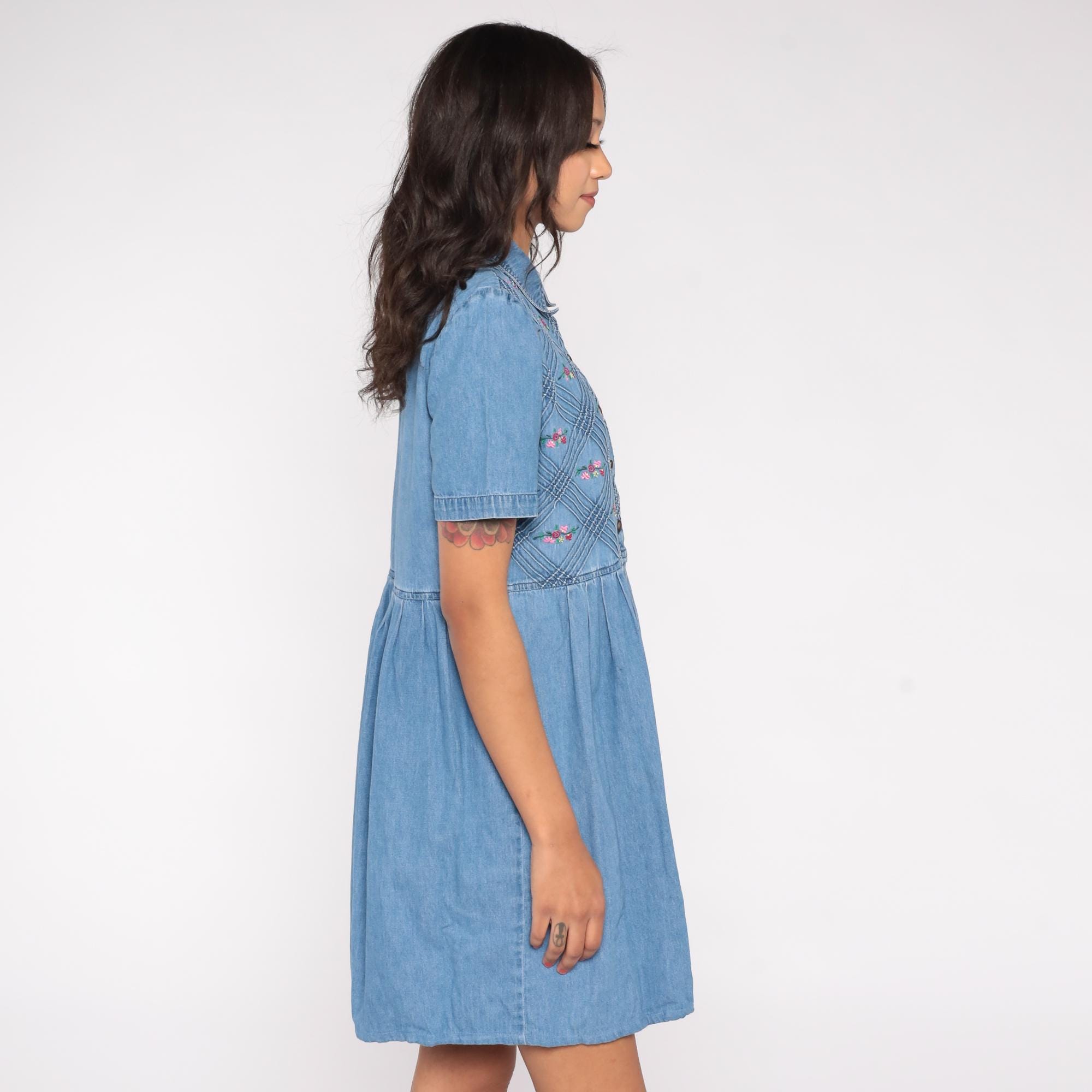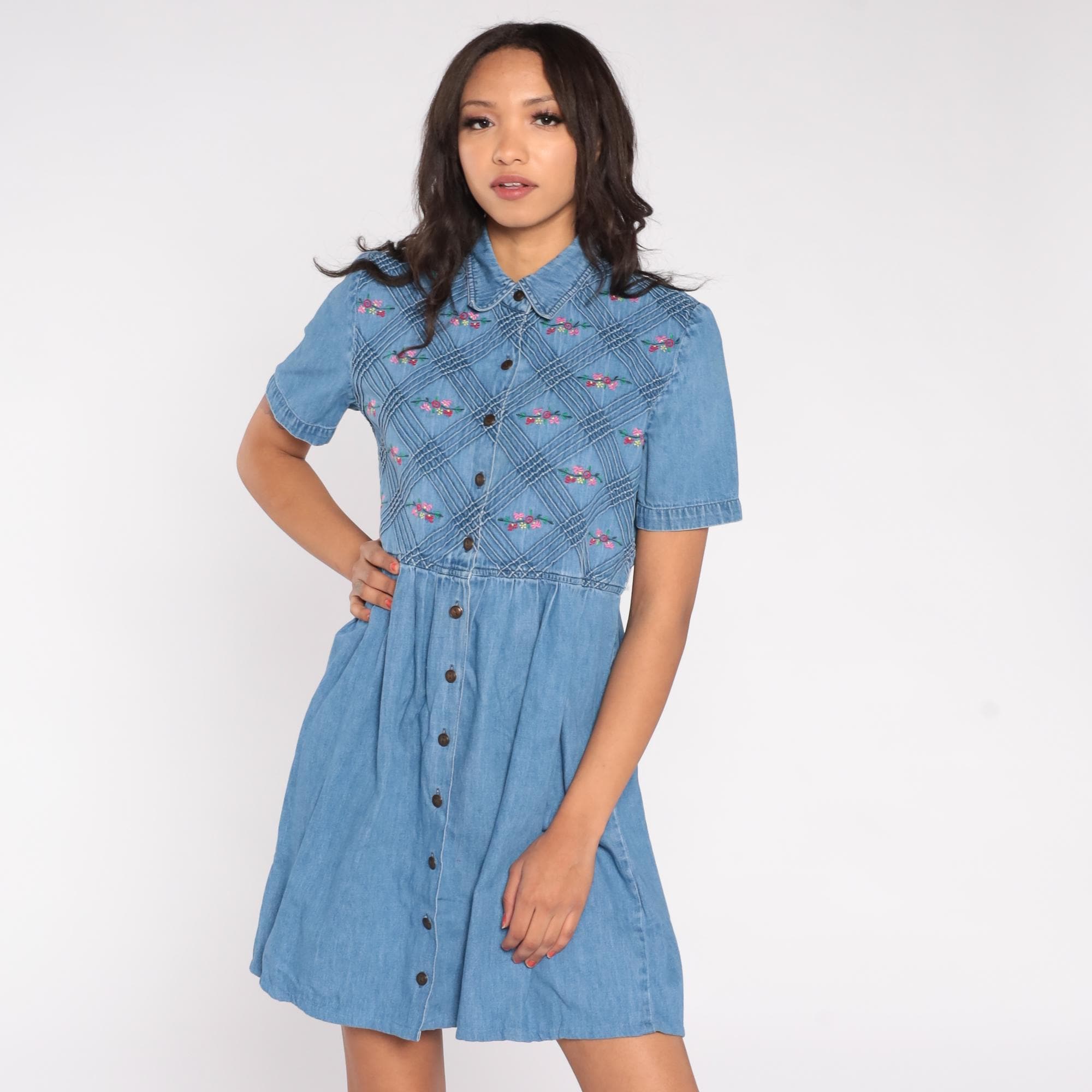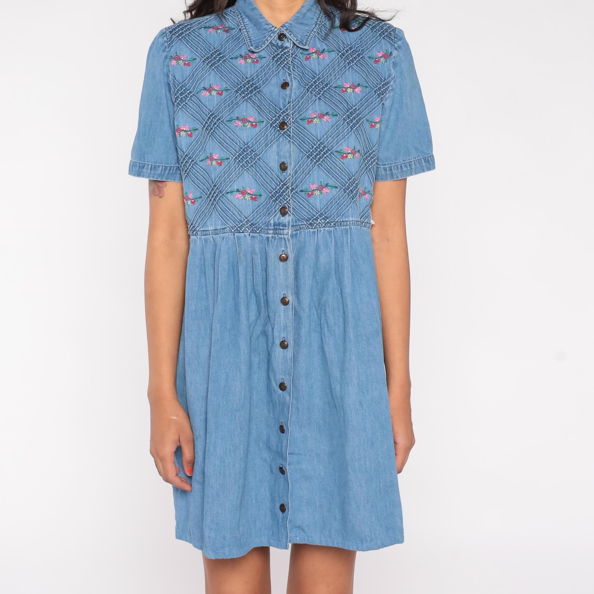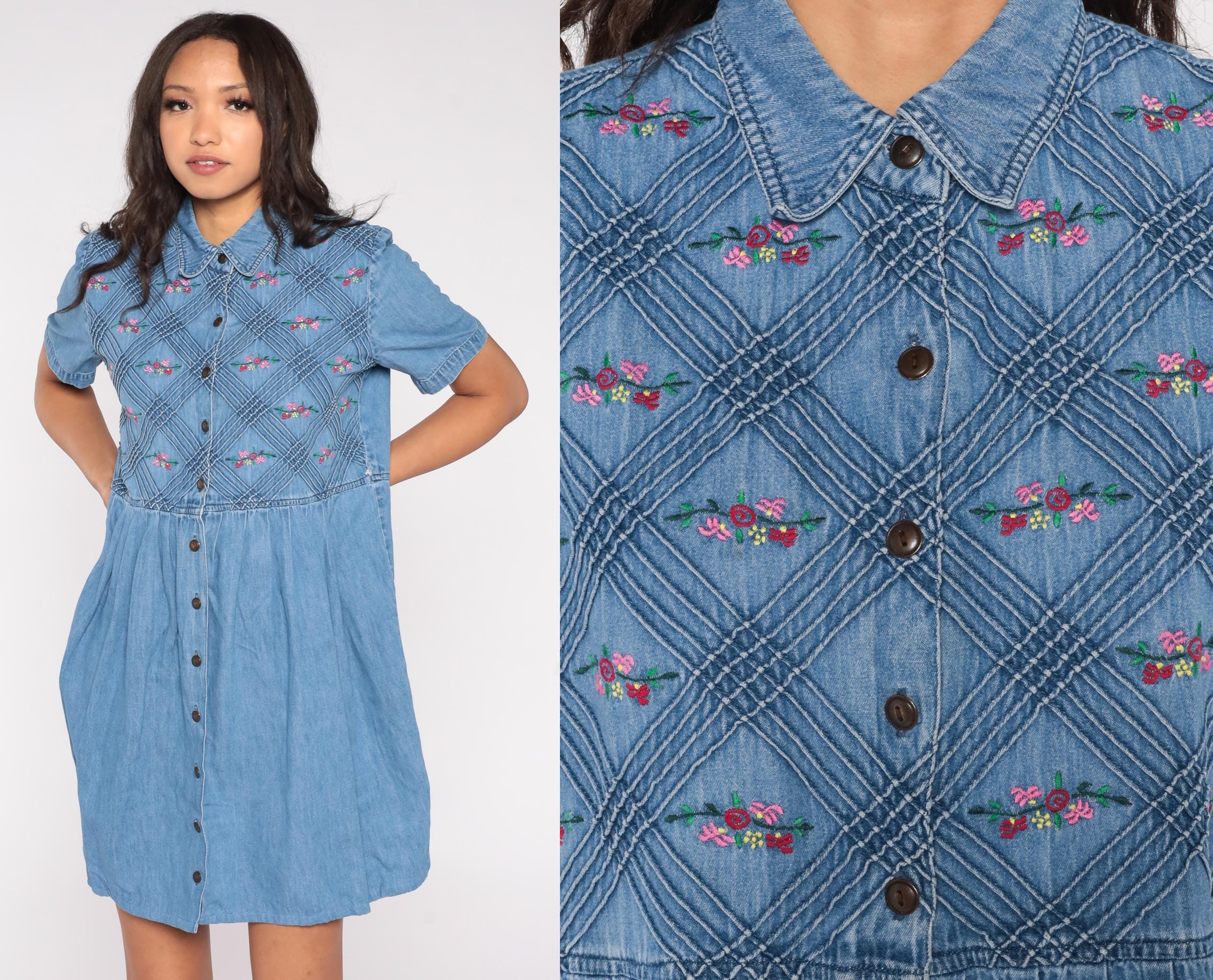 90s denim dress featuring pink and green floral embroidery arranged in a diamond quilt pattern across the bodice. The dress includes a collared neckline, short sleeves, and a full button front with dark buttons. It has a fitted waist and gently flared skirt for a relaxed fit-and-flare silhouette.
