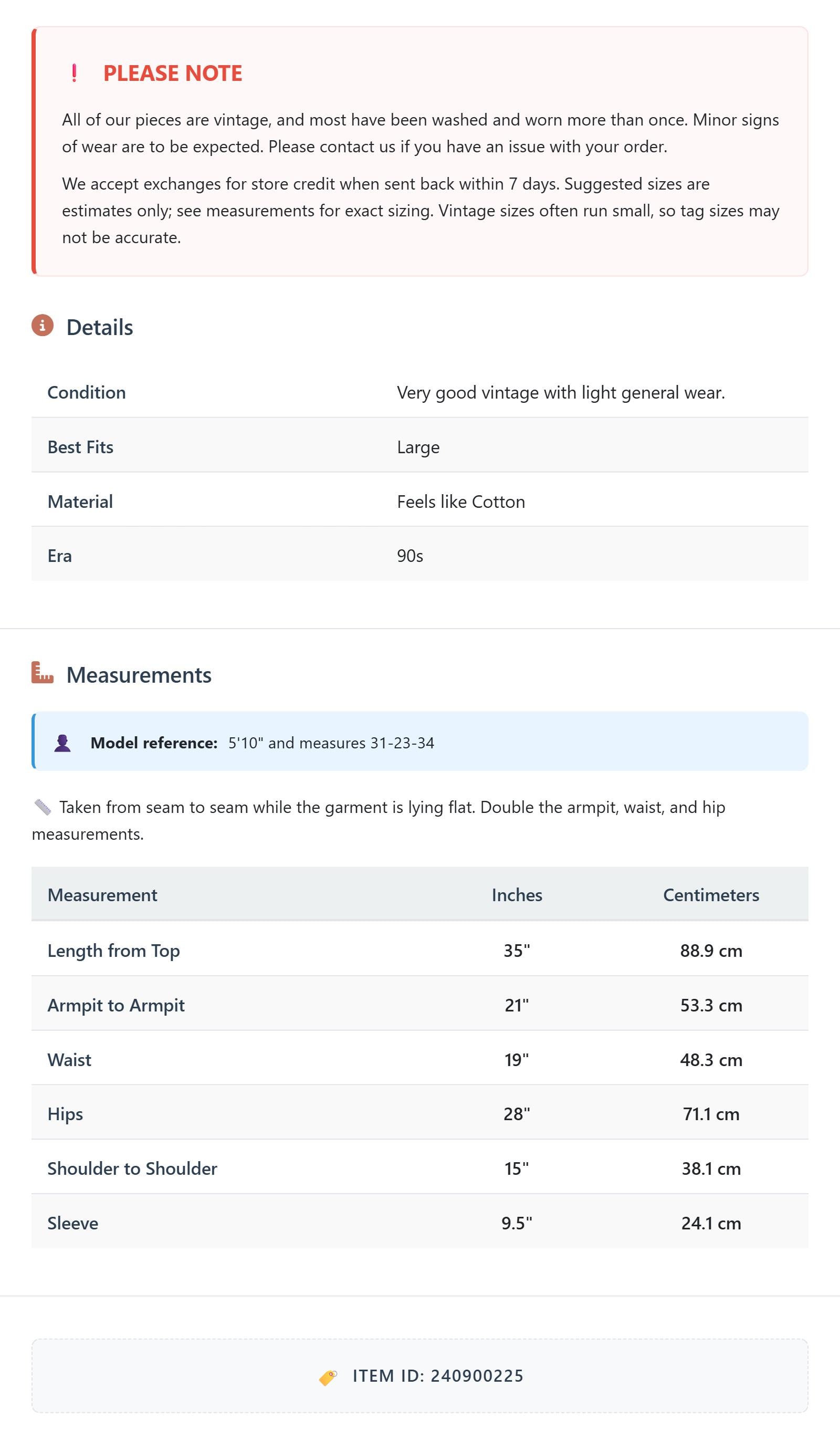 All of our pieces are vintage, and most have been washed and worn more than once. Minor signs of wear are to be expected. Please contact us if you have an issue with your order. We accept exchanges for store credit when sent back within 7 days.