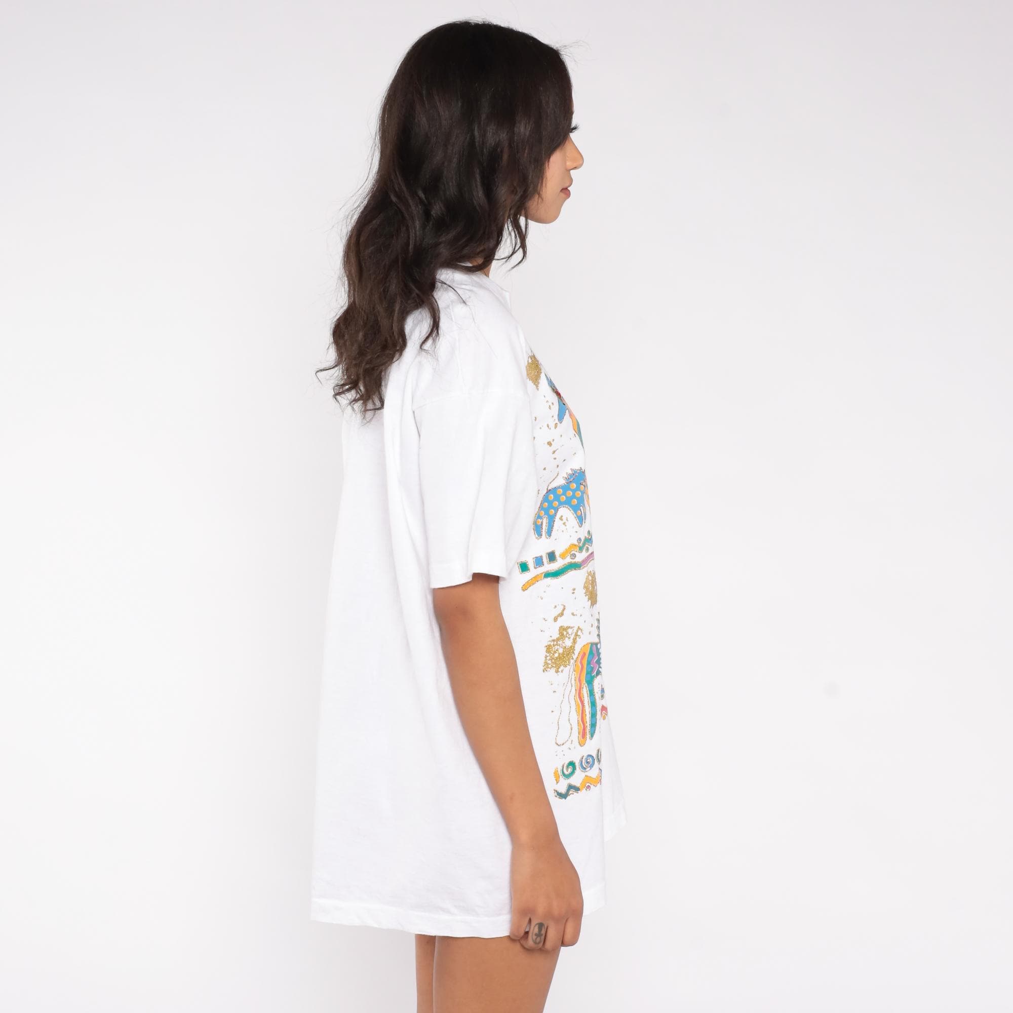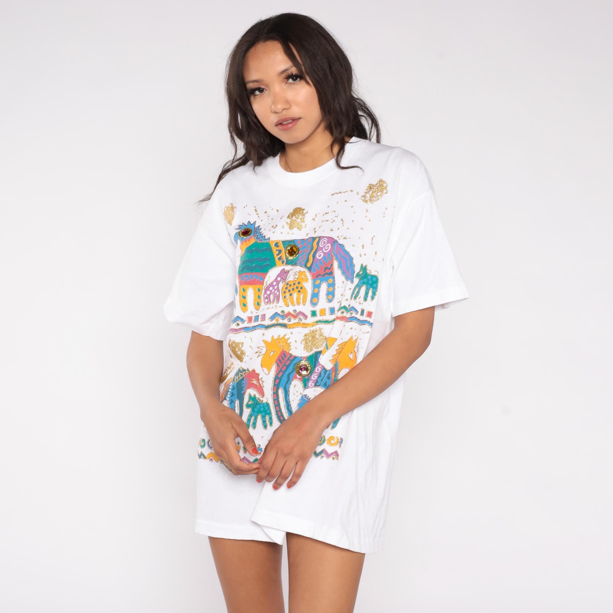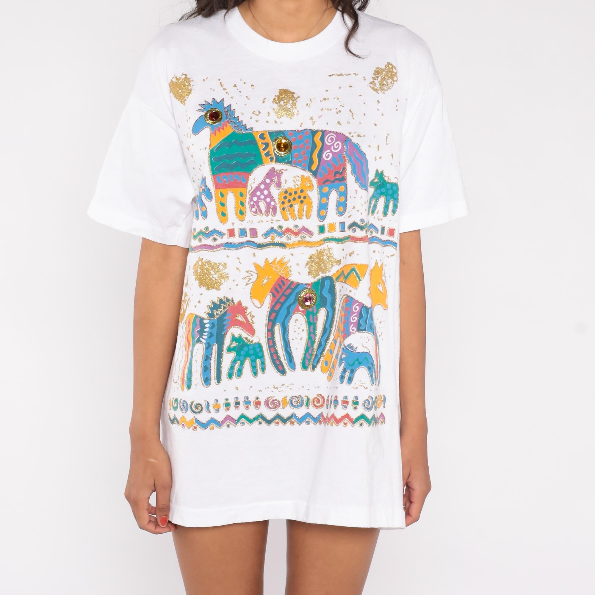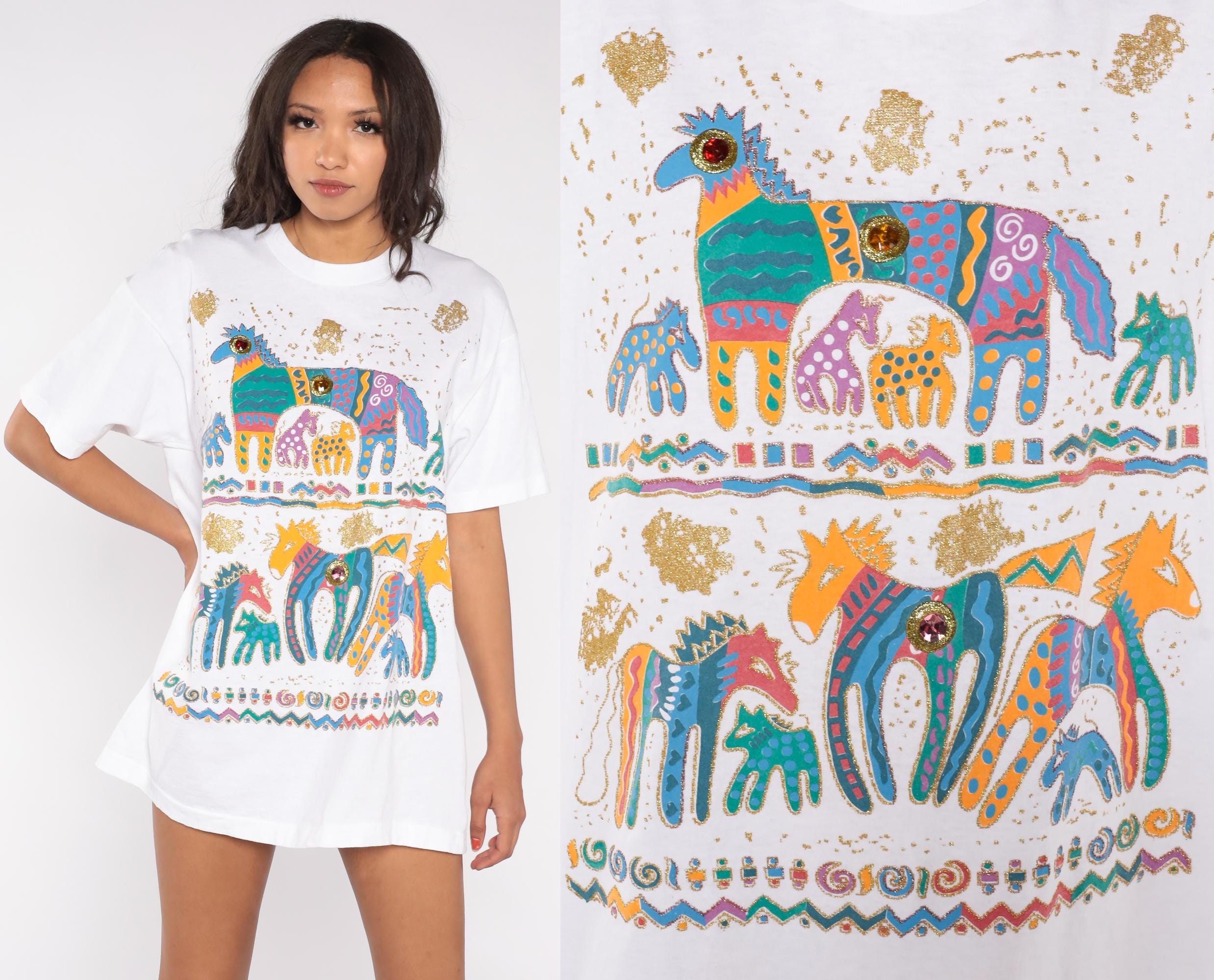 90s Fruit of the Loom T-shirt featuring a colorful abstract horse and animal print accented with gold glitter paint and jewel embellishments. The design includes bold geometric and southwestern-inspired motifs in bright tones of turquoise, purple, orange, and green.