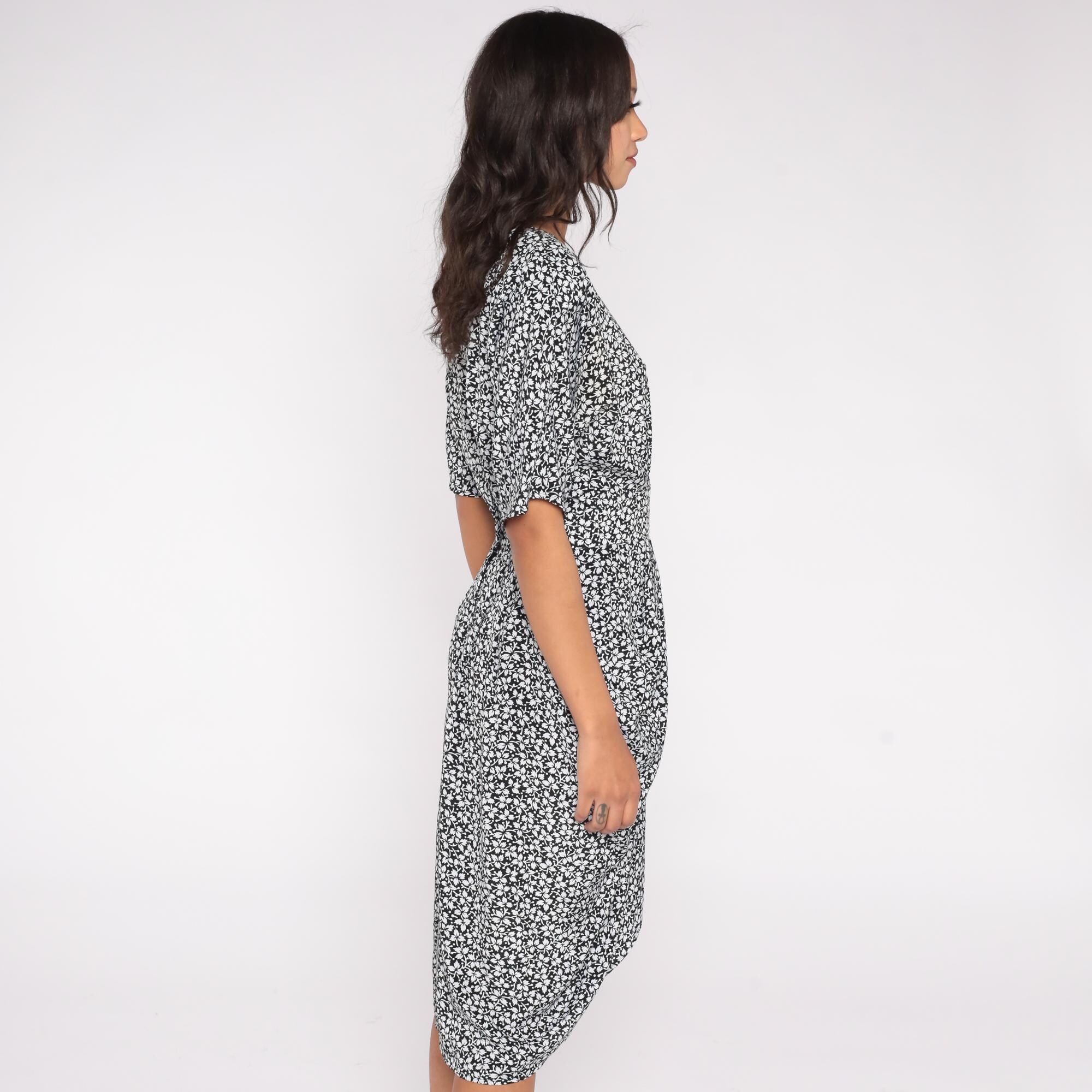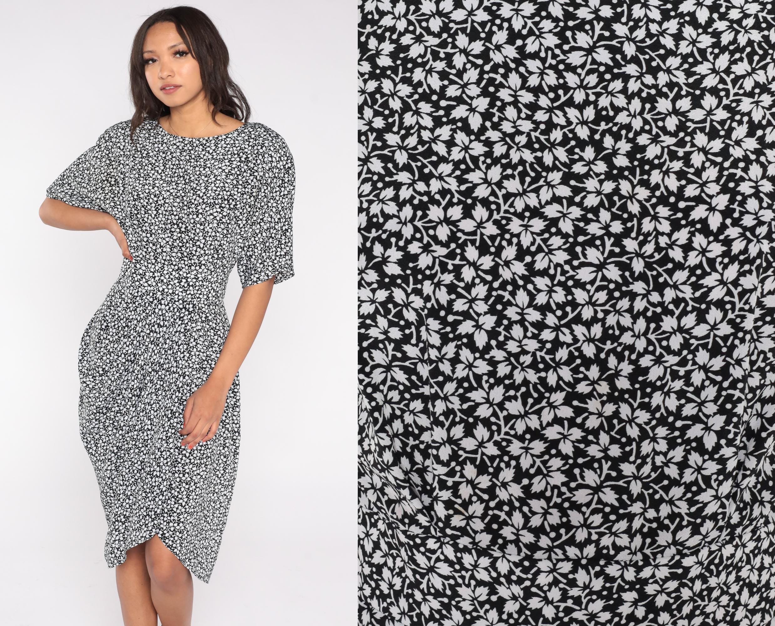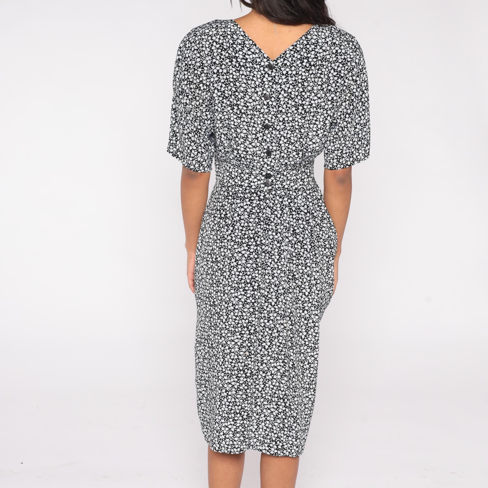 90s midi dress by Warren Z in black with white leaf print. Features fitted waist, short sleeves, button back closure, and tulip hem.