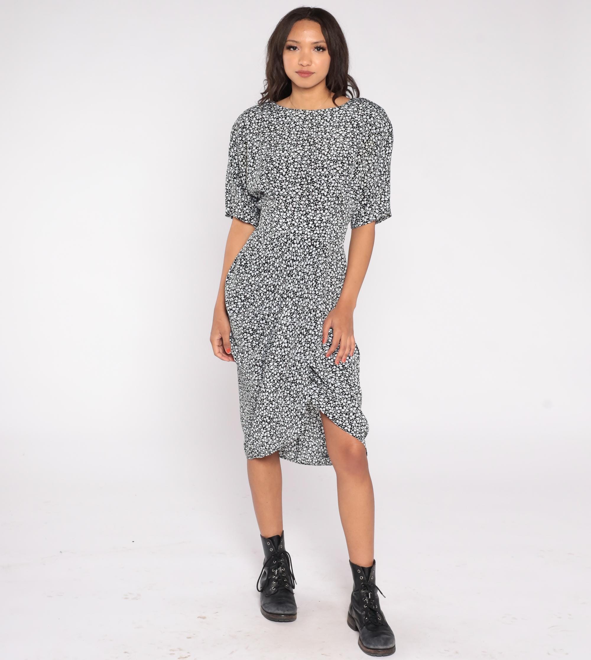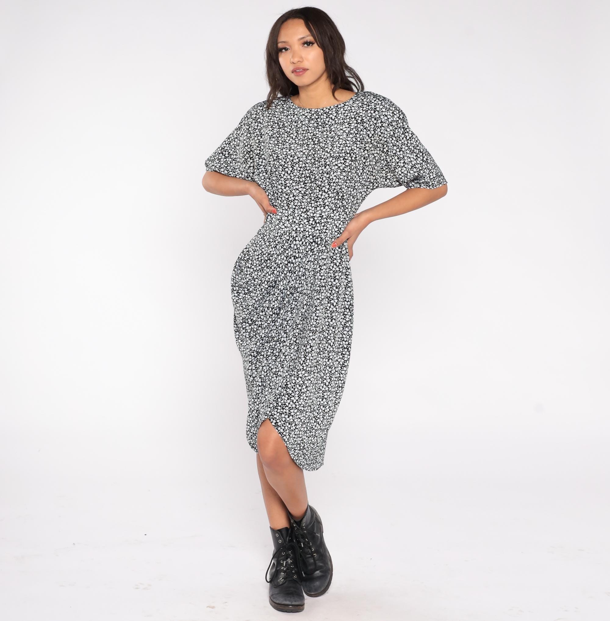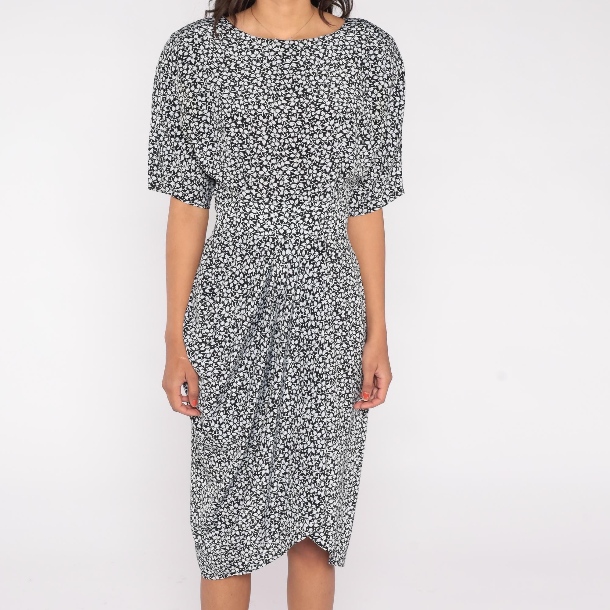 90s midi dress by Warren Z in black with white leaf print. Features fitted waist, short sleeves, button back closure, and tulip hem.