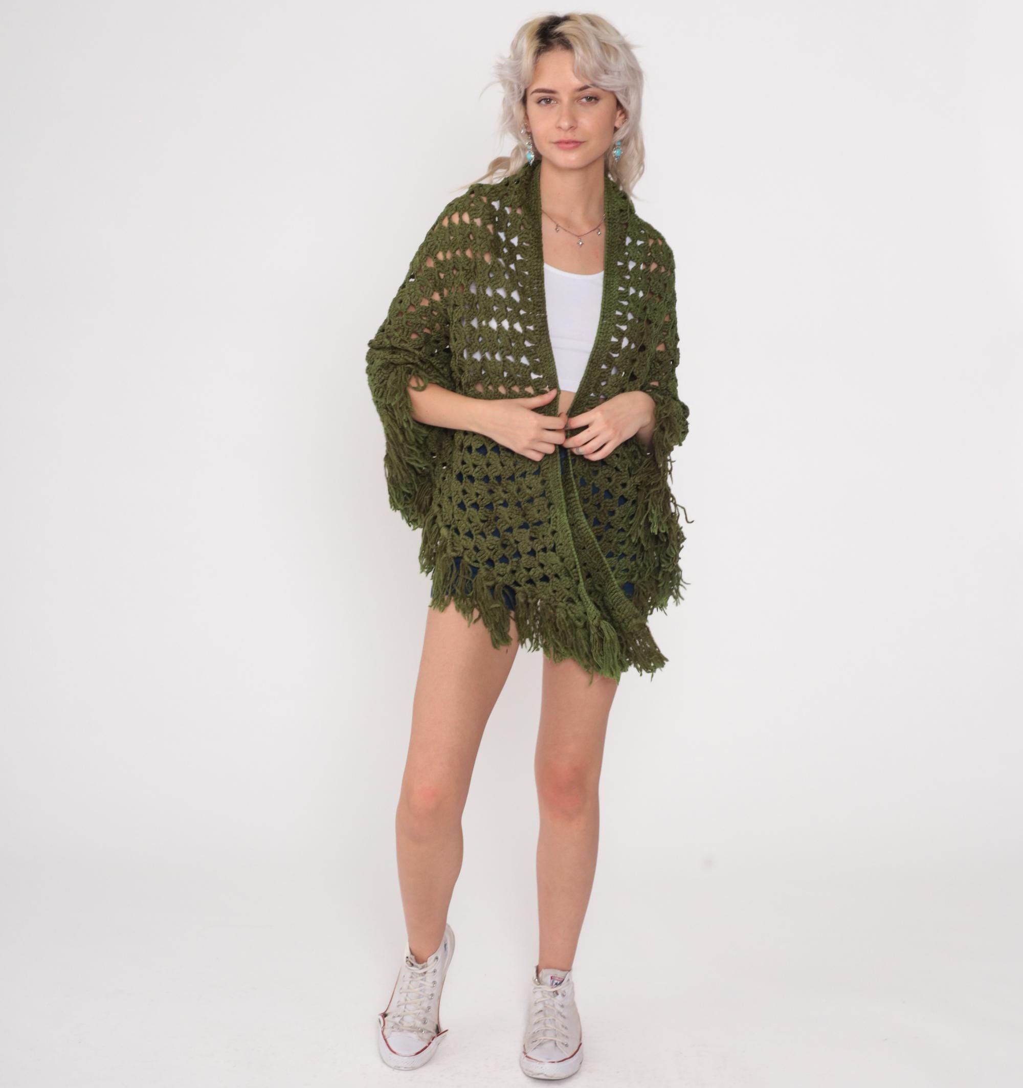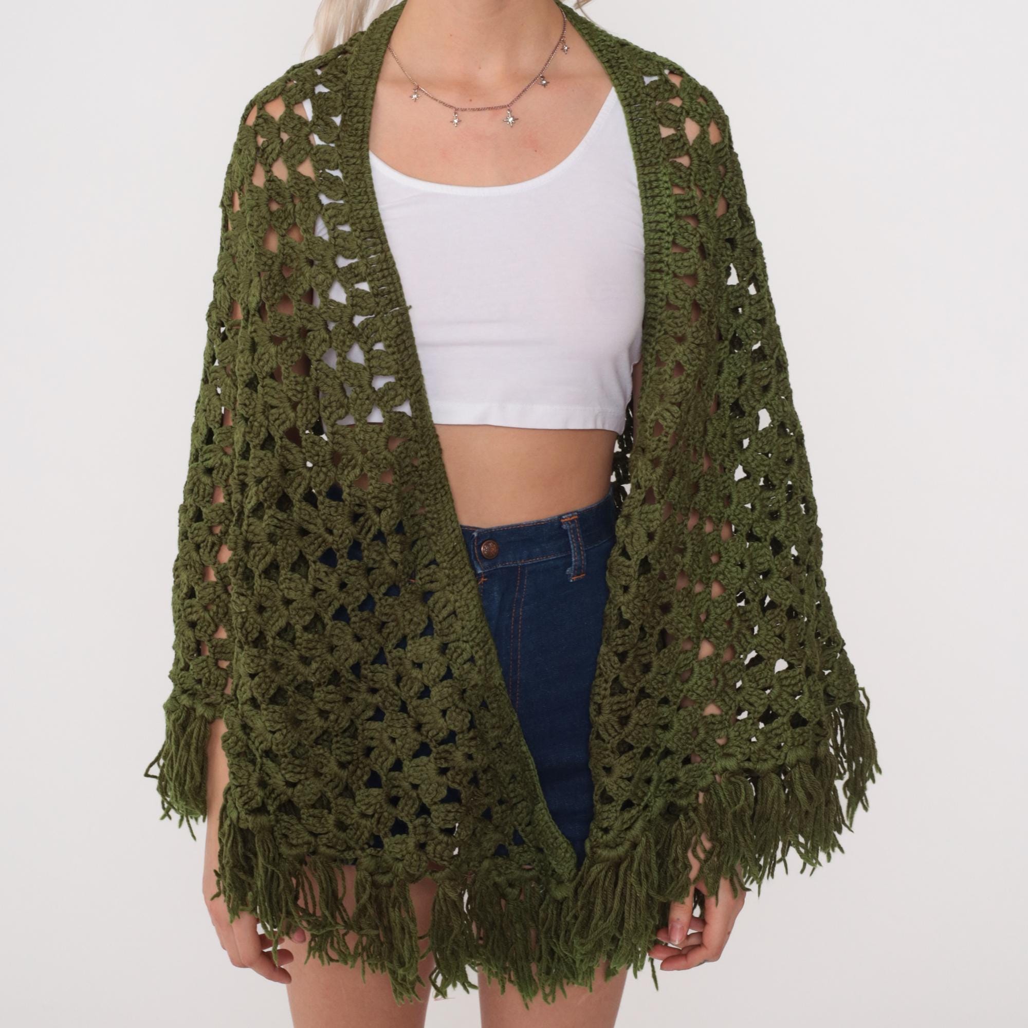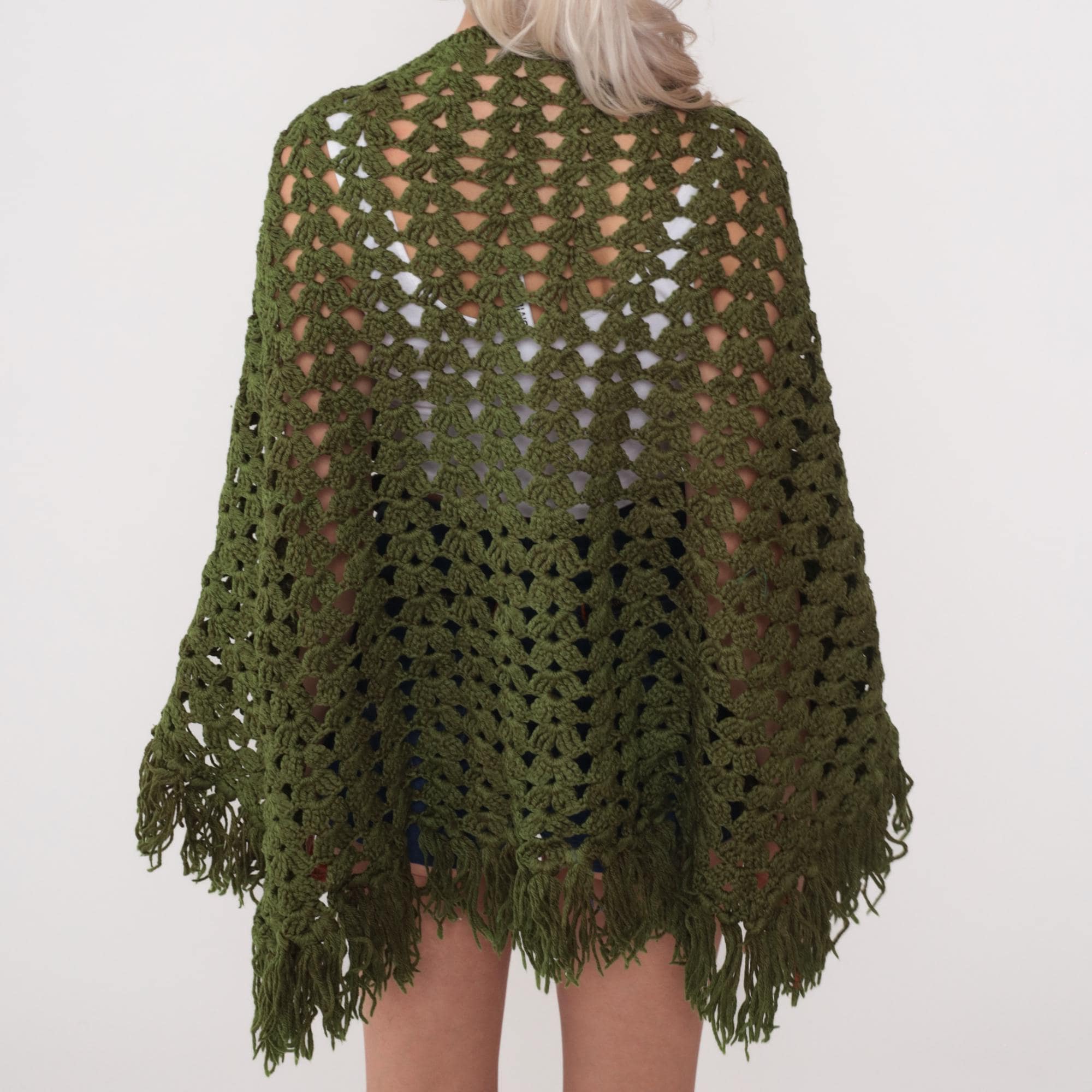 Vintage poncho shawl in olive green crochet with fringe trim. Open fit.