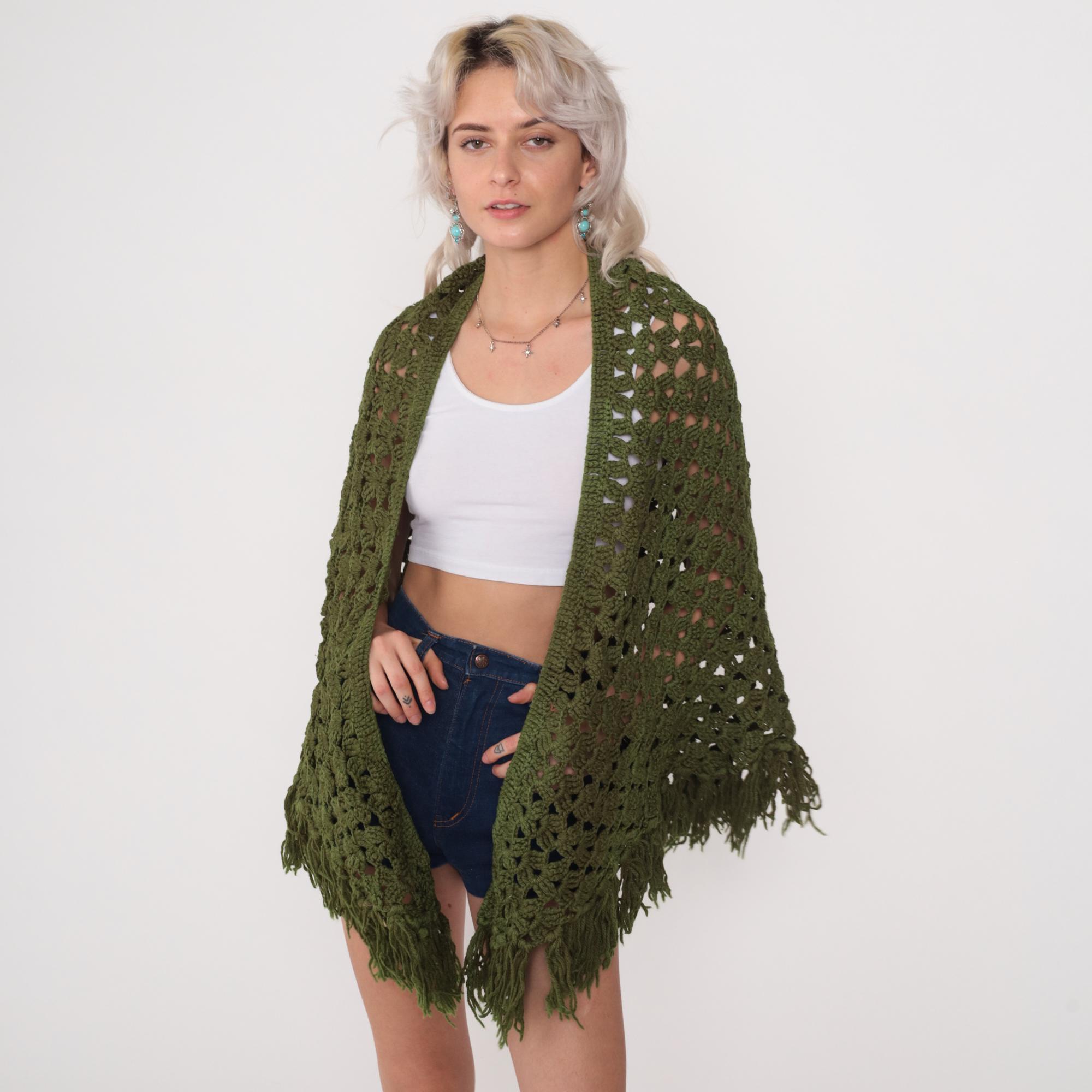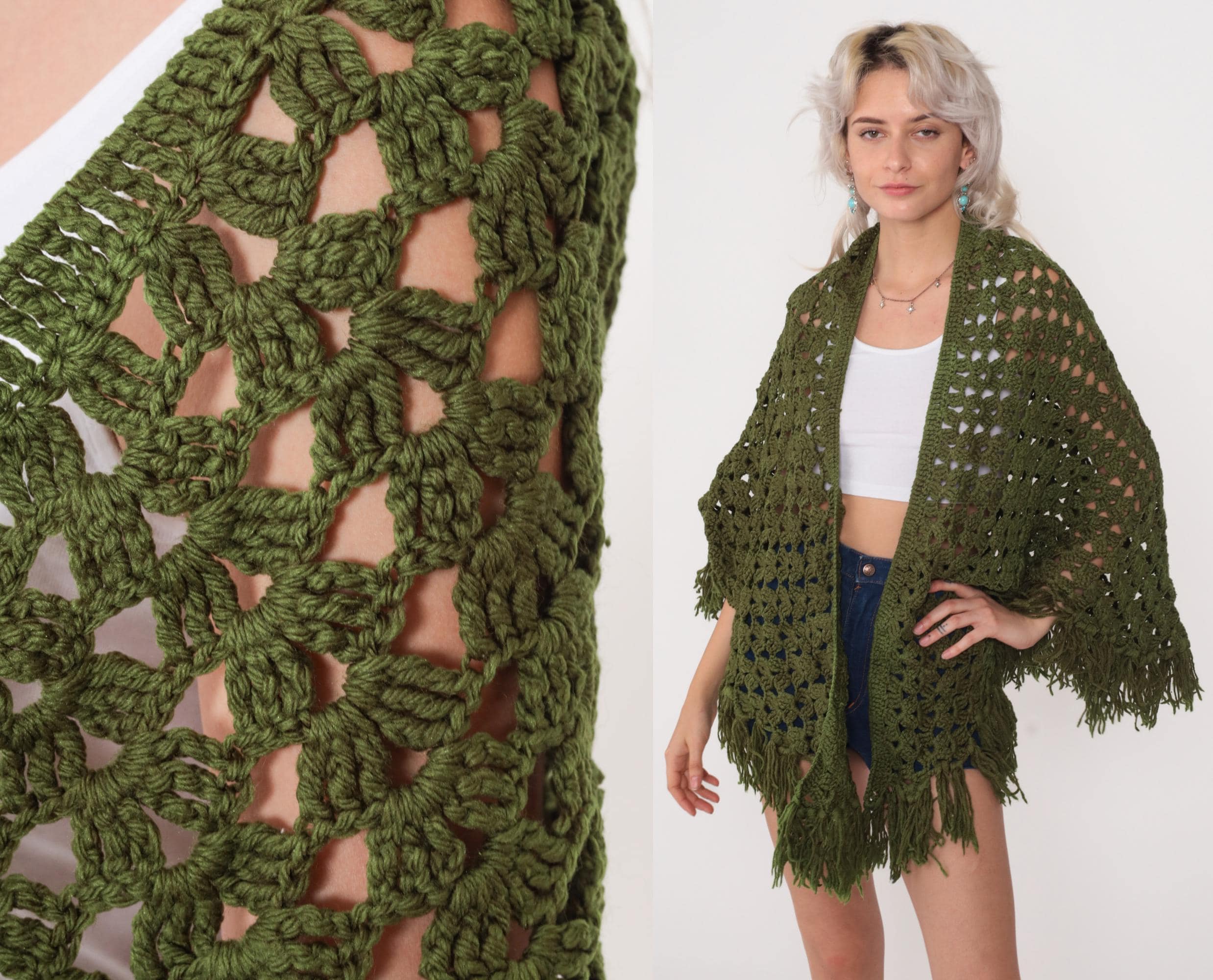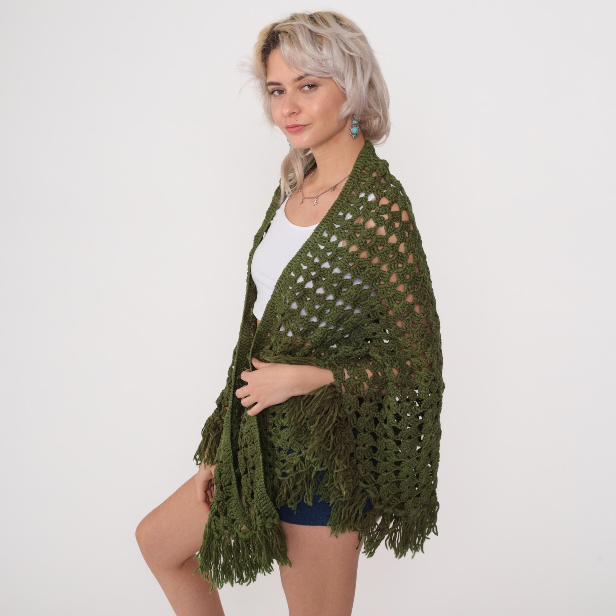 Vintage poncho shawl in olive green crochet with fringe trim. Open fit.