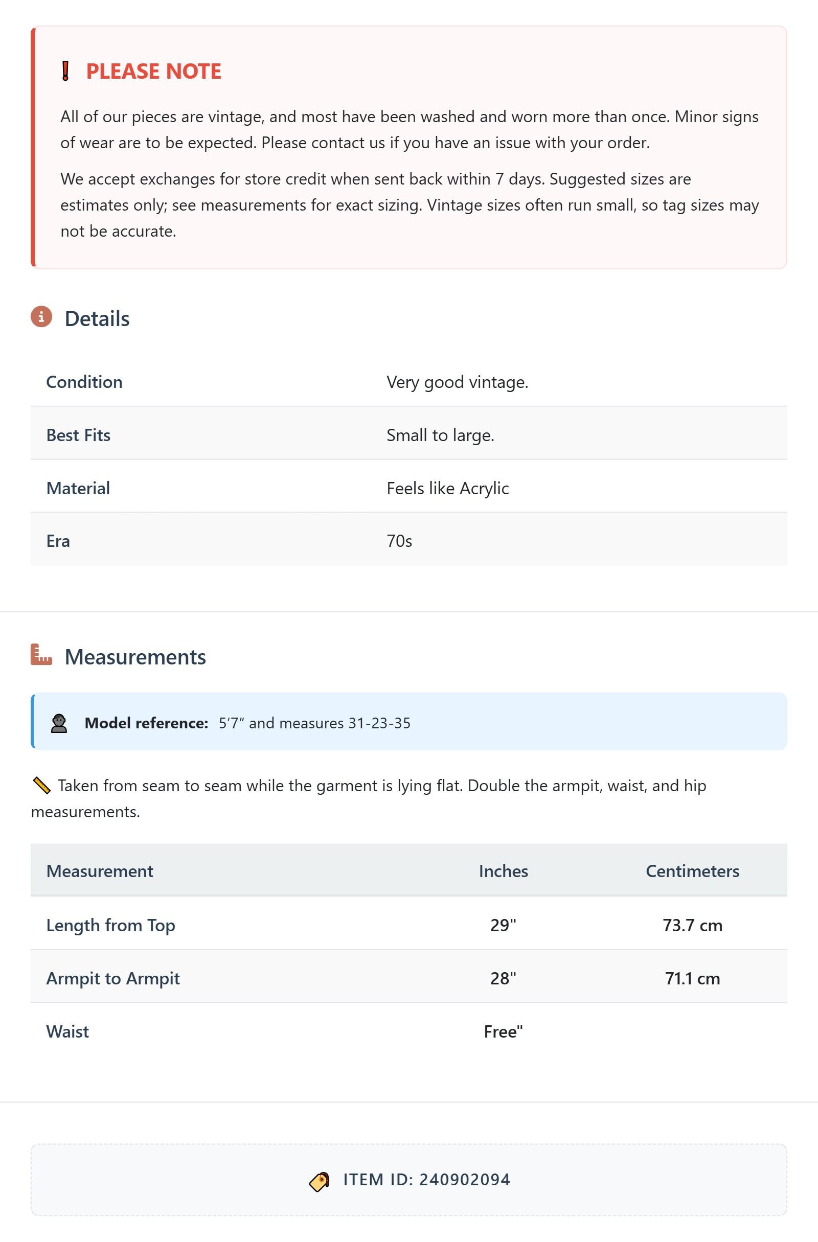 All of our pieces are vintage, and most have been washed and worn more than once. Minor signs of wear are to be expected. Please contact us if you have an issue with your order. We accept exchanges for store credit when sent back within 7 days.