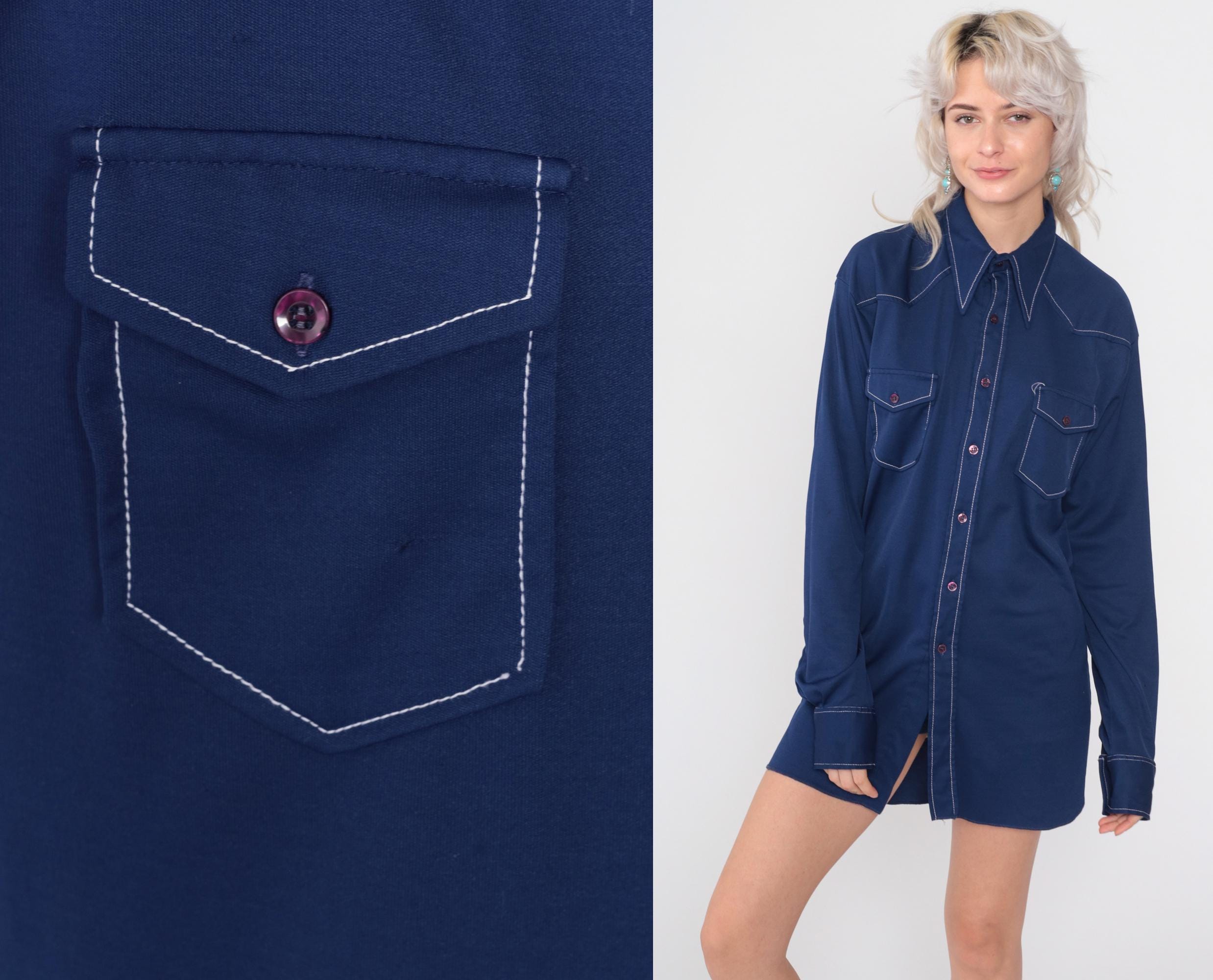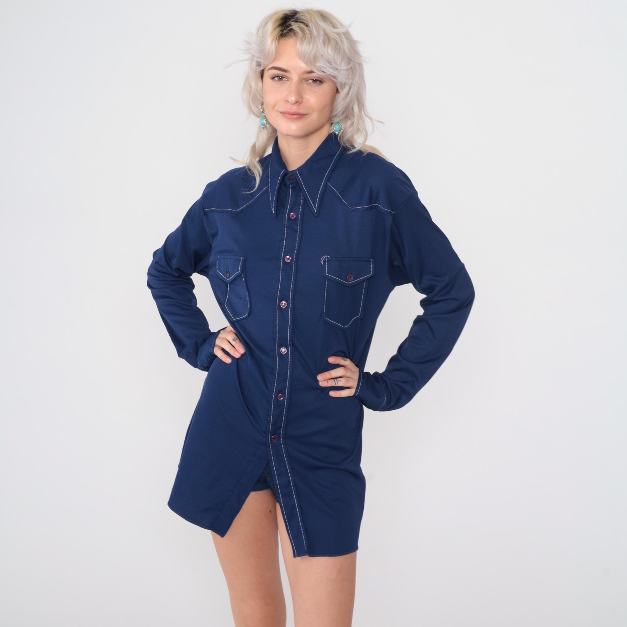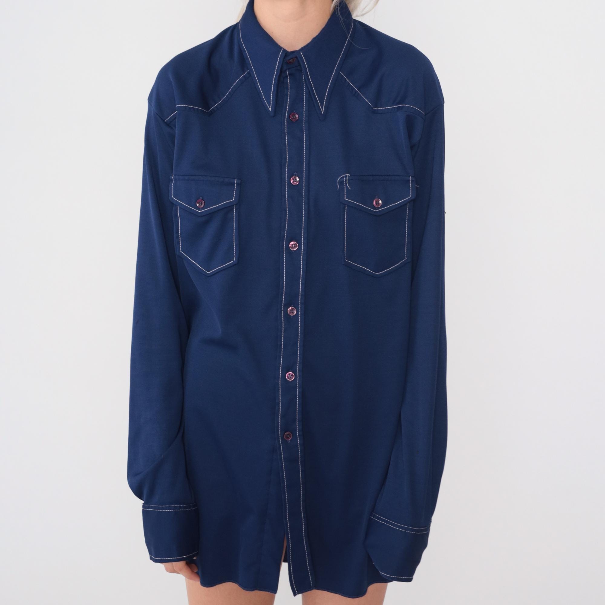 Vintage 70s shirt in navy blue with white topstitching throughout. It has long sleeves, a dagger collar, chest pockets, and buttons up the front. Originally for men.