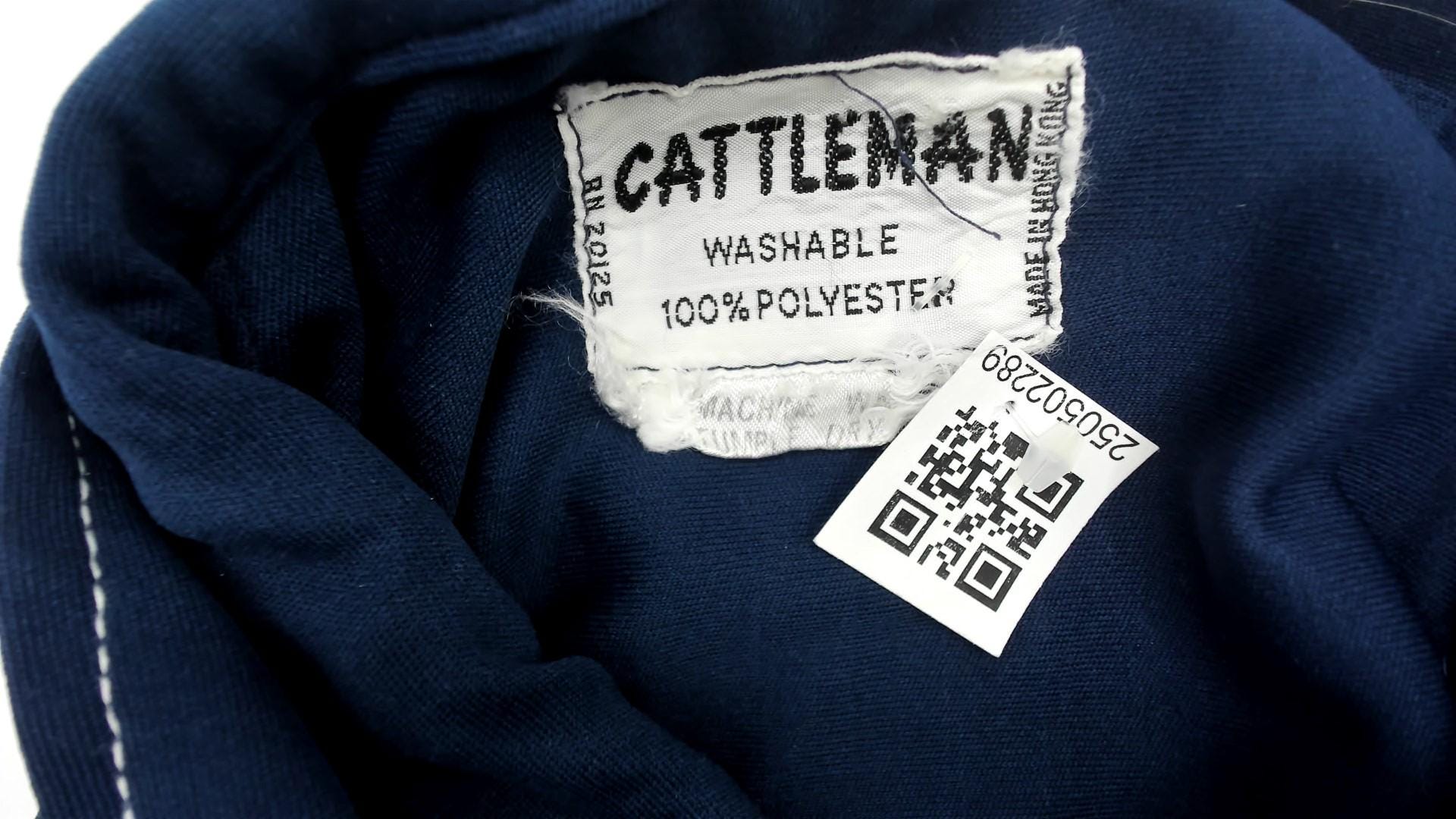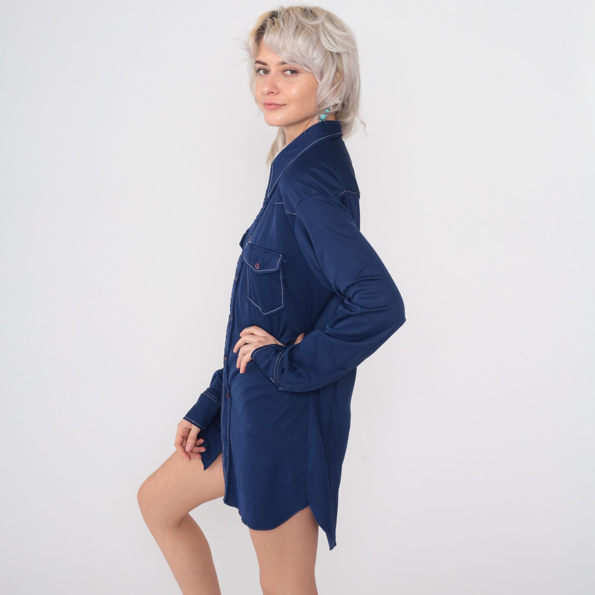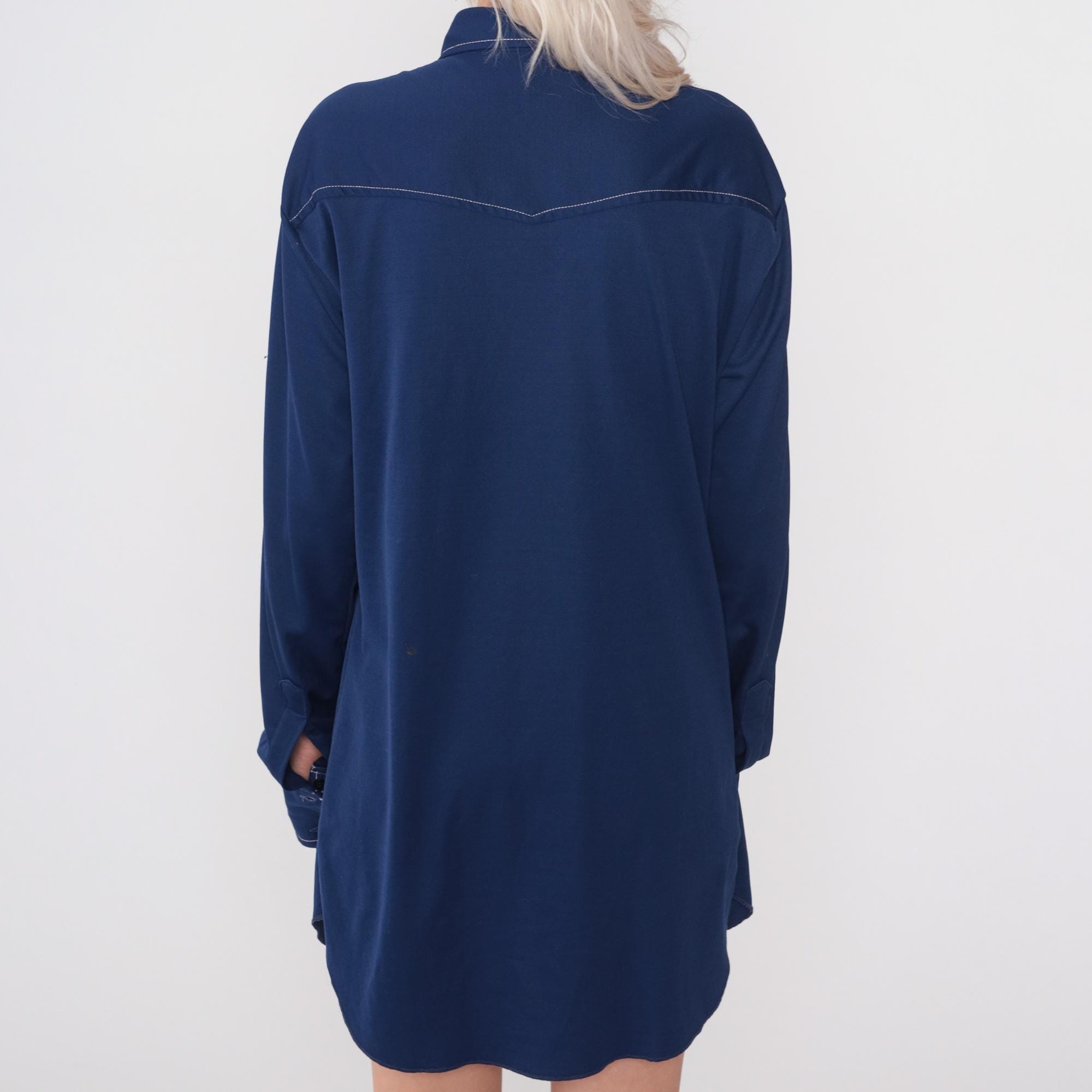 Vintage 70s shirt in navy blue with white topstitching throughout. It has long sleeves, a dagger collar, chest pockets, and buttons up the front. Originally for men.