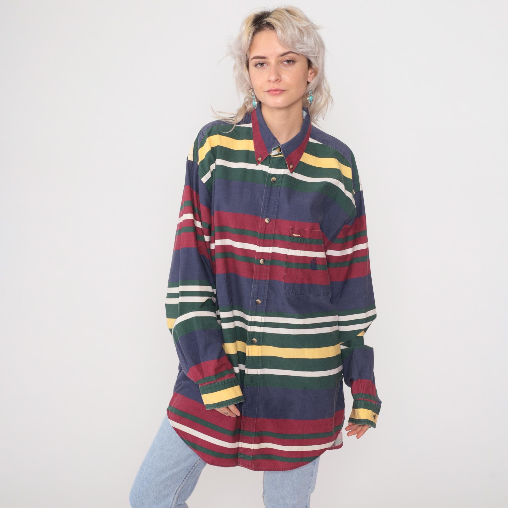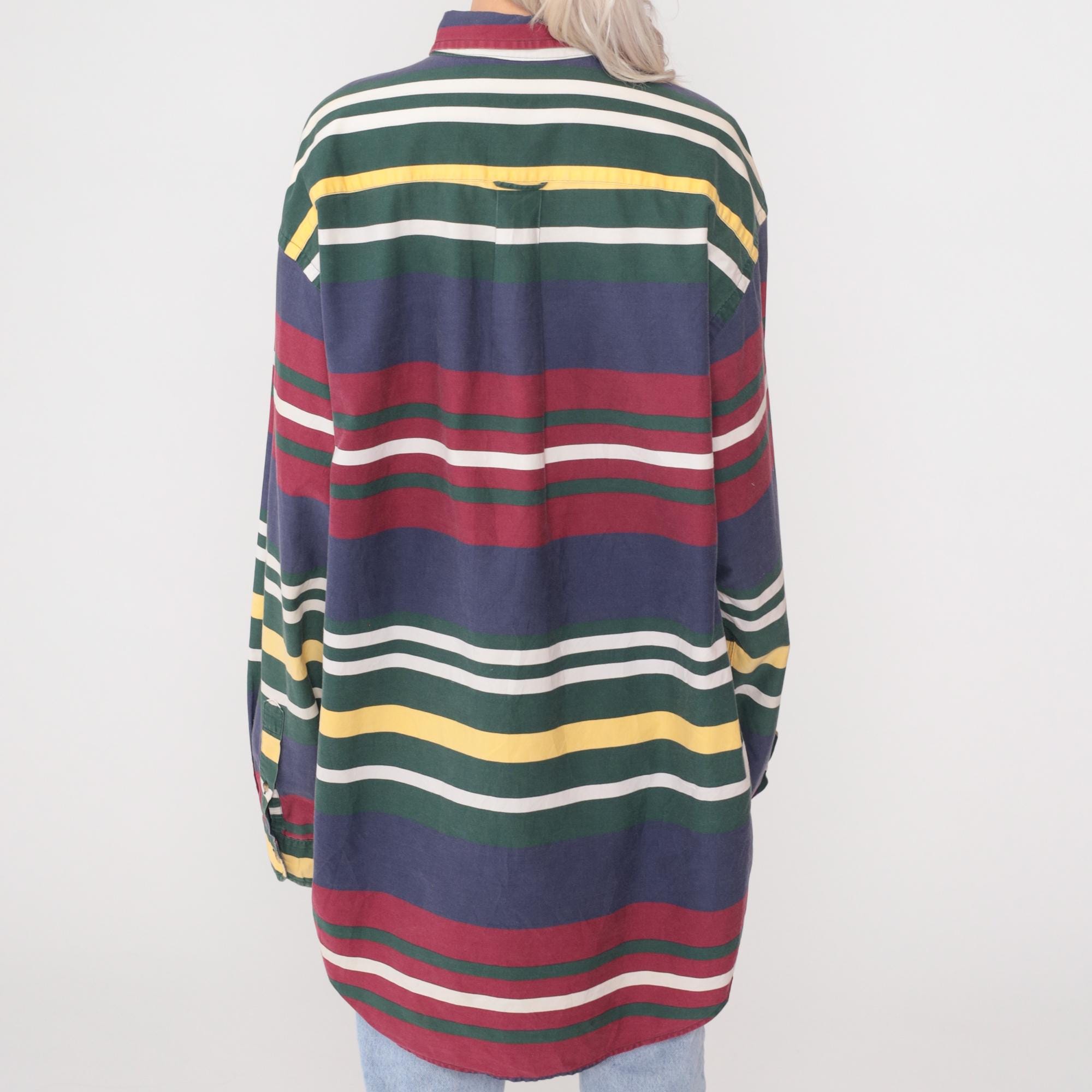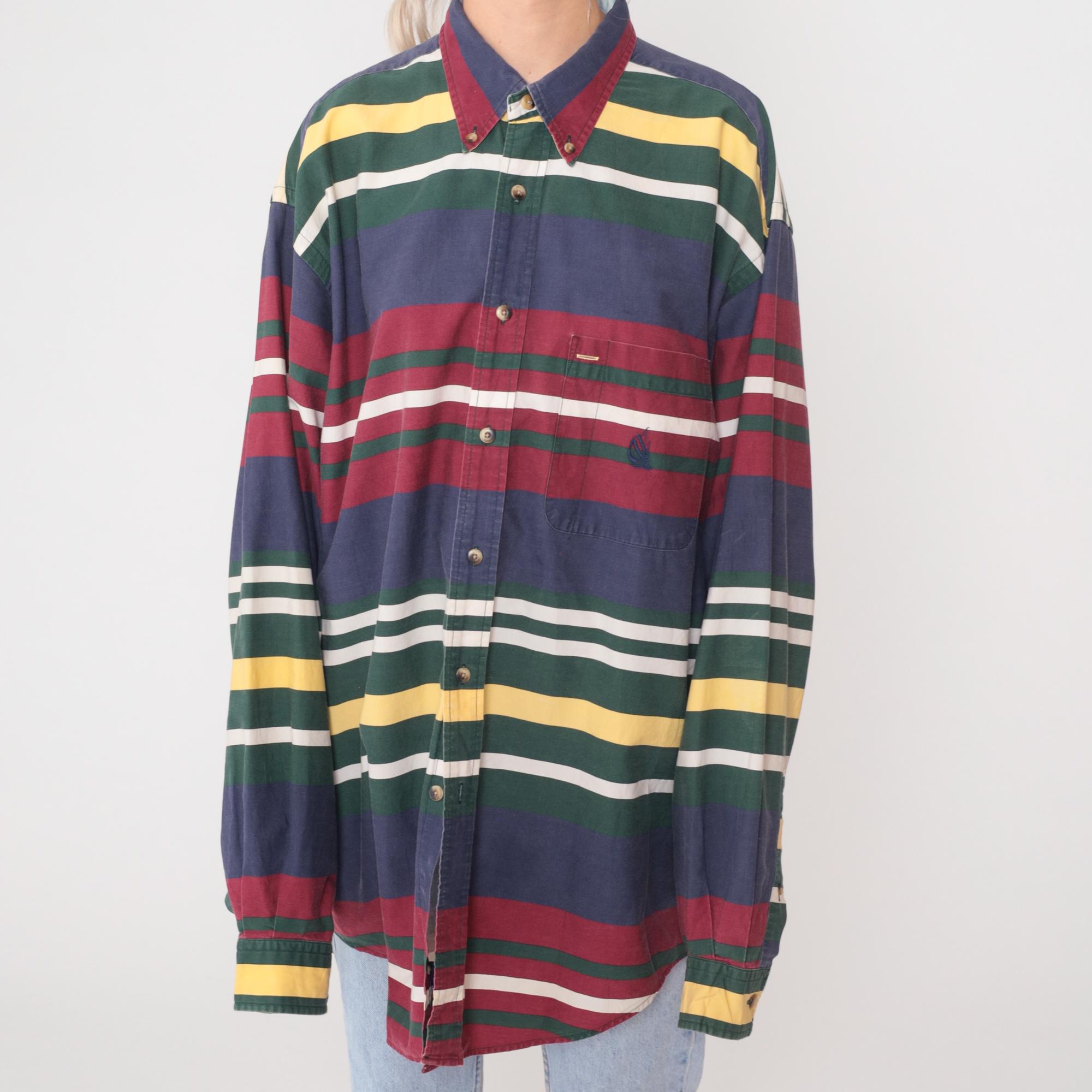 Vintage 90s Nautica button-down shirt featuring bold horizontal stripes in navy blue, burgundy red, forest green, yellow, and white. 100% cotton construction with button-down collar and embroidered sailboat logo on chest pocket.
