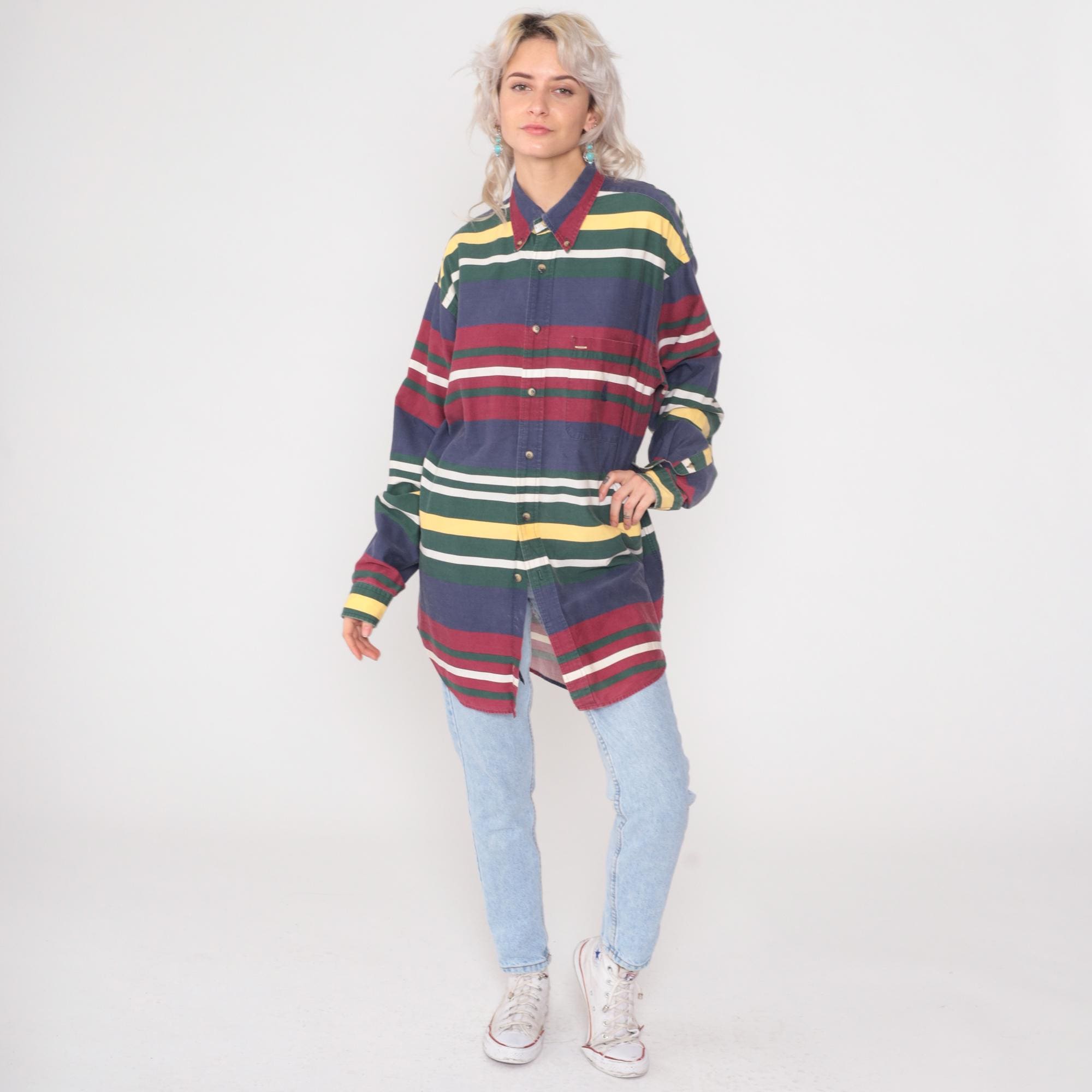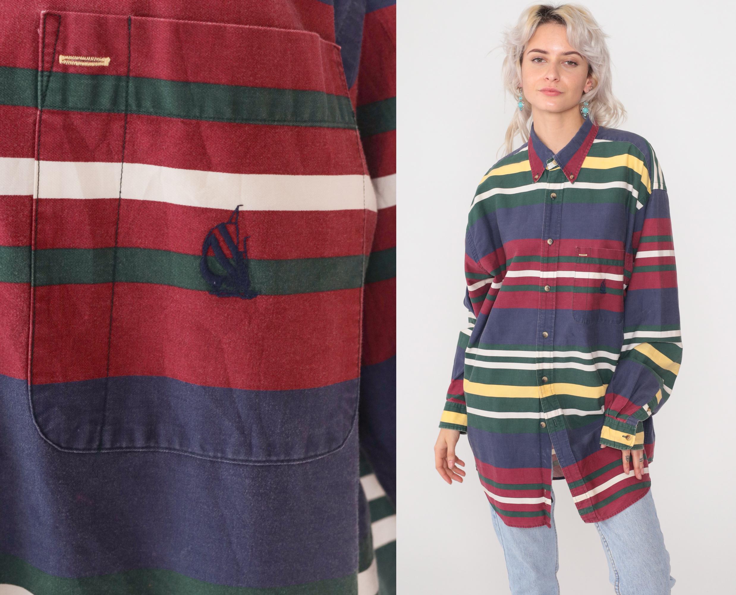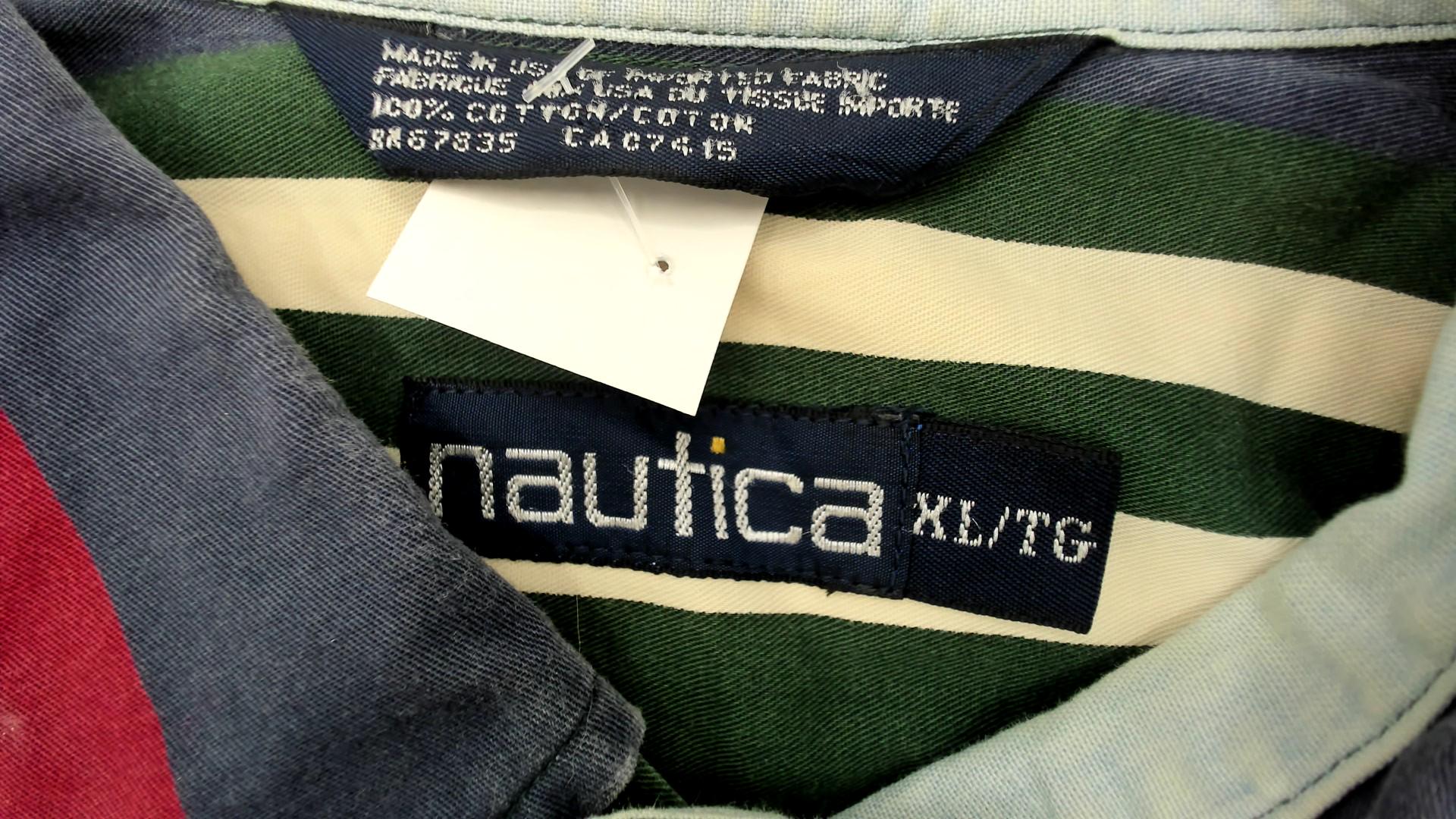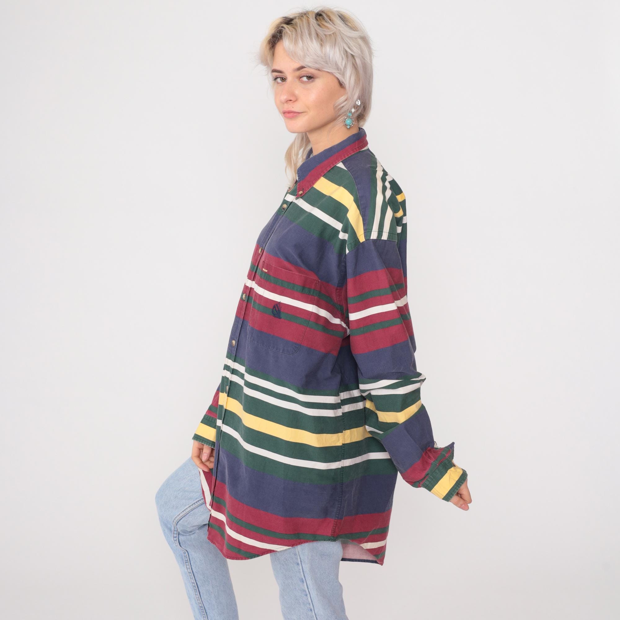 Vintage 90s Nautica button-down shirt featuring bold horizontal stripes in navy blue, burgundy red, forest green, yellow, and white. 100% cotton construction with button-down collar and embroidered sailboat logo on chest pocket.