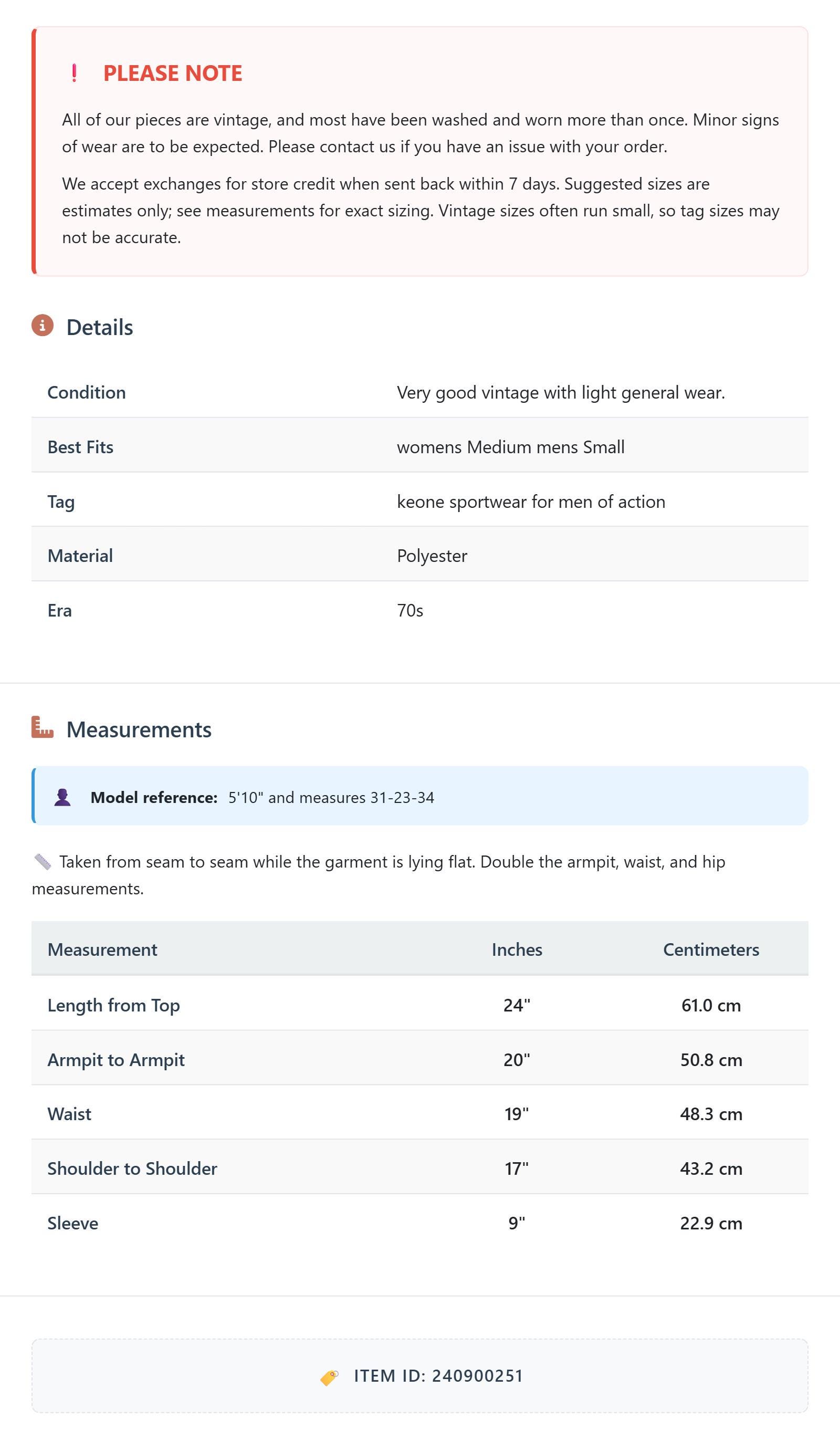 Measurements are taken laying flat and should be doubled where applicable. The "best fits" size is just an estimate, and vintage sizing can vary from modern sizing. Please use measurements to ensure proper fit. The best thing to do is measure a similar item of your own, and compare. When an item has stretch, we will list the unstretched dimensions with the stretched measurement afterwards.