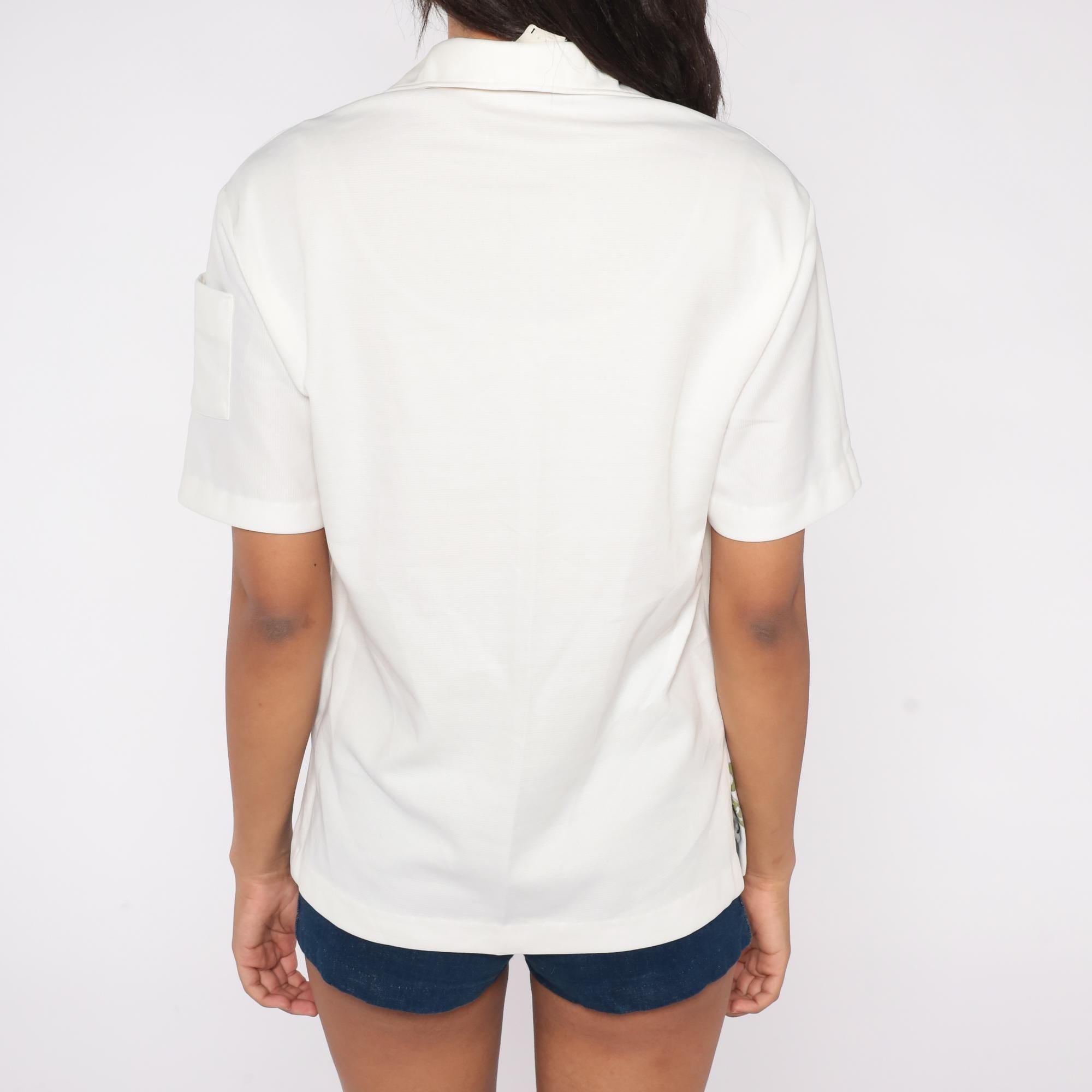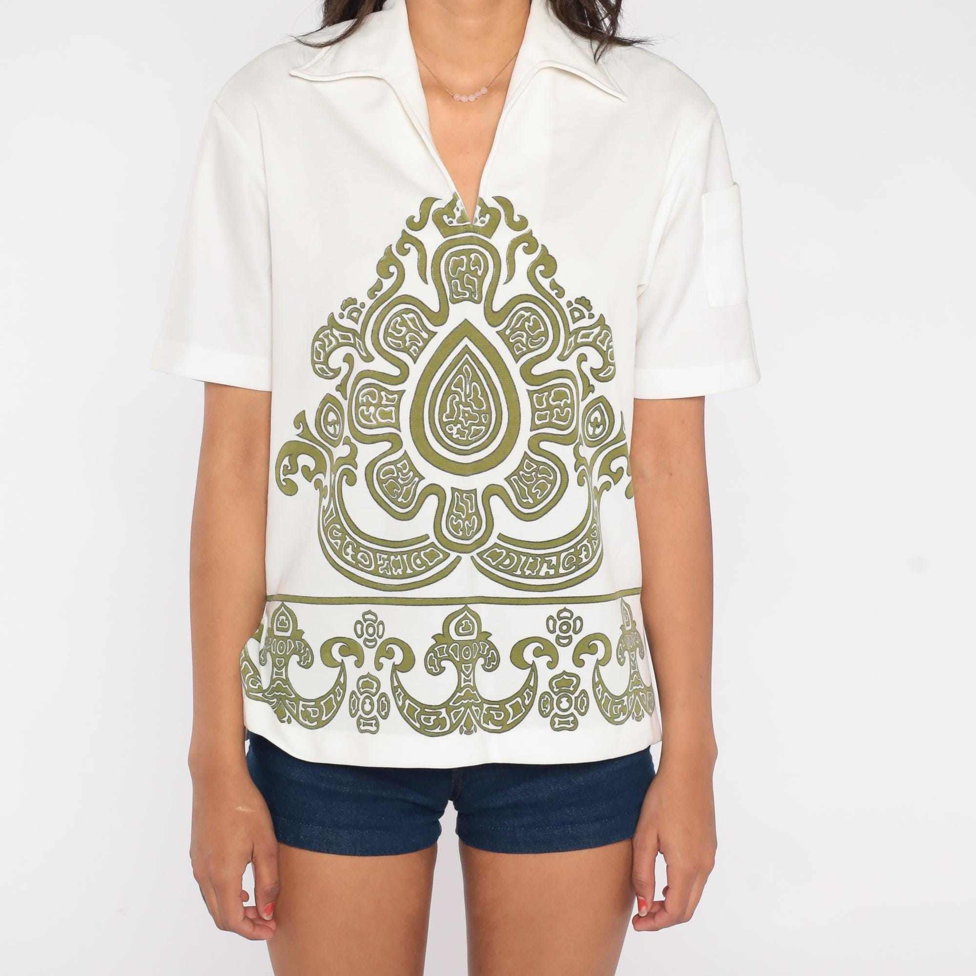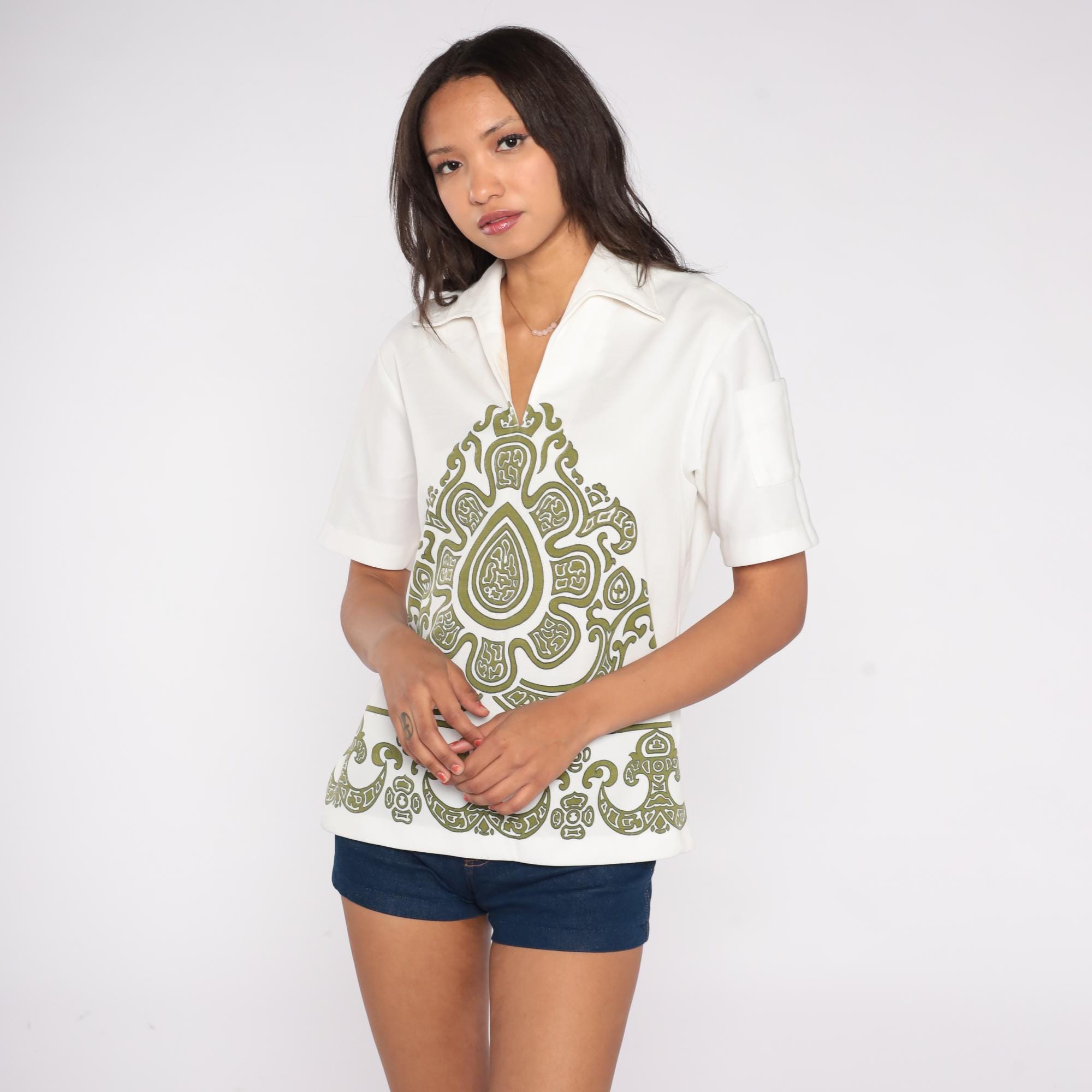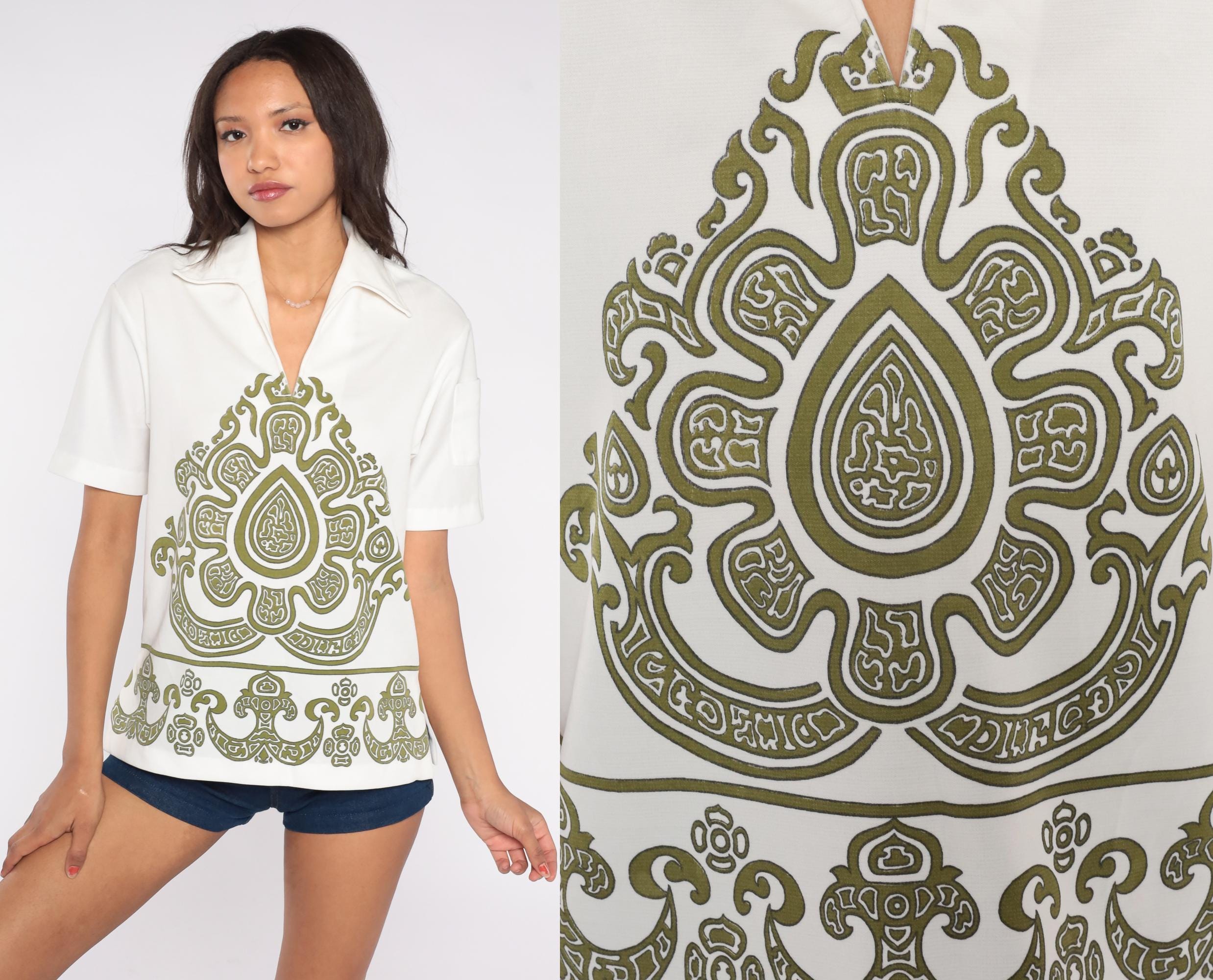 1970's shirt with olive green medallion print from Keone Sportswear. Features a pointed collar, short sleeves, and pull-over design with a V-neck opening. The distinctive print includes large medallion motif on chest and decorative border pattern along the bottom.