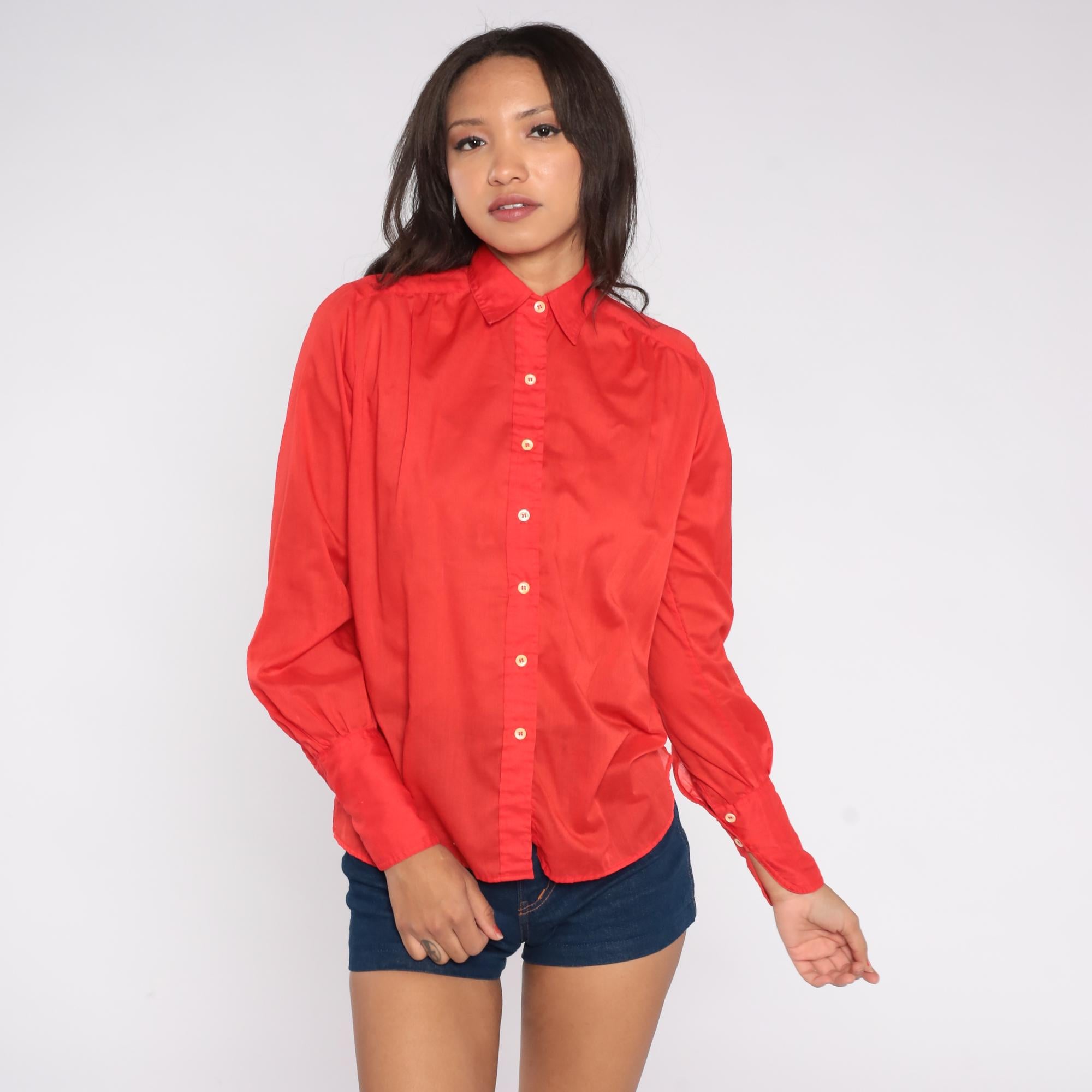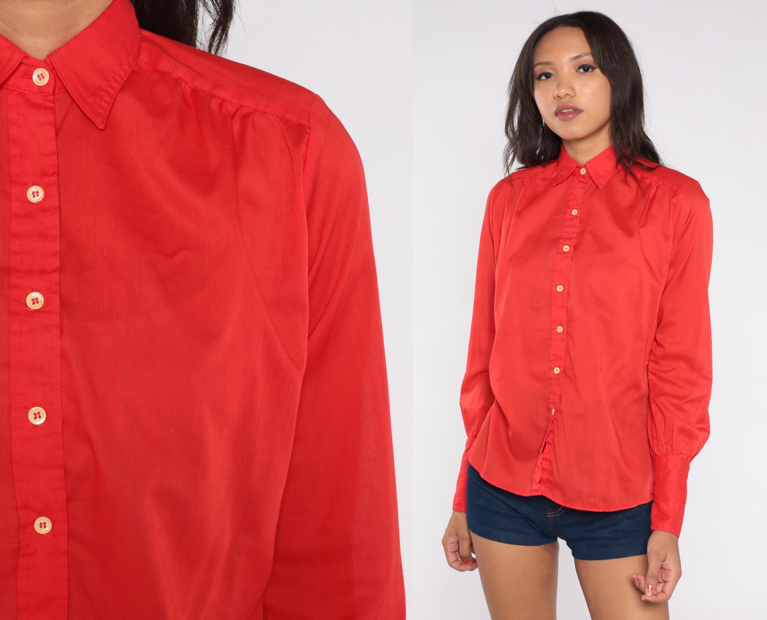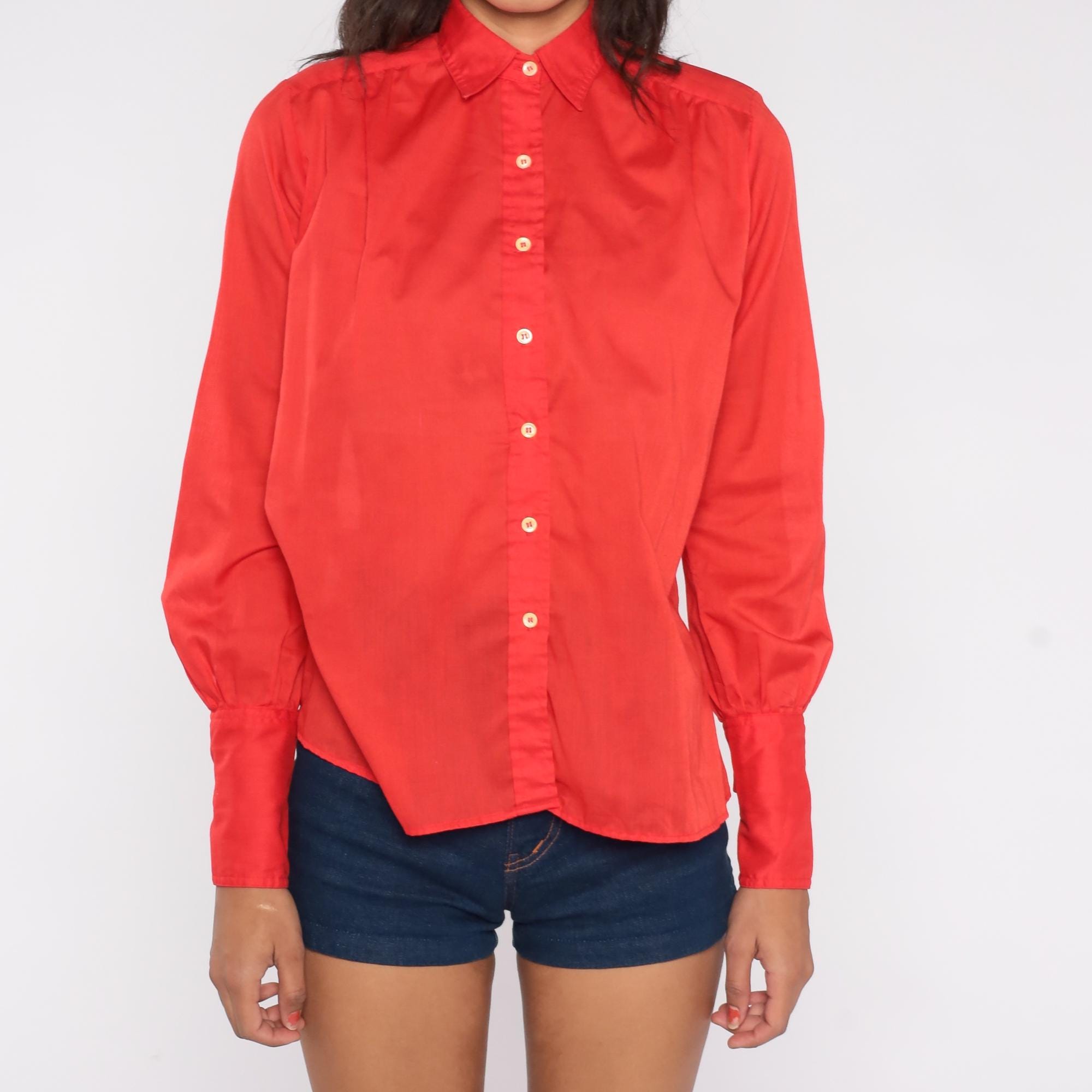 Vibrant cherry red button-up shirt from JH Collectibles, circa 1970s. Features a classic point collar, pearlescent white buttons down the front, and long sleeves with button cuffs.