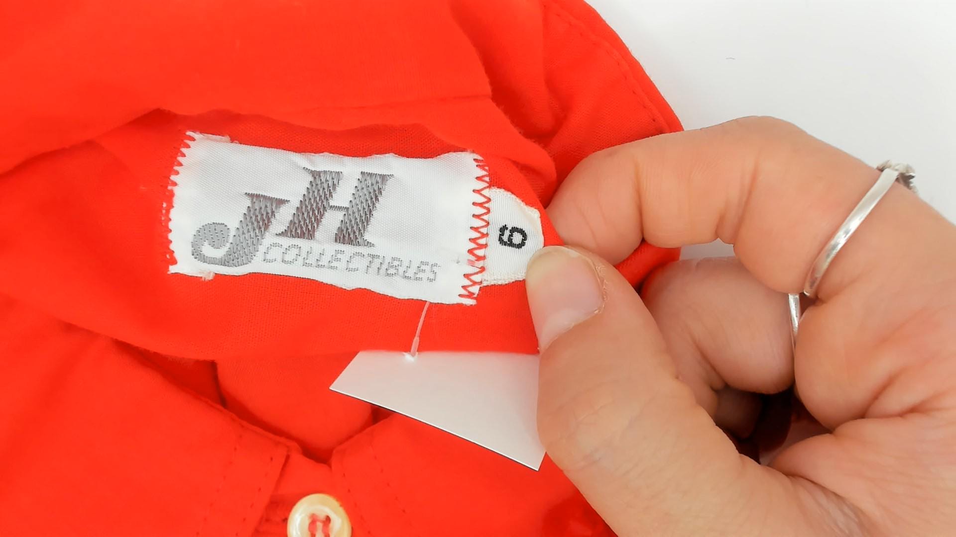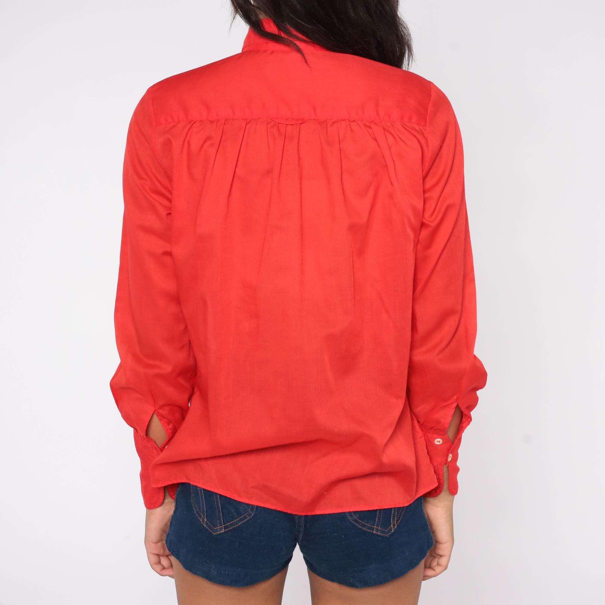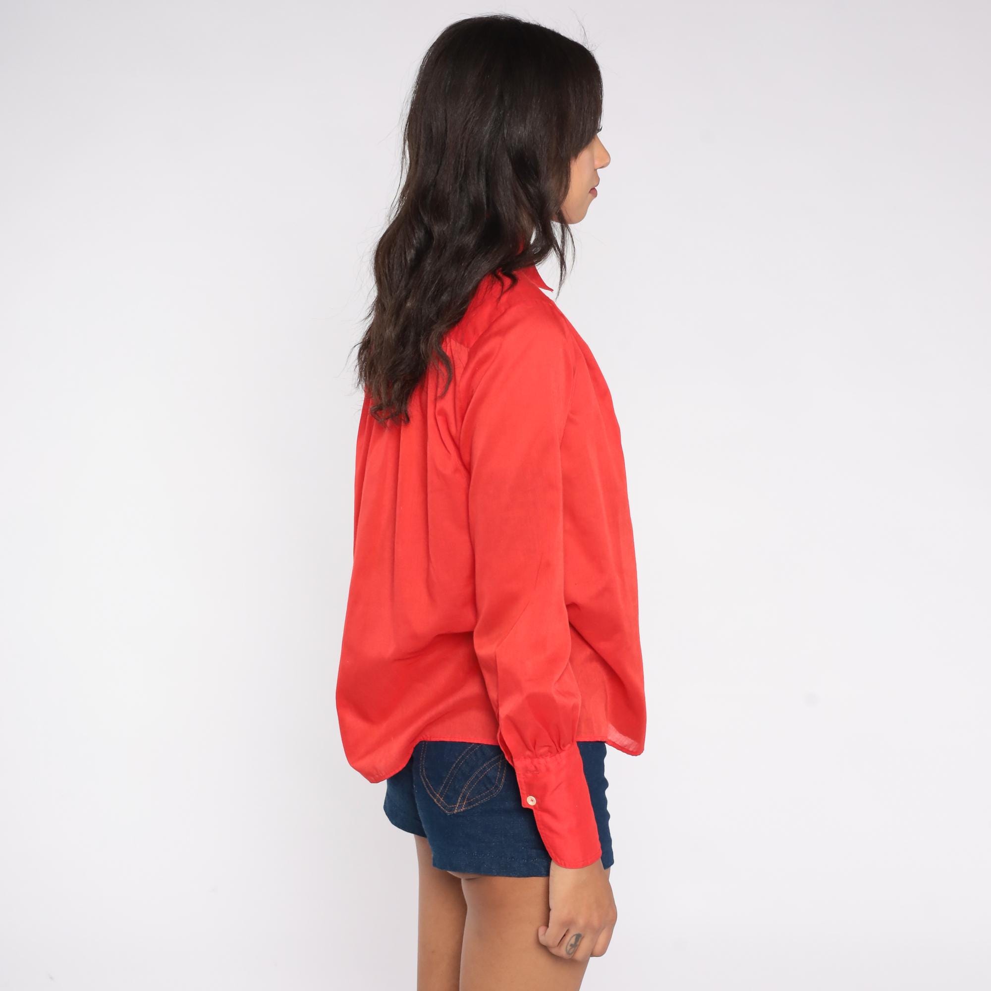 Vibrant cherry red button-up shirt from JH Collectibles, circa 1970s. Features a classic point collar, pearlescent white buttons down the front, and long sleeves with button cuffs.