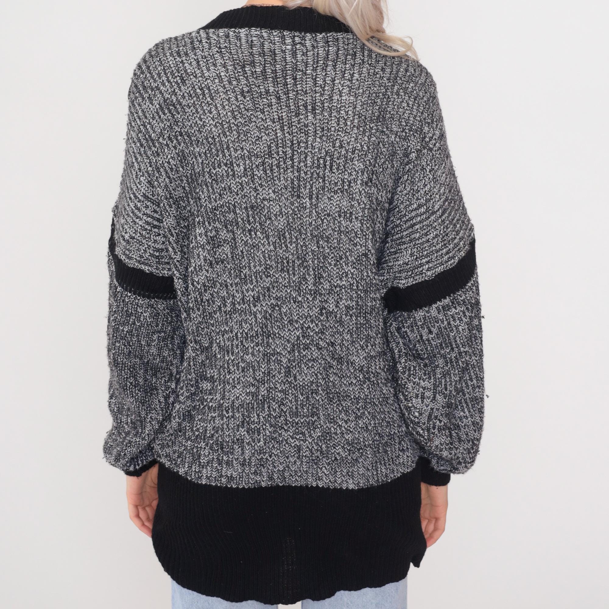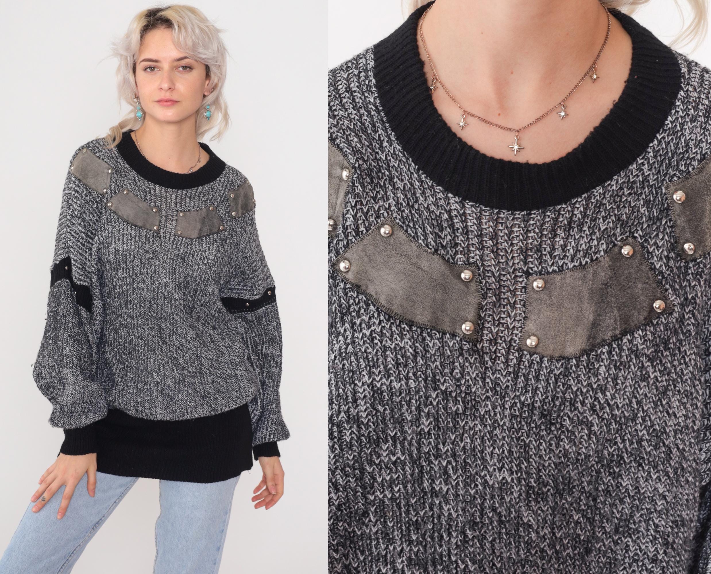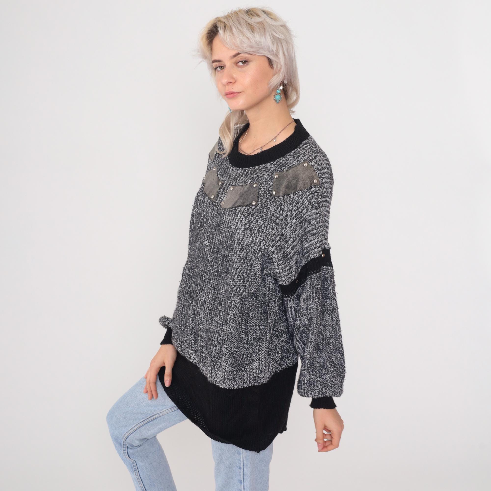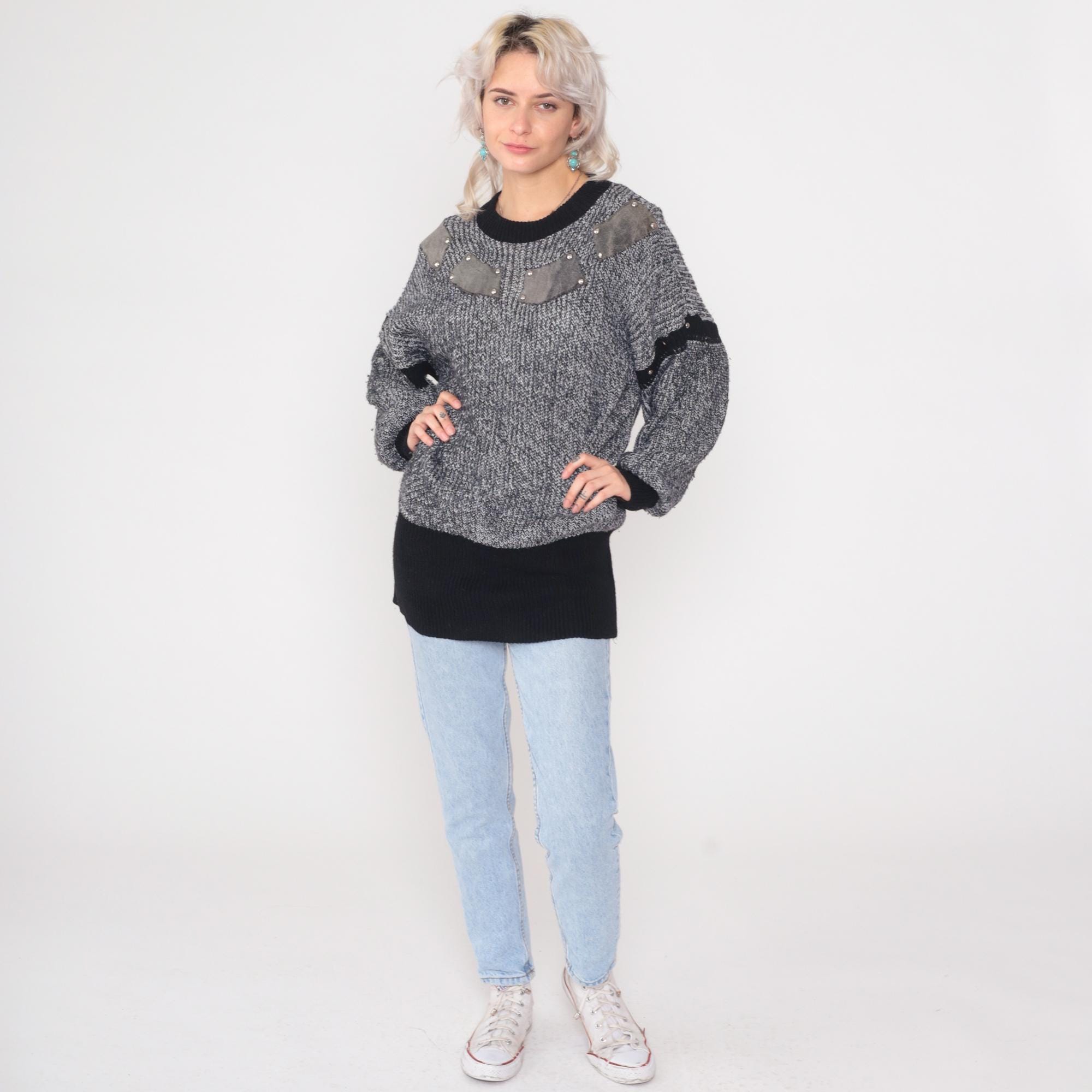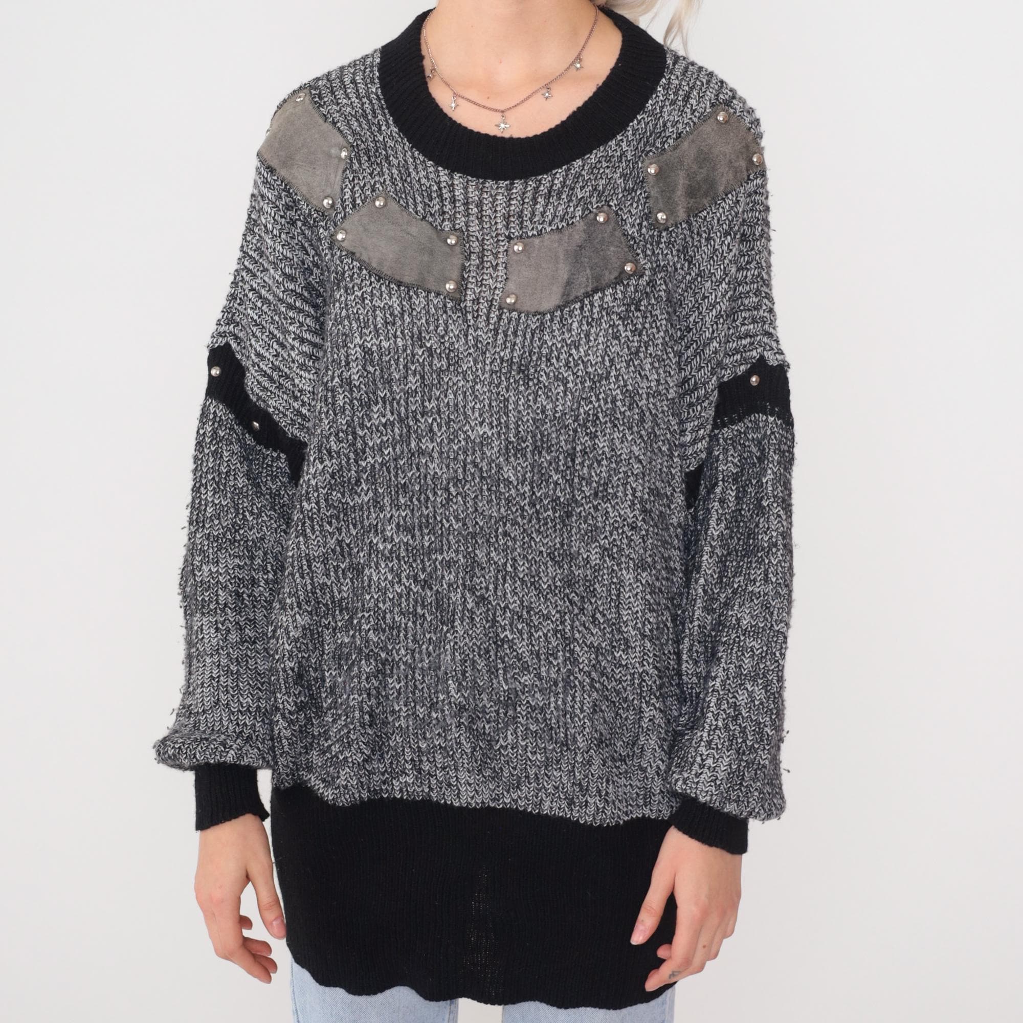 Gray and white marled chunky knit sweater from the 1980s with gray suede patches outlined in silver pyramid studs on chest and upper sleeves. Features black contrast trim on crew neck collar, cuffs, sleeve stripes, and hem. Oversized slouchy fit with drop shoulders and longline tunic length.